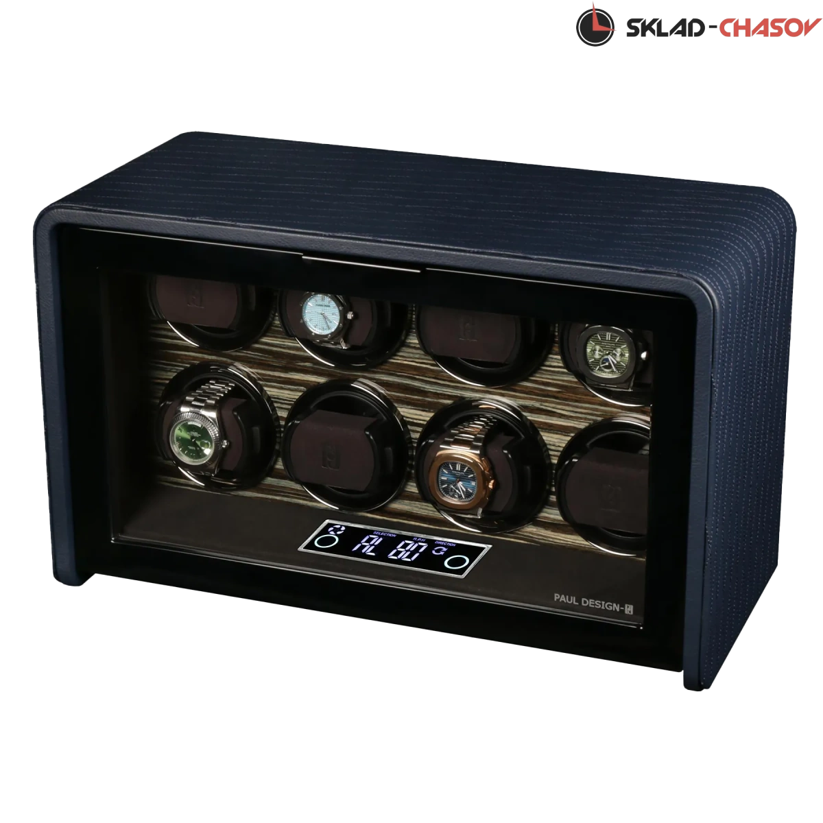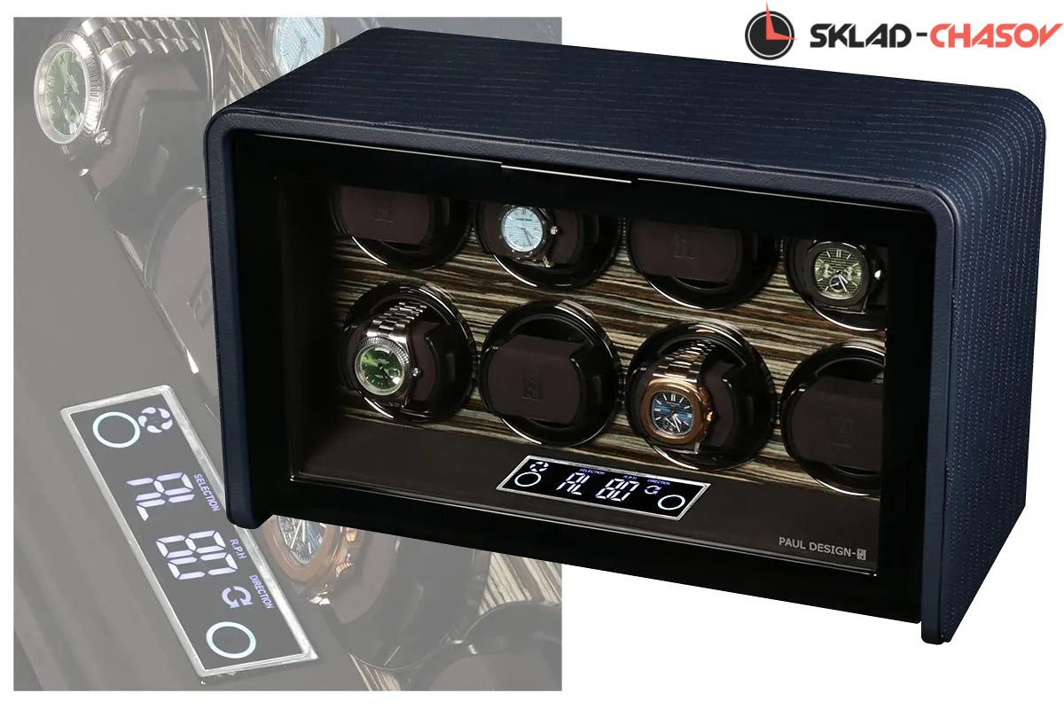Элегантная шкатулка для автоподзавода 8-ми часов Classic 8 LBUD от Paul Design сочетает классический дизайн и современные технологии. Корпус выполнен из дерева и обтянут синей кожей с изящной декоративной прострочкой. Интерьер отделан мягкой микрофиброй графитового цвета и украшен вставкой из редкого дерева зембрано.