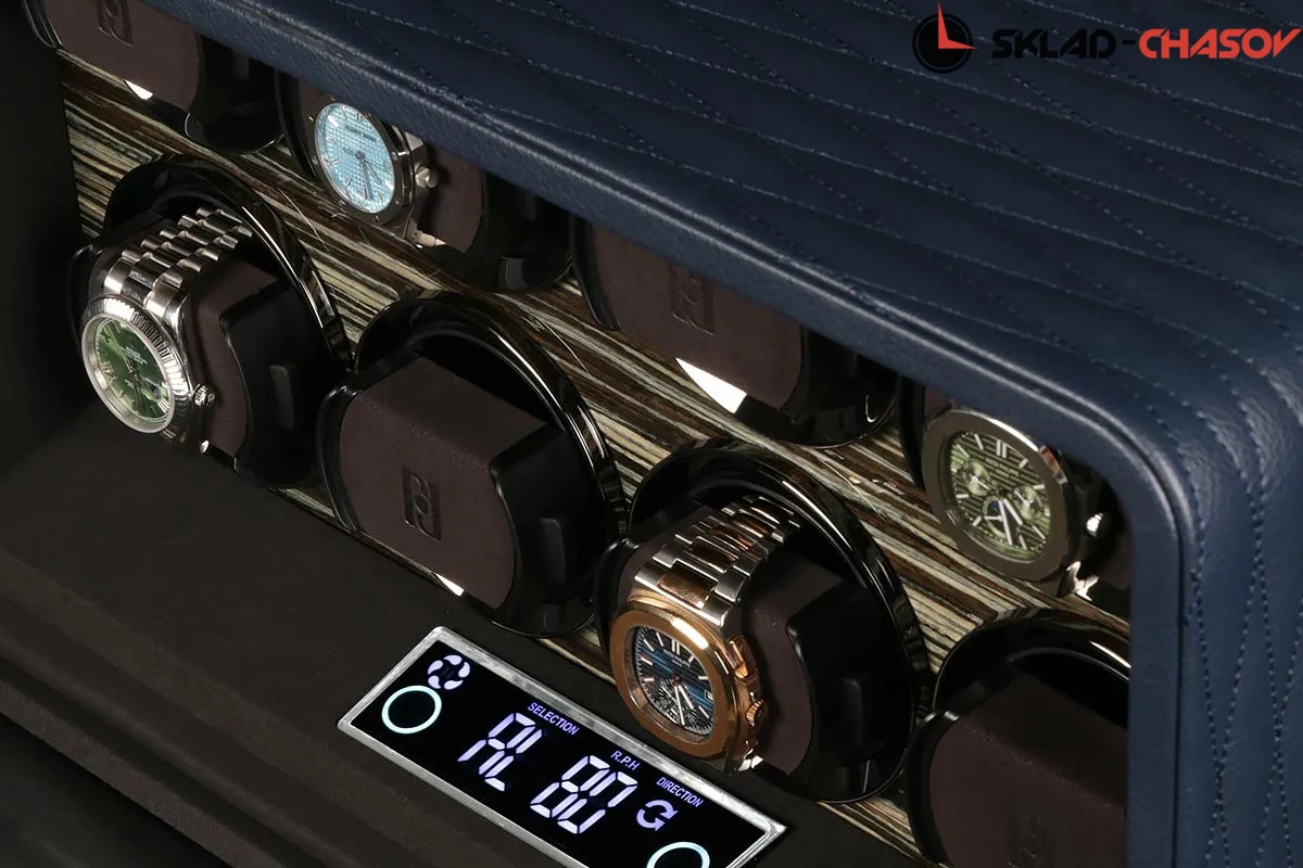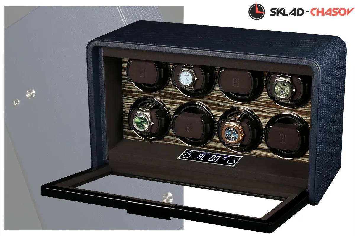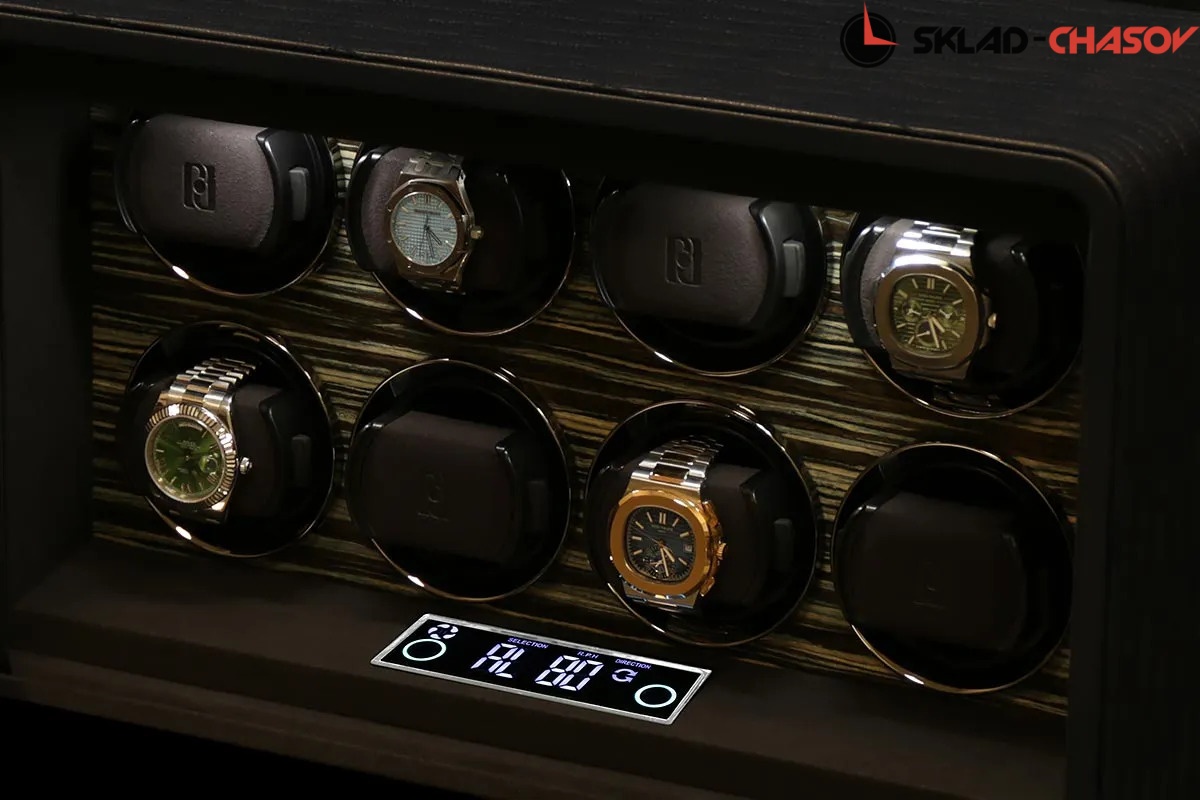 Модель оснащена системой автоподзавода для 8-ми часов с возможностью индивидуальной настройки направления и количества оборотов каждой ячейки при помощи электронного LCD-дисплея. Диапазон от 480 до 1950 оборотов в сутки обеспечивает оптимальный уход за часами любого класса. Телескопические держатели подходят для браслетов и ремешков любых размеров, а бесшумные моторы делают эксплуатацию максимально комфортной.