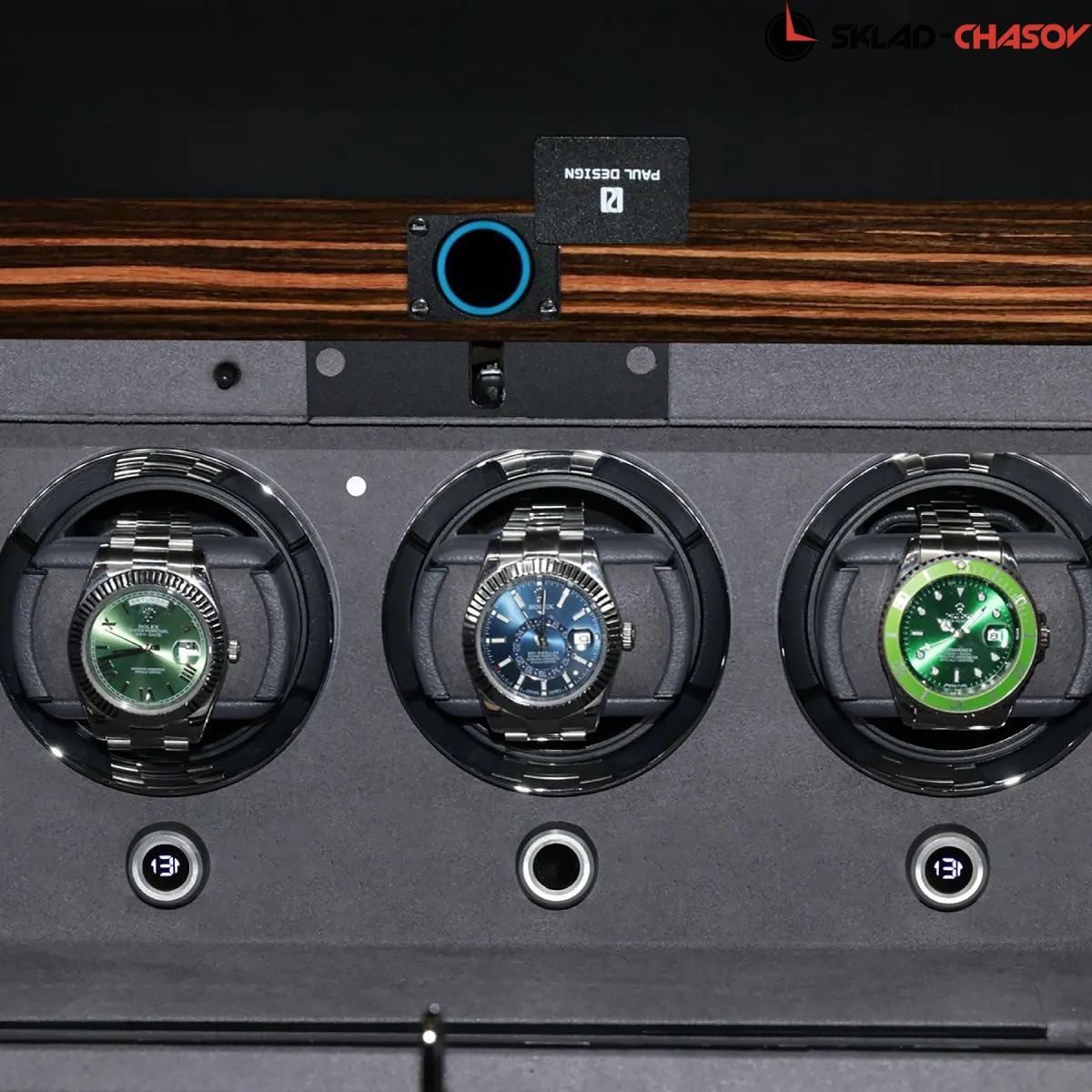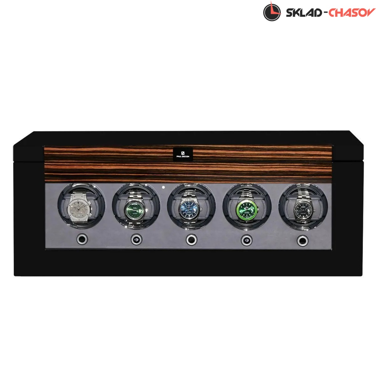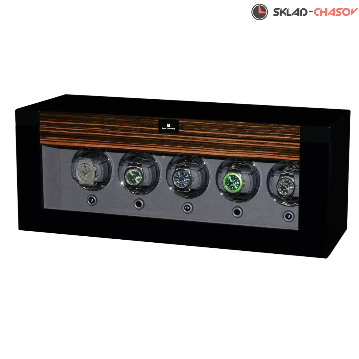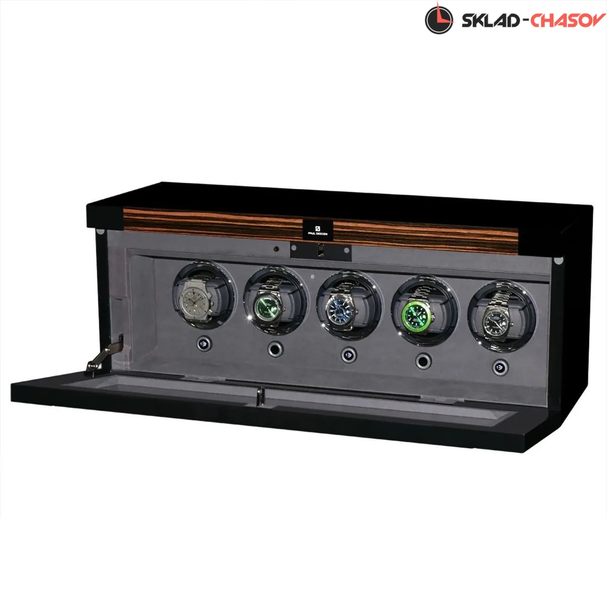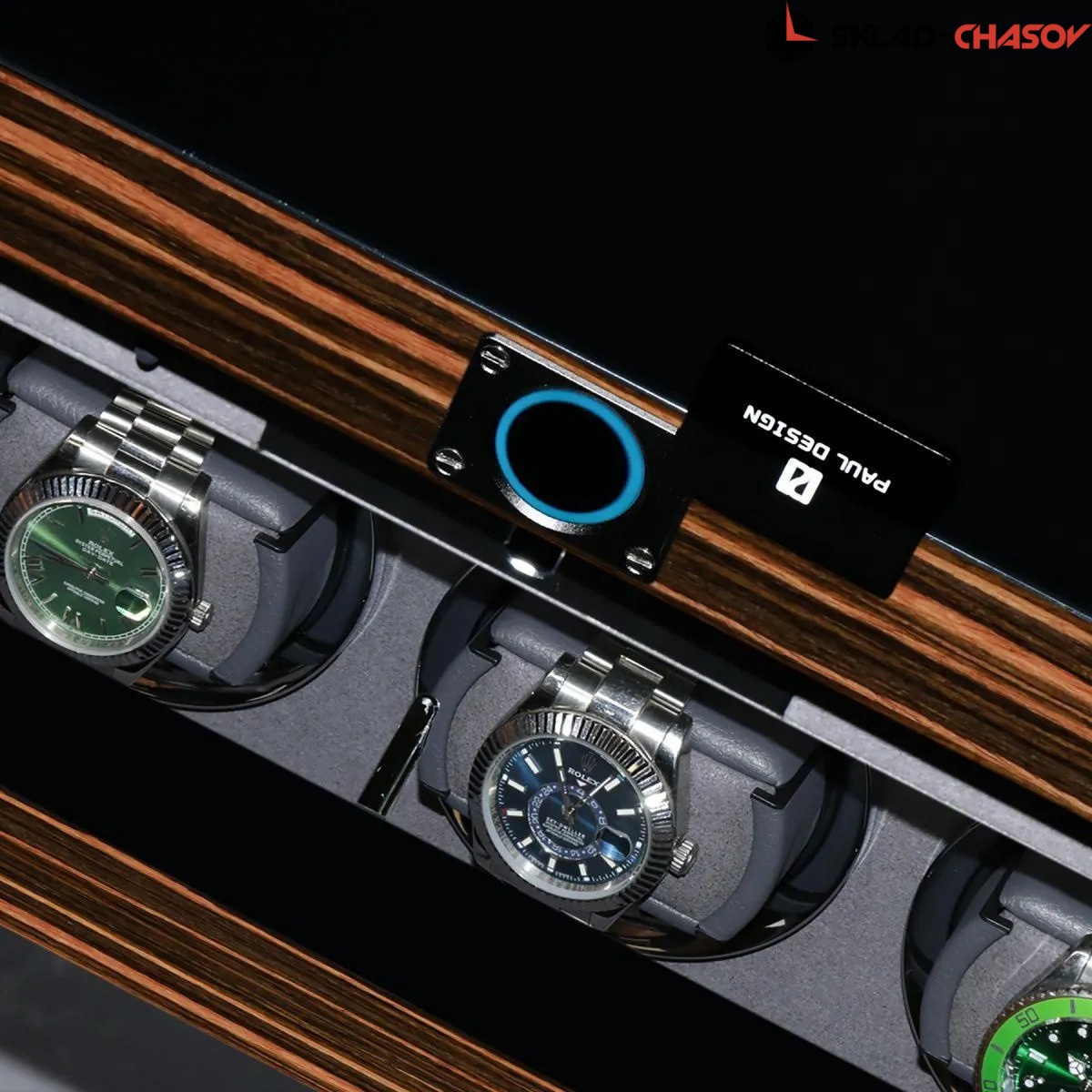 Дизайн выполнен в современном минималистичном стиле: строгие линии, технологичные материалы и сдержанная цветовая гамма подчёркивают премиальный характер. Экстерьер выполнен из темного дерева со вставками из дерева макассар, и покрыт рояльным лаком насыщенного, в несколько слоев, создающий благородный глянец. В интерьере используется мягкий бархат в едином гармоничном цветовом решении, а серебристые безеля элегантно обрамляют ячейки автоподзавода. Светодиодная подсветка при открытии дверцы подчёркивает красоту коллекции.