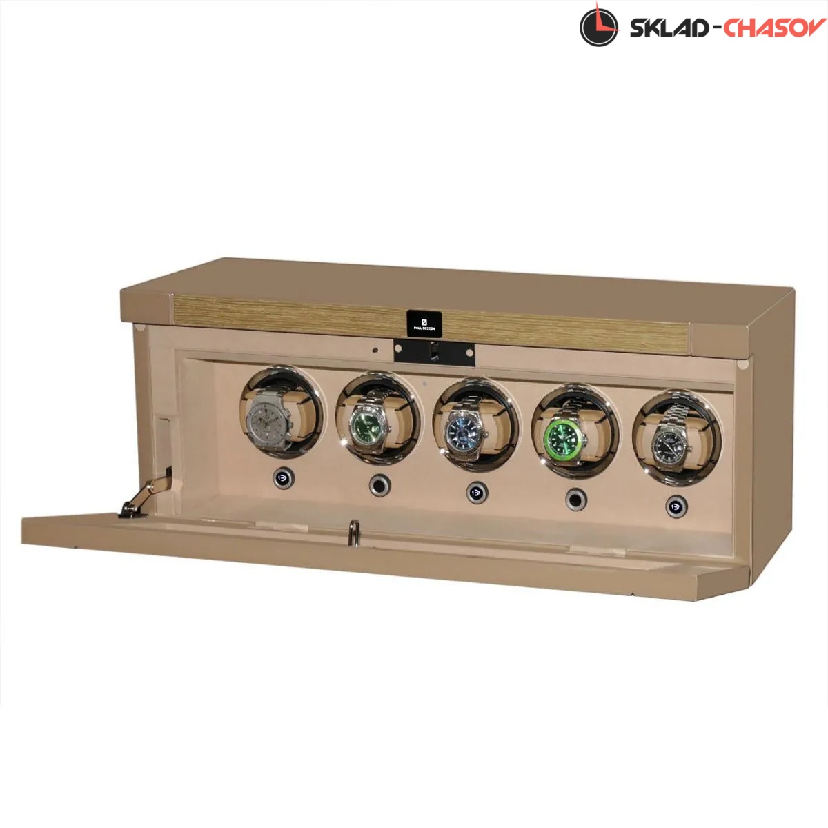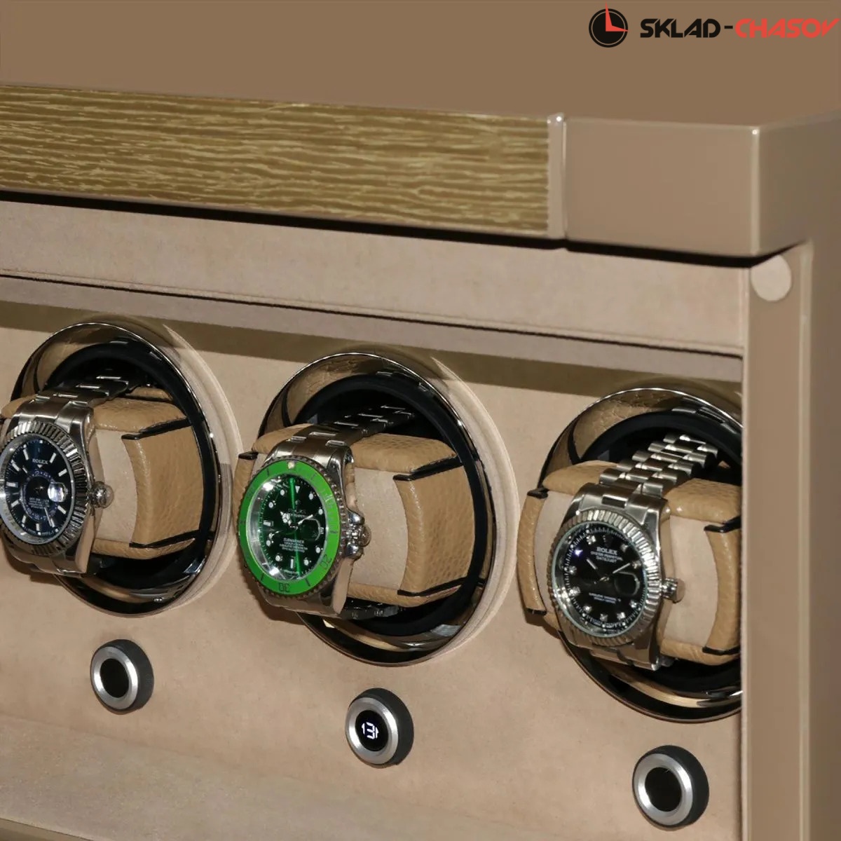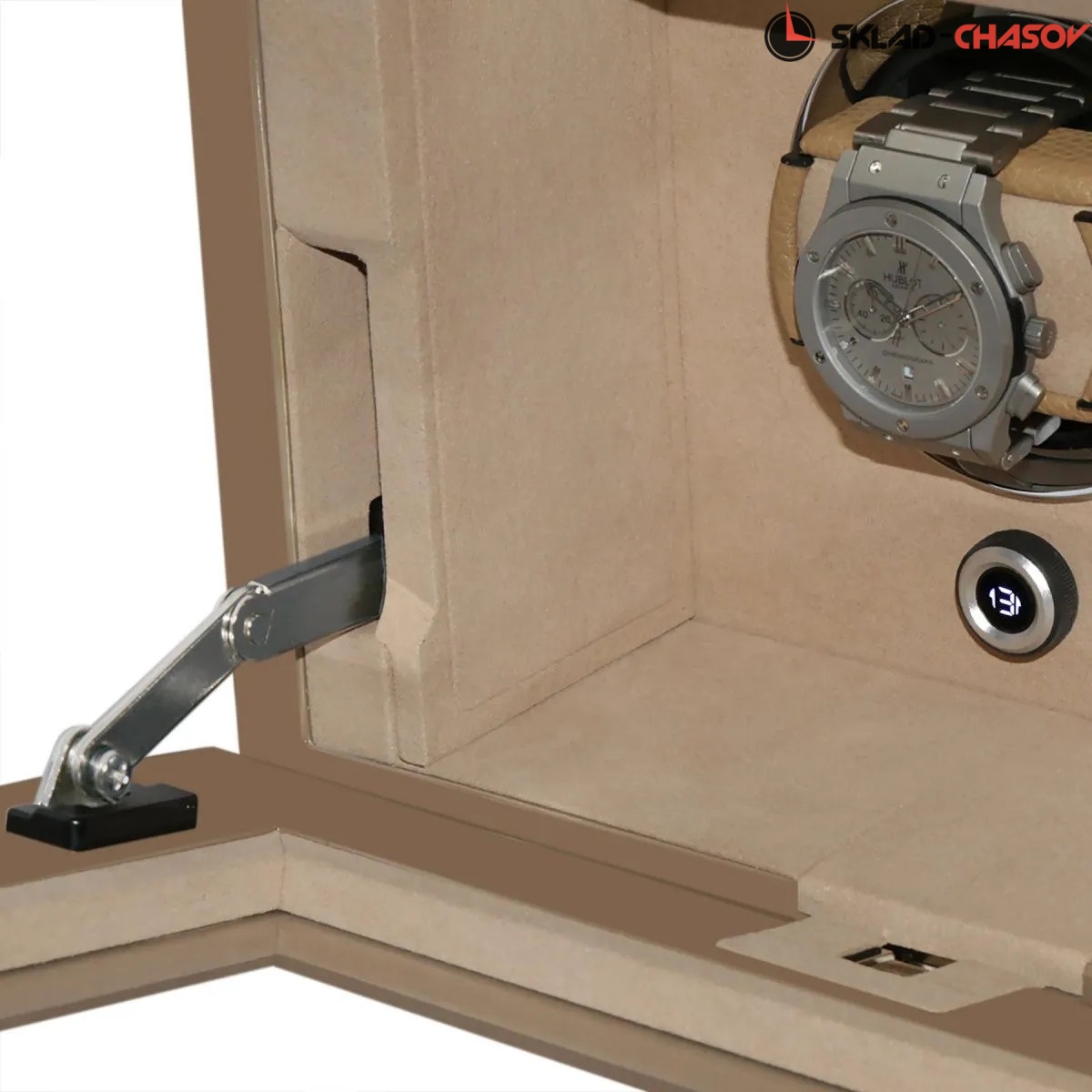Модель оснащена пятью независимыми ячейками автоподзавода, каждая из которых настраивается индивидуально. Это позволяет подобрать оптимальный режим для часов разных брендов и калибров. Есть возможность настроить как сторону вращения, так и кол-во оборотов, диапазон от 480 до 1950 оборотов в сутки.