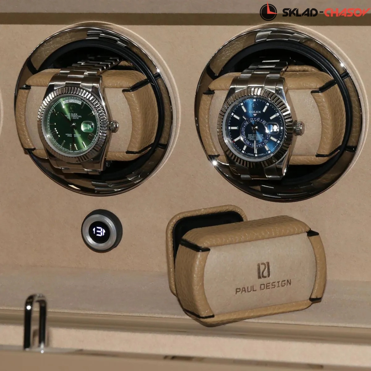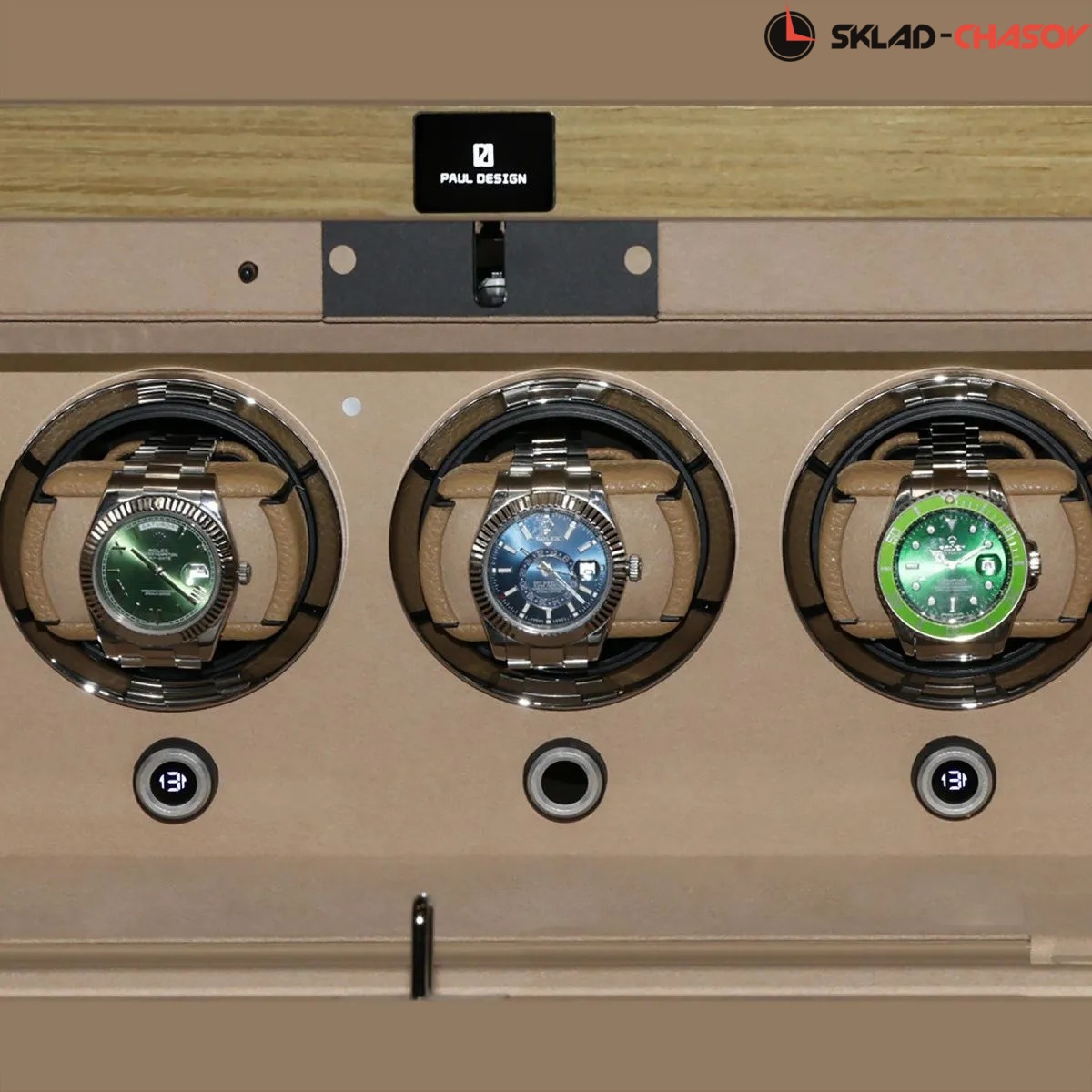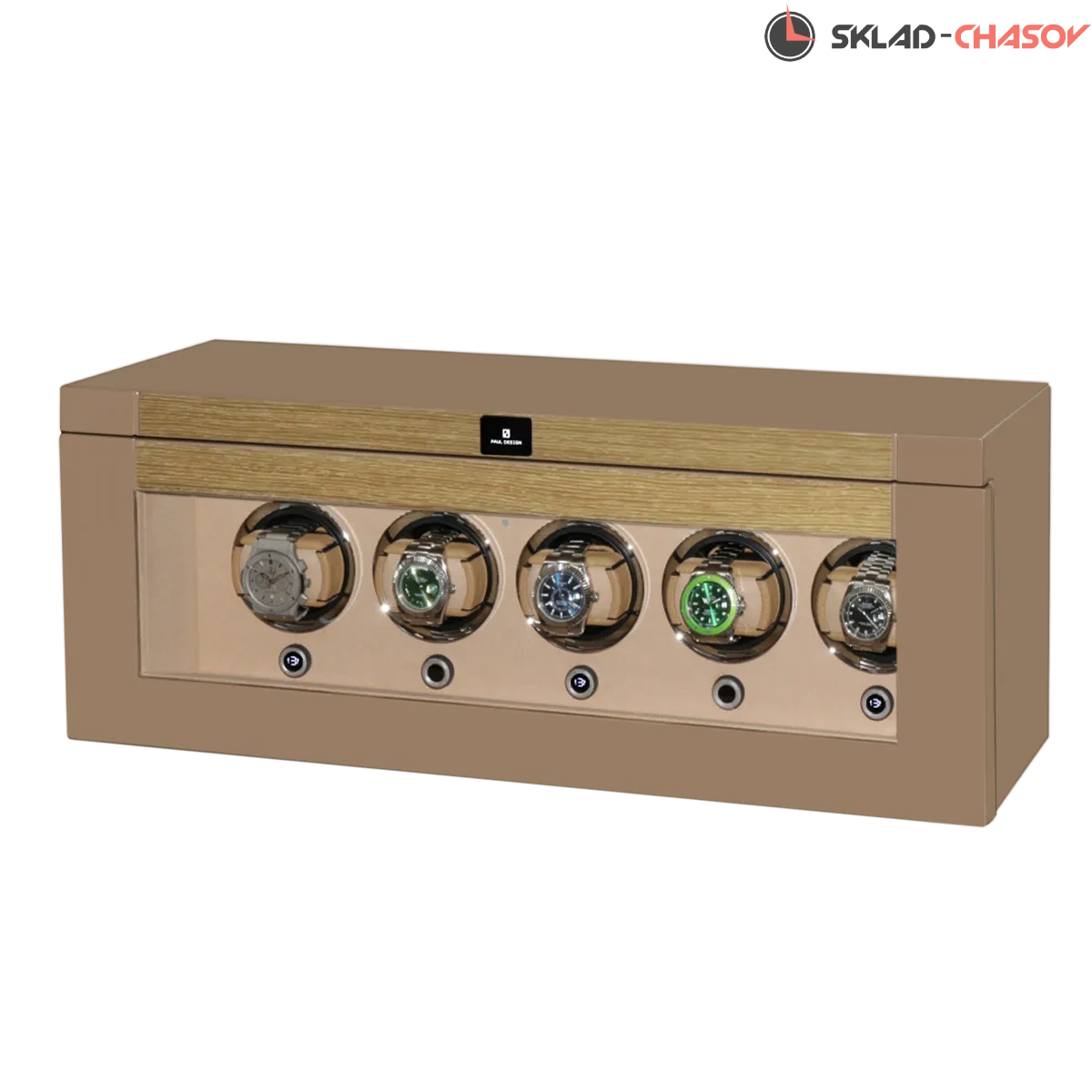 Модель оснащена пятью независимыми ячейками автоподзавода, каждая из которых настраивается индивидуально. Это позволяет подобрать оптимальный режим для часов разных брендов и калибров. Есть возможность настроить как сторону вращения, так и кол-во оборотов, диапазон от 480 до 1950 оборотов в сутки.