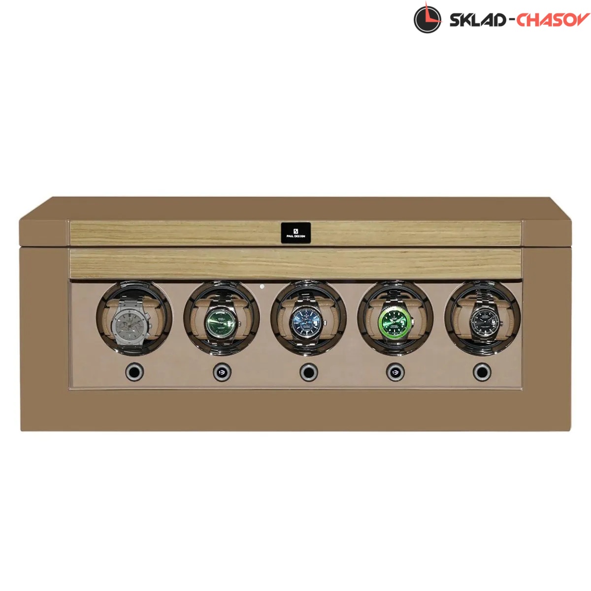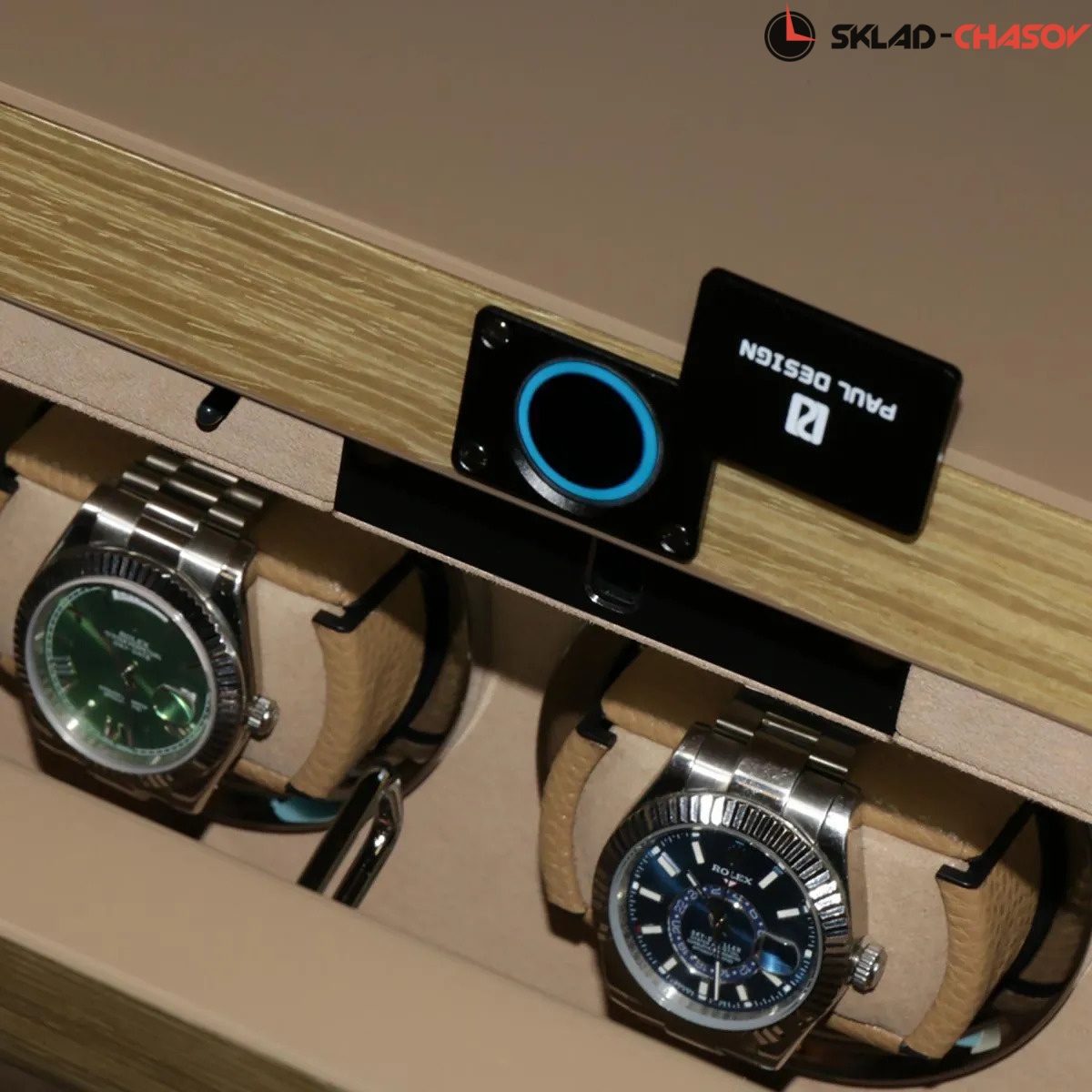 Дизайн выполнен в современном минималистичном стиле: строгие линии, технологичные материалы и сдержанная цветовая гамма подчёркивают премиальный характер. Экстерьер выполнен из светлого дерева с вставками из бамбука и покрыт глянцевым рояльным лаком, в несколько слоев, создавая благородный глянец. В интерьере используется мягкий бархат в едином гармоничном цветовом решении, а серебристые безеля элегантно обрамляют ячейки автоподзавода. Светодиодная подсветка при открытии дверцы подчёркивает красоту коллекции.
