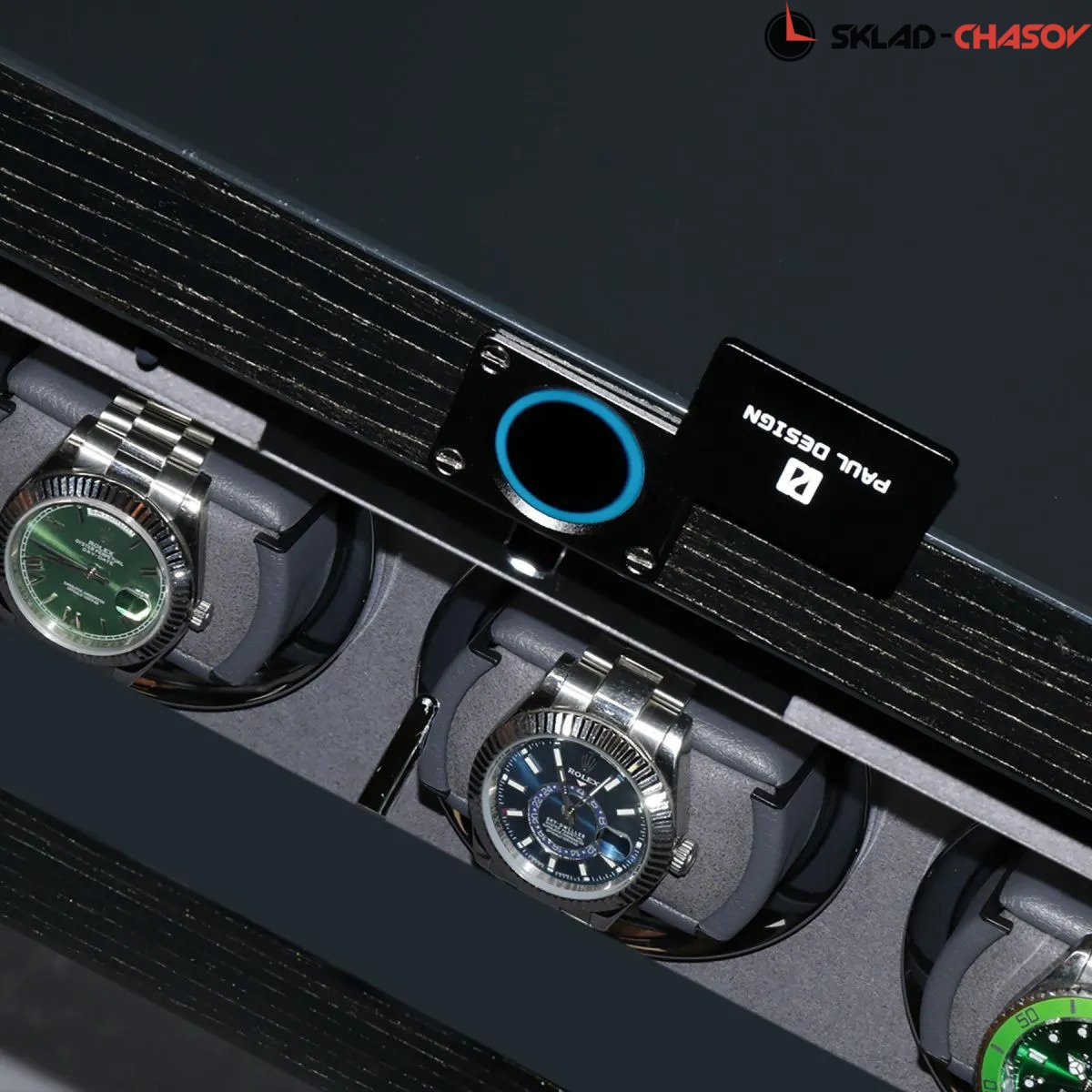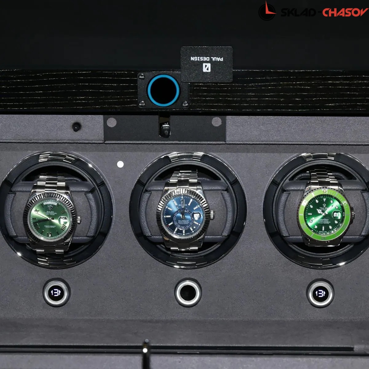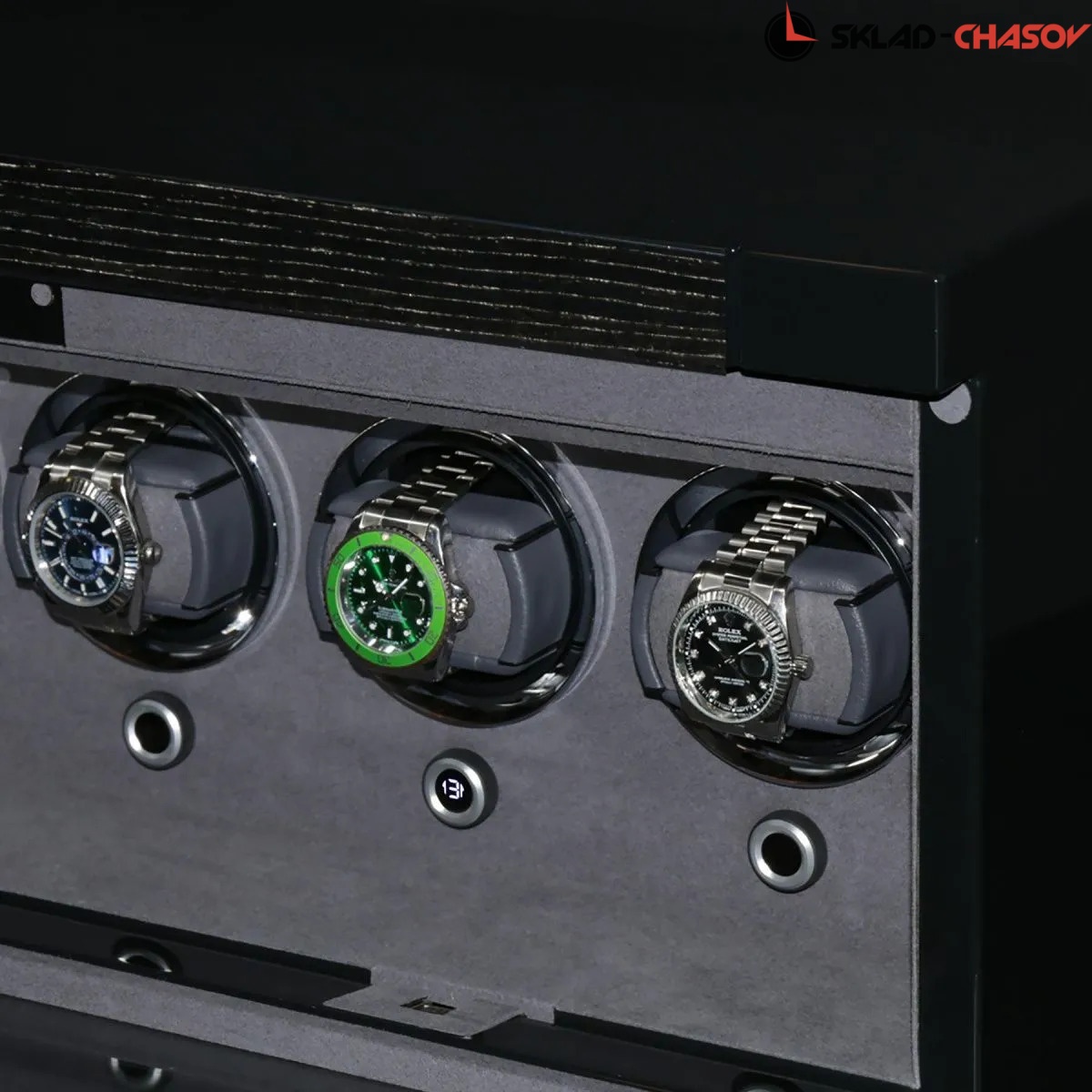 Модель оснащена пятью независимыми ячейками автоподзавода, каждая из которых настраивается индивидуально. Это позволяет подобрать оптимальный режим для часов разных брендов и калибров. Есть возможность настроить как сторону вращения, так и кол-во оборотов, диапазон от 480 до 1950 оборотов в сутки.