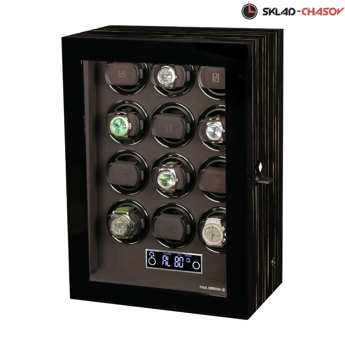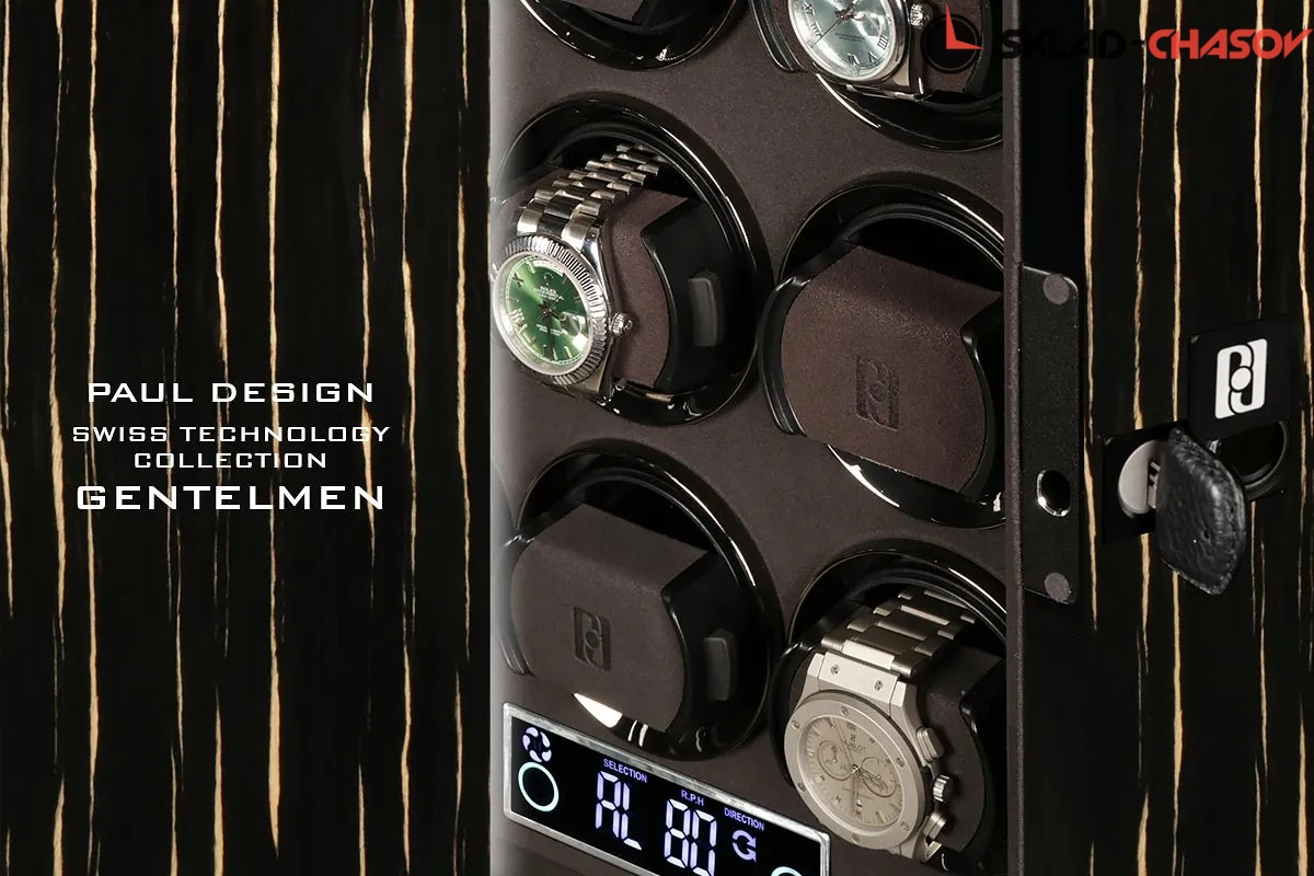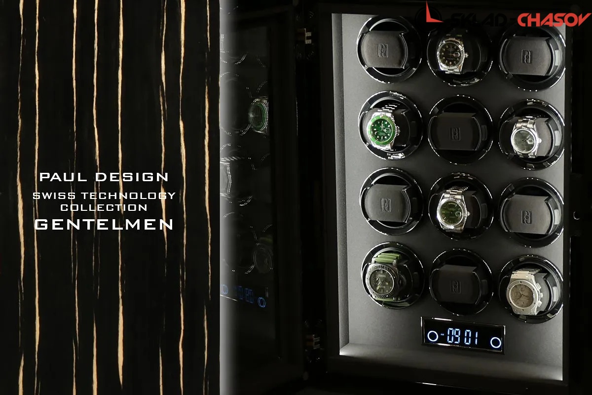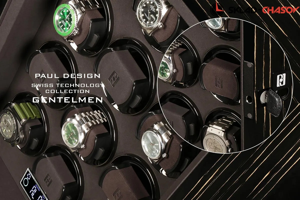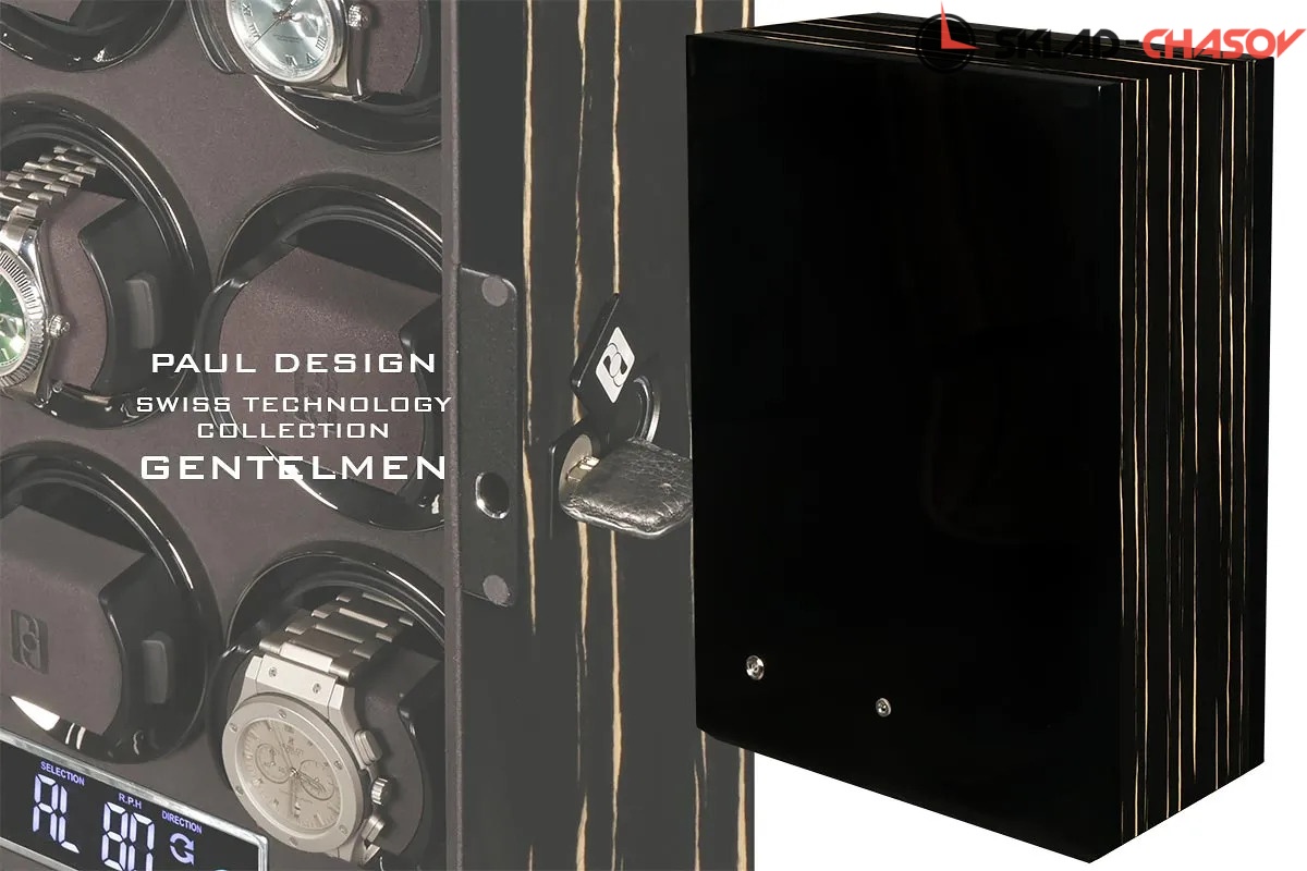 Элегантная шкатулка для автоподзавода 12-ти часов Gentlemen 12 BS-N от Paul Design объединяет изысканный дизайн и передовые технологии. Корпус выполнен из редкого тёмного дерева зембрано и покрыт многослойным рояльным лаком, придающим поверхности благородный глянец. Интерьер оформлен мягкой микрофиброй графитового оттенка, которая надёжно защищает часы и подчёркивает утончённость коллекции.