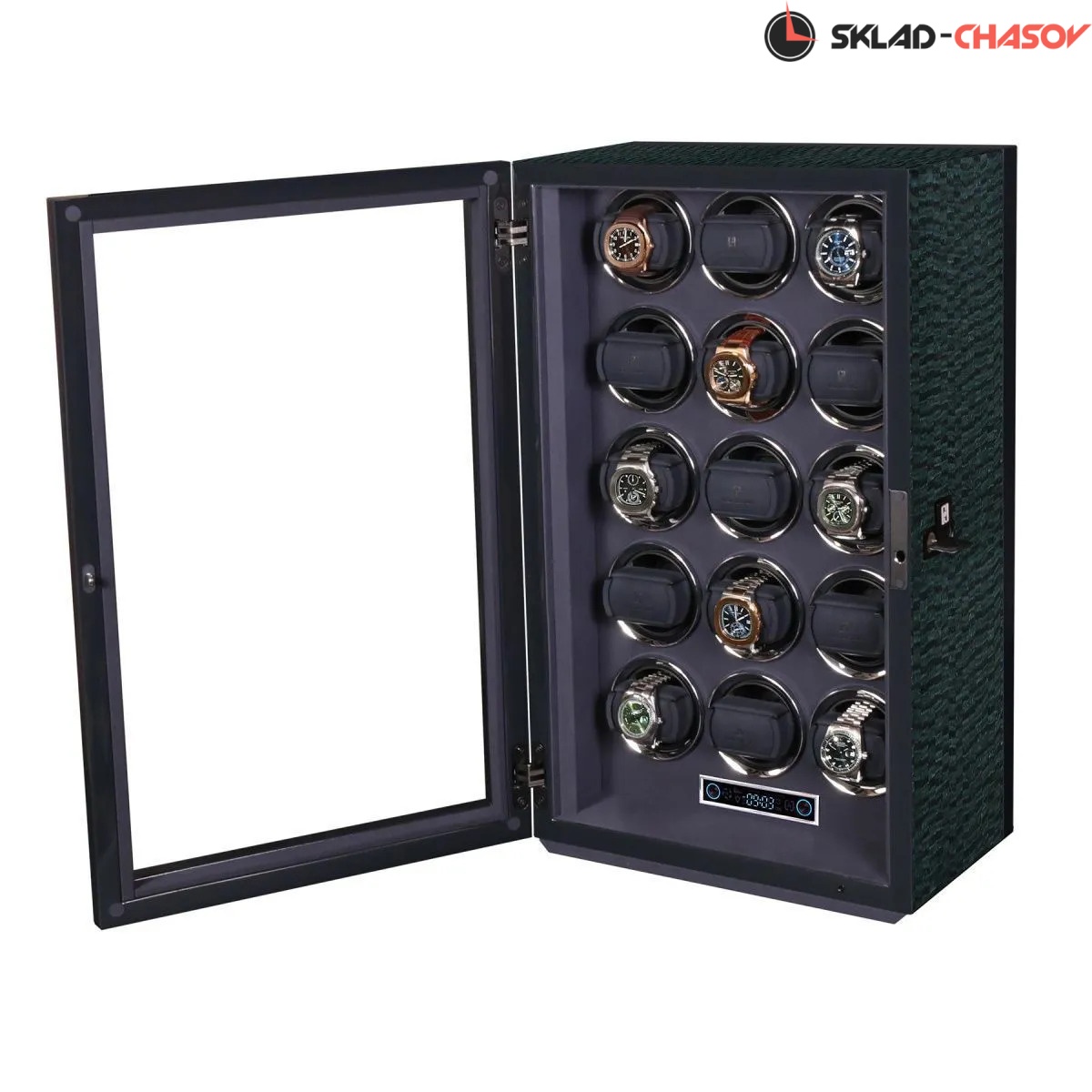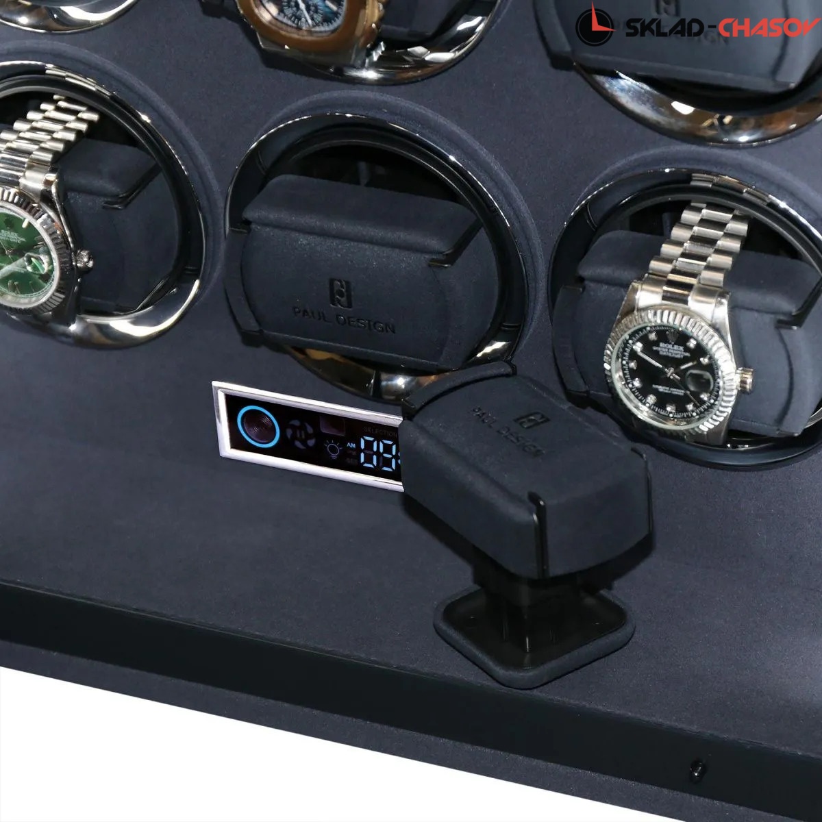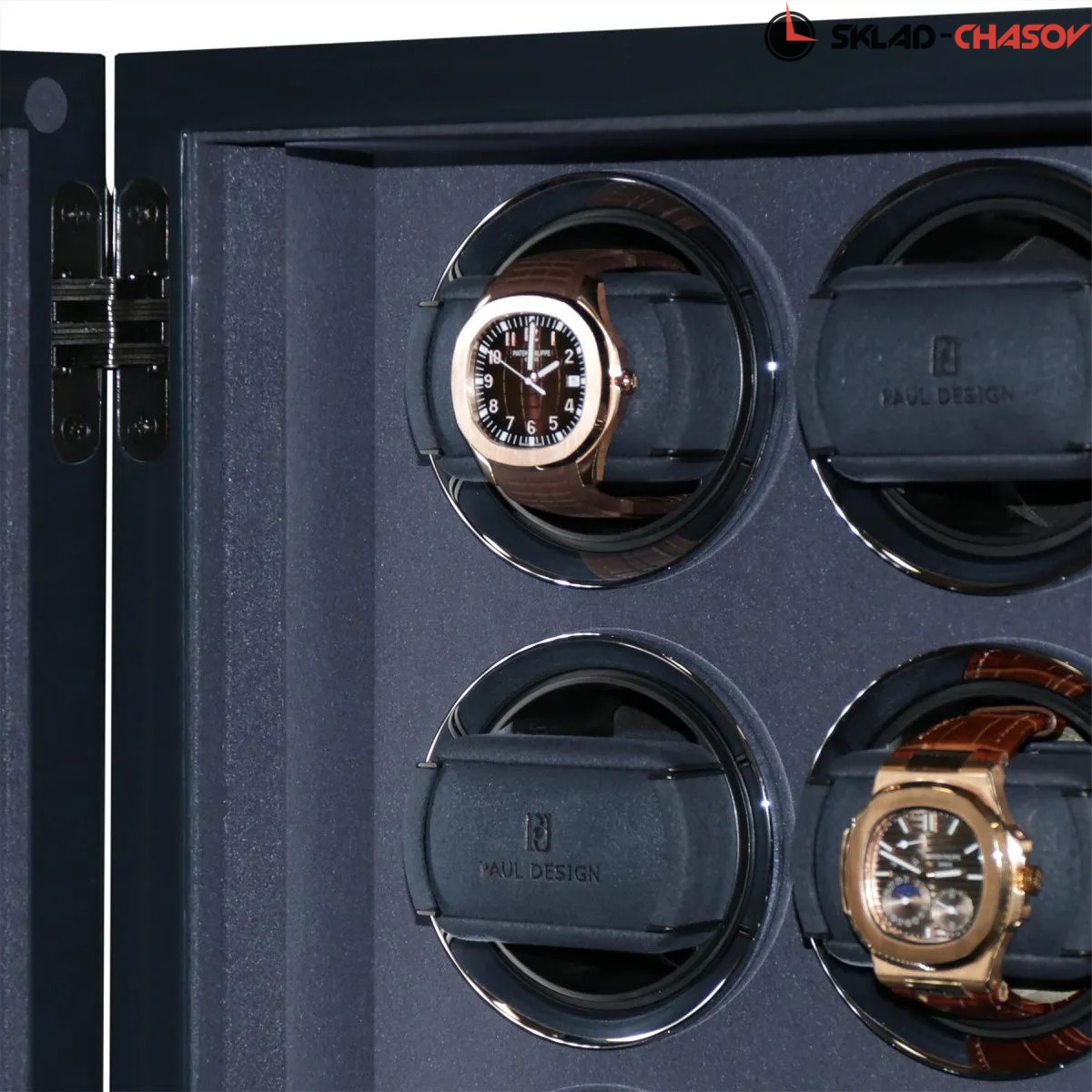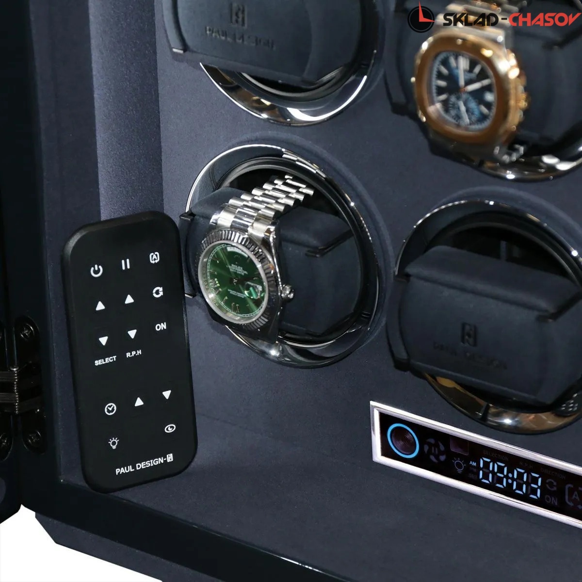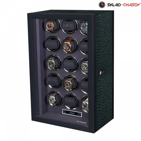 Элегантная шкатулка для автоподзавода 15-ти часов Gentlemen 15 AB от Paul Design объединяет изысканный дизайн и передовые технологии. Корпус выполнен из дерева со вставками из синего агата и покрыт рояльным лаком насыщенного синего цвета. Интерьер оформлен мягким бархатом, в едином гармоничном цветовом решении, который надёжно защищает часы и подчёркивает утончённость коллекции. Серебристые безеля элегантно обрамляют ячейки автоподзавода. Модель оснащена системой автоподзавода для 15 часов с возможностью индивидуальной настройки оборотов и направления вращения каждой ячейки при помощи пульта дистанционного управления. Диапазон от 480 до 1950 оборотов в сутки обеспечивает оптимальный уход за часами любого класса. Телескопические держатели нового поколения подходят для часов с любой длиной ремешка или браслета, а бесшумные моторы делают использование максимально комфортным. Питание от сети 220 В гарантирует стабильность и долговечность работы. Прозрачная крышка позволяет любоваться коллекцией, не открывая шкатулку, а встроенная светодиодная подсветка, управляемая пультом или кнопкой на боковой панели, эффектно подчёркивает красоту хранящихся моделей. Для безопасности предусмотрены замок с кожаной оплёткой и сканер отпечатка пальца. Новый компактный дисплей отображает текущее время и позволяет управлять автоподзаводом всех ячеек одновременно.