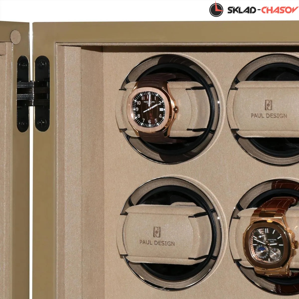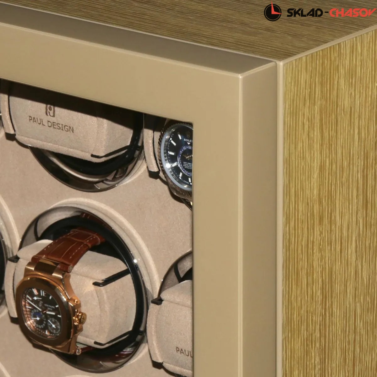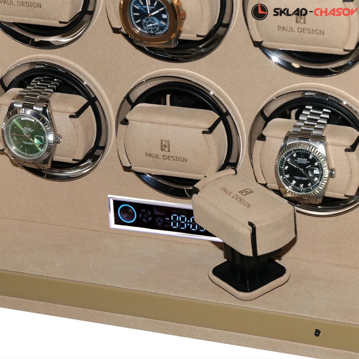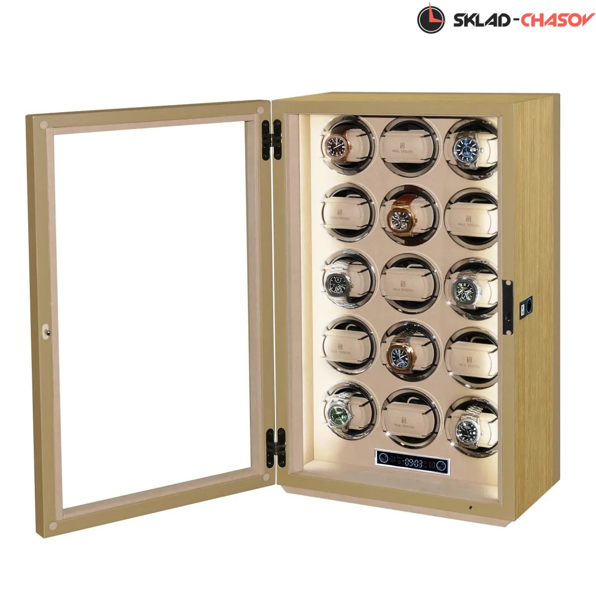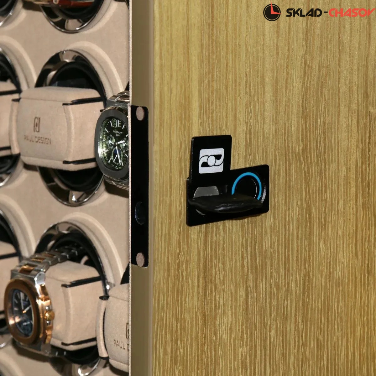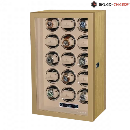 Элегантная шкатулка для автоподзавода 15-ти часов Gentlemen 15 SA от PaulDesign объединяет изысканный дизайн и передовые технологии. Экстерьер выполнен из светлого дерева с вставками из светлого бамбука и покрыт глянцевым лаком, придающим поверхности благородный глянец. Интерьер оформлен мягким бархатом в едином цветовом решении, который надёжно защищает часы и подчёркивает утончённость коллекции, а серебристые безеля элегантно обрамляют ячейки автоподзавода. Модель оснащена системой автоподзавода для 15 часов с возможностью индивидуальной настройки оборотов и направления вращения каждой ячейки при помощи пульта дистанционного управления. Диапазон от 480 до 1950 оборотов в сутки обеспечивает оптимальный уход за часами любого класса. Телескопические держатели нового поколения подходят для часов с любой длиной ремешка или браслета, а бесшумные моторы делают использование максимально комфортным. Питание от сети 220 В гарантирует стабильность и долговечность работы. Прозрачная крышка позволяет любоваться коллекцией, не открывая шкатулку, а встроенная светодиодная подсветка, управляемая пультом или кнопкой на боковой панели, эффектно подчёркивает красоту хранящихся моделей. Для безопасности предусмотрены замок с кожаной оплёткой и сканер отпечатка пальца. Новый компактный дисплей отображает текущее время и позволяет управлять автоподзаводом всех ячеек одновременно.