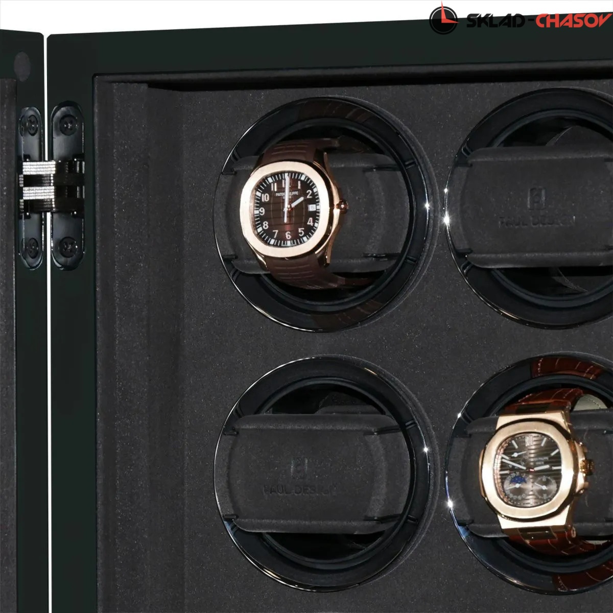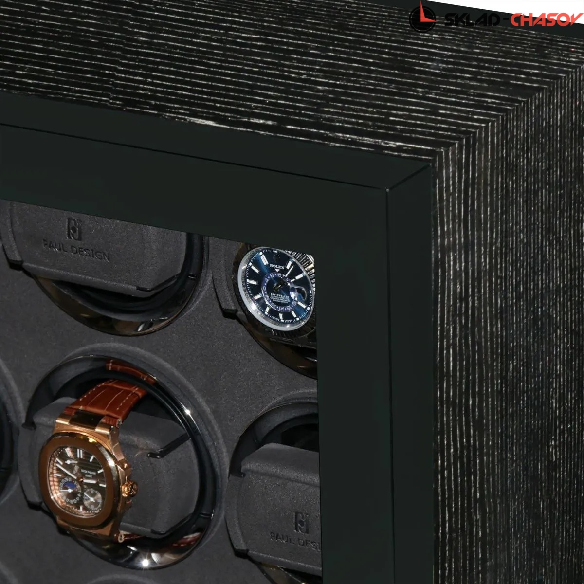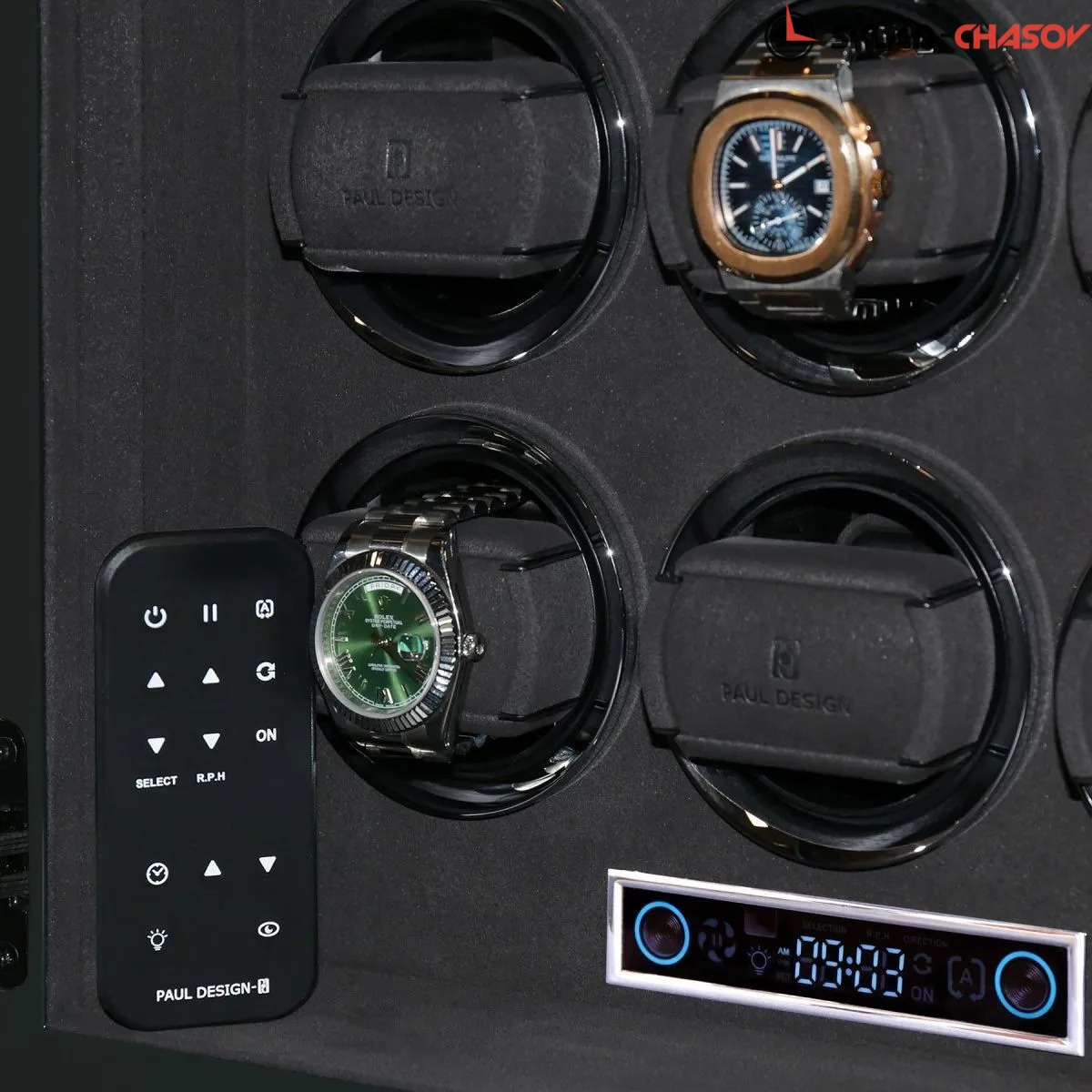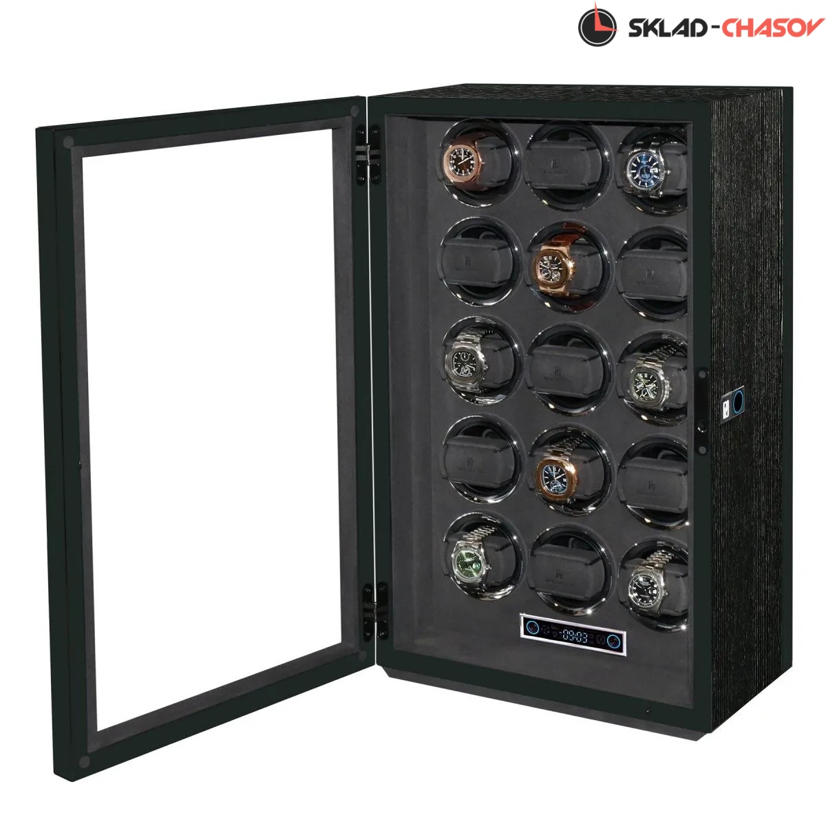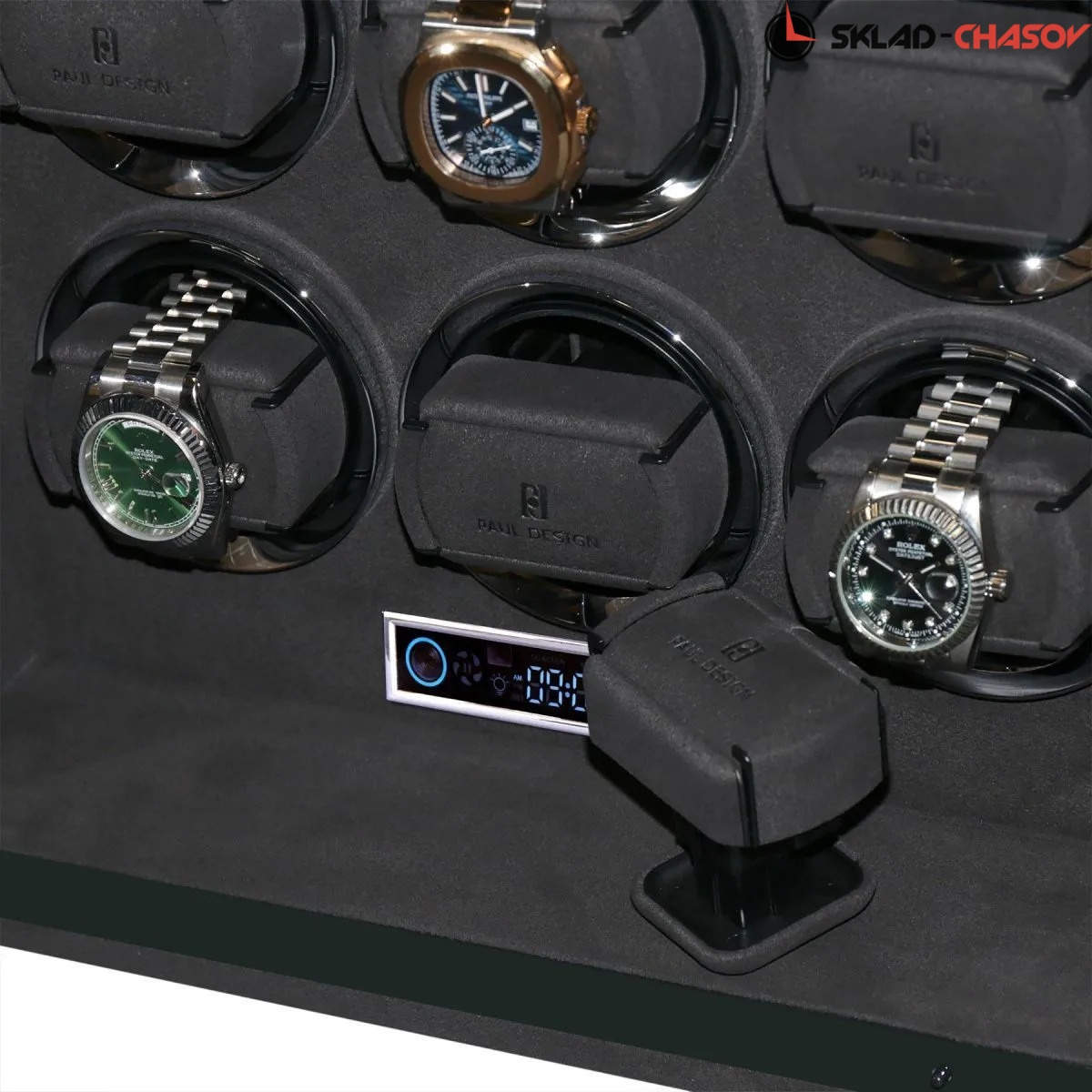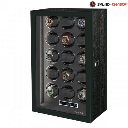 Элегантная шкатулка для автоподзавода 15-ти часов Gentlemen 15 SL от PaulDesign объединяет изысканный дизайн и передовые технологии. Корпус выполнен из тёмного дерева с вставками из бамбука и покрыт глянцевым лаком, придавая благородный глянец. Интерьер оформлен мягким бархатом графитового оттенка, который надёжно защищает часы и подчёркивает утончённость коллекции, а серебристые безеля элегантно обрамляют ячейки автоподзавода. Модель оснащена системой автоподзавода для 15 часов с возможностью индивидуальной настройки оборотов и направления вращения каждой ячейки при помощи пульта дистанционного управления. Диапазон от 480 до 1950 оборотов в сутки обеспечивает оптимальный уход за часами любого класса. Телескопические держатели нового поколения подходят для часов с любой длиной ремешка или браслета, а бесшумные моторы делают использование максимально комфортным. Питание от сети 220 В гарантирует стабильность и долговечность работы. Прозрачная крышка позволяет любоваться коллекцией, не открывая шкатулку, а встроенная светодиодная подсветка, управляемая пультом или кнопкой на боковой панели, эффектно подчёркивает красоту хранящихся моделей. Для безопасности предусмотрены замок с кожаной оплёткой и сканер отпечатка пальца. Новый компактный дисплей отображает текущее время и позволяет управлять автоподзаводом всех ячеек одновременно.