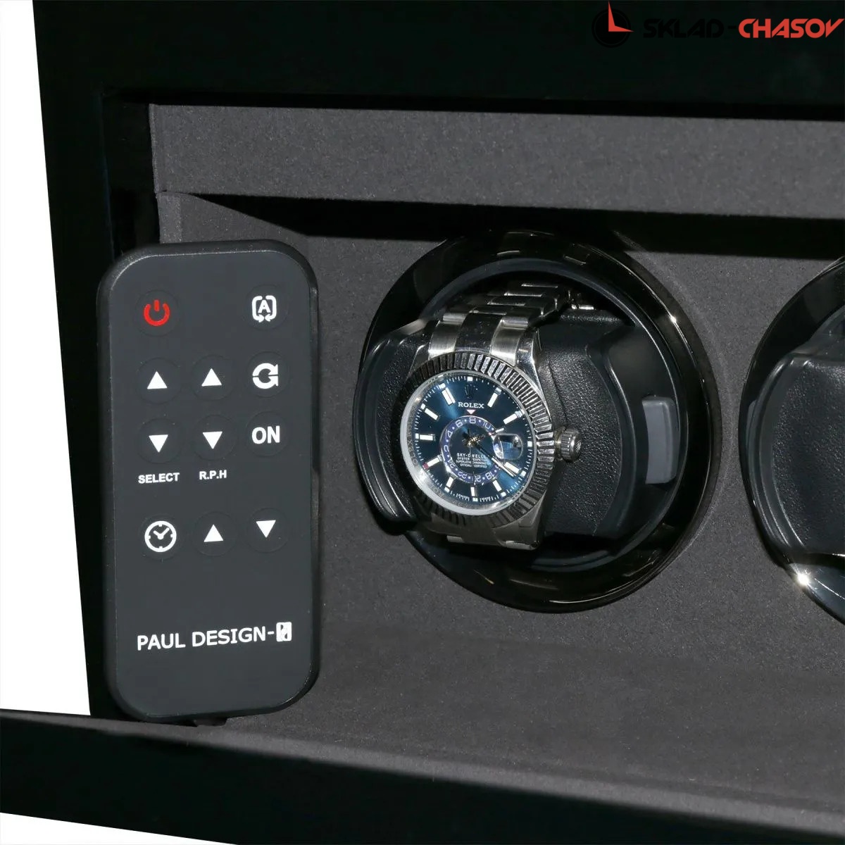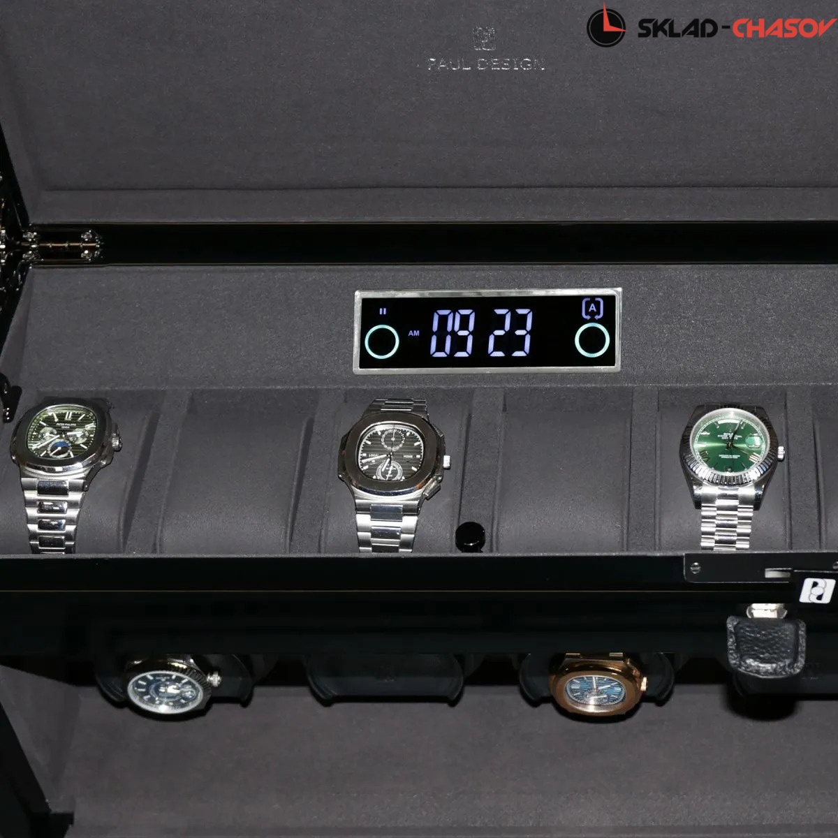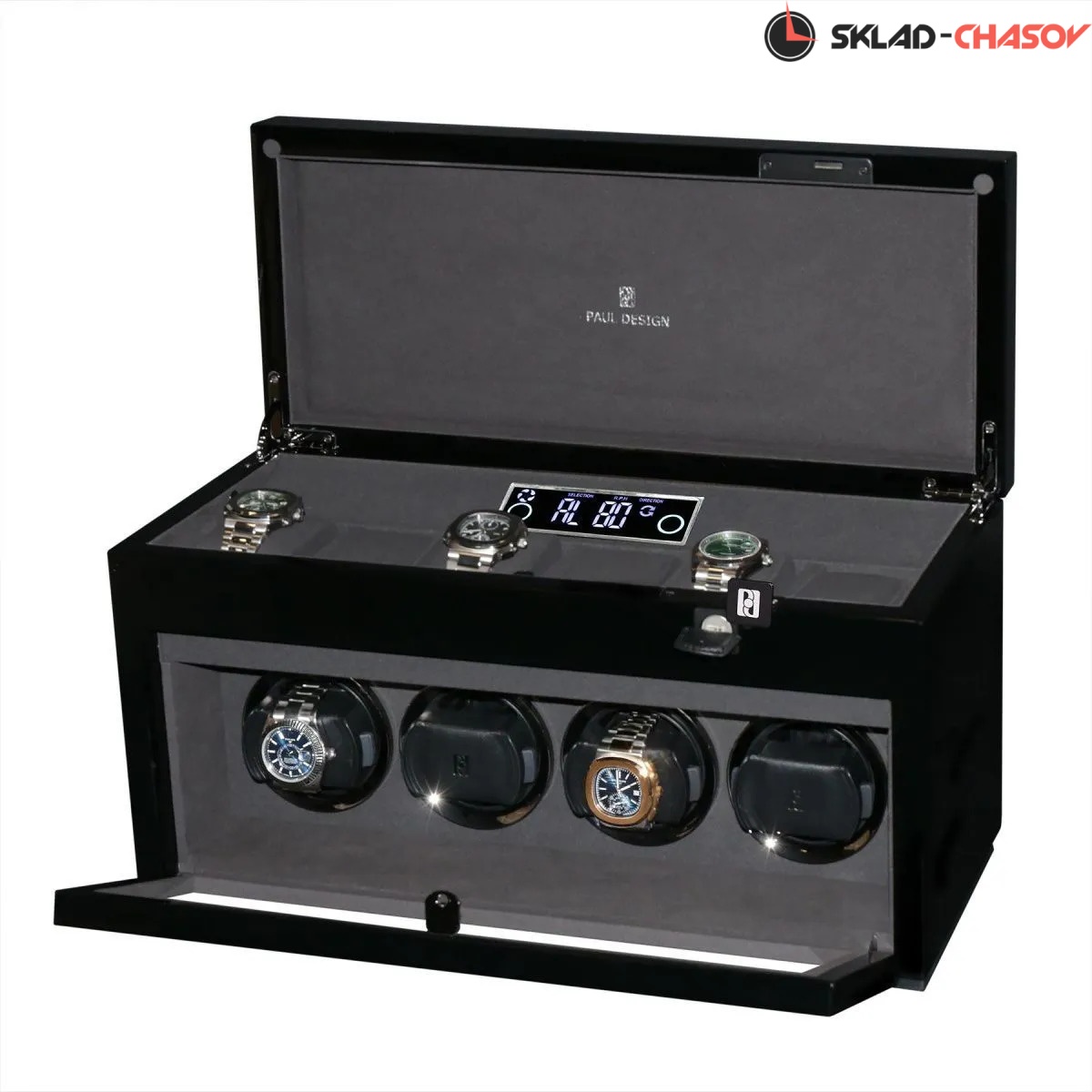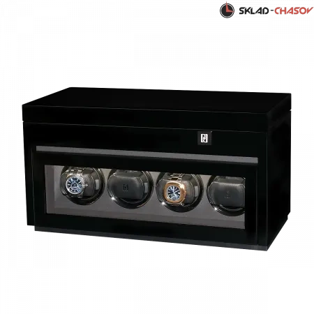 Элегантная шкатулка для хранения и автоподзавода 4-х часов Gentlemen 4+6 B от PaulDesign сочетает в себе утончённый дизайн и передовые технологии. Корпус выполнен из темного дерева и покрыт многослойным рояльным лаком, создающим глубокий благородный глянец. Внутренняя отделка из мягкого бархата графитового оттенка надёжно защищает часы и подчёркивает их статусность, а серебристые безеля элегантно обрамляют ячейки автоподзавода. Модель оснащена системой автоподзавода для 4-х часов с возможностью индивидуальной настройки направления и количества оборотов каждой ячейки при помощи пульта дистанционного управления. Диапазон от 480 до 1950 оборотов в сутки обеспечивает оптимальный уход за часами любого класса. Телескопические держатели нового поколения подходят для браслетов и ремешков любых размеров, а бесшумные моторы делают эксплуатацию максимально комфортной. Прозрачная крышка открывает вид на коллекцию, а встроенная LED-подсветка эффектно подчёркивает её красоту и может включаться с помощью боковой кнопки или пульта. Питание от сети 220 В гарантирует стабильность и долговечность работы устройства. Под верхней крышкой предусмотрено дополнительное место для хранения 6-ти часов, что позволяет разместить целую коллекцию. Новый компактный дисплей отображает текущее время и облегчает управление автоподзаводом всех ячеек одновременно. Для безопасности предусмотрен замок с кожаной оплёткой. Шкатулка поставляется в фирменной подарочной упаковке, что делает её не только высокотехнологичным аксессуаром, но и престижным подарком для истинного ценителя часов.