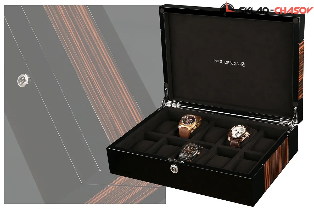 Шкатулка рассчитана на хранение 10 часов и закрывается на удобную кнопку с фирменным логотипом. Внутренняя сторона крышки украшена изящной серебристой надписью PAUL DESIGN, подчёркивающей принадлежность к премиальной линии. Интерьер отделан мягкой микрофиброй графитового оттенка, которая надёжно защищает часы от царапин и внешних воздействий.