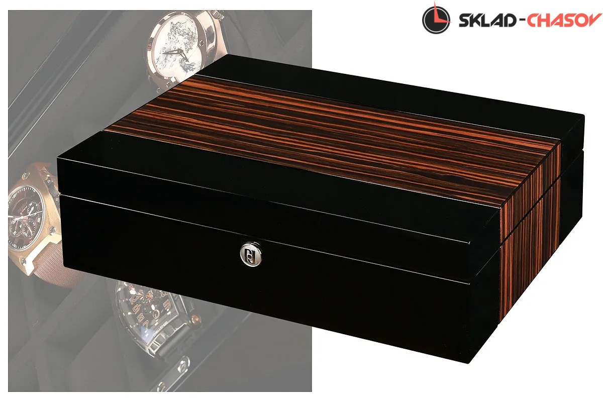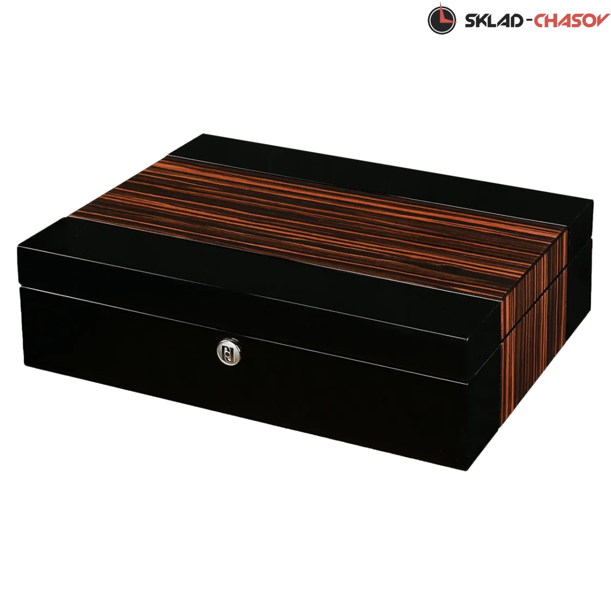 Элегантная и функциональная шкатулка от знаменитого бренда Paul Design станет идеальным решением для коллекционеров. Корпус выполнен из дерева, покрытого многослойным рояльным лаком чёрного цвета, и украшен вставками из макассара, подчёркивающими благородство и современный характер модели.