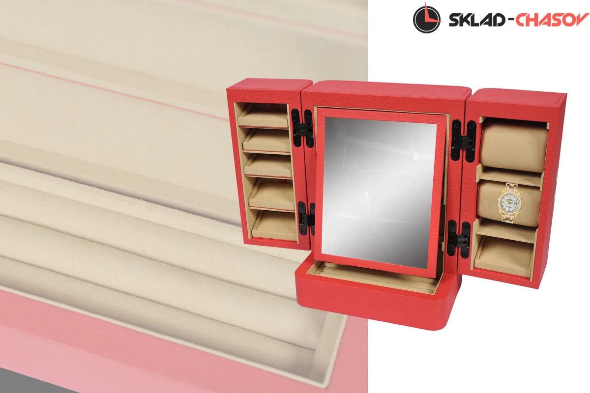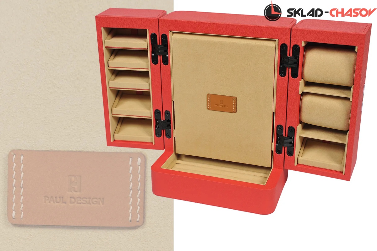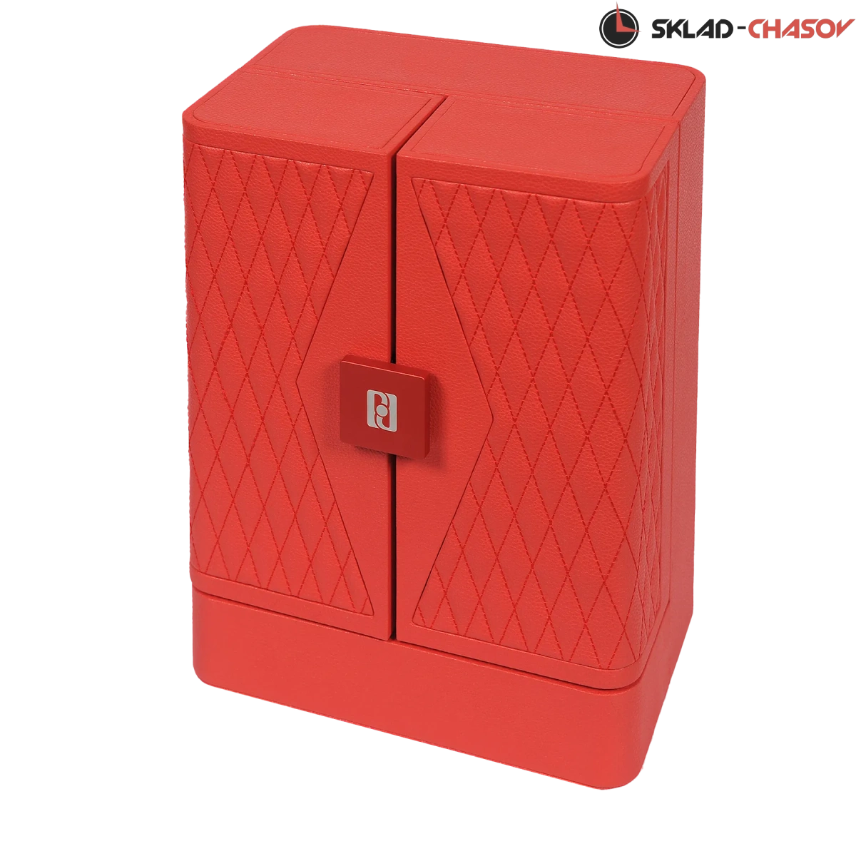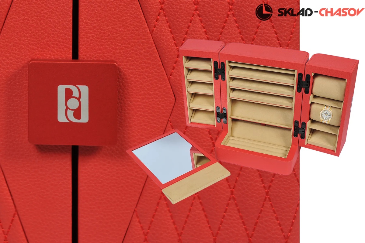 Стильная и функциональная шкатулка для хранения ювелирных украшений и часов JEWEL BOX RD бренда PaulDesign, идеально сочетает в себе современный внешний вид и продуманную организацию места для ваших ценностей. Изящный корпус из качественной кожи насыщенного красного цвета с ромбовидной стёжкой и фирменным логотипом PD создаёт ощущение роскоши и статусности, а надёжная клапанная застёжка с ключиком обеспечивает безопасность при хранении. Внутреннее пространство отделанное мягким бархатом графитового оттенка, организовано так, чтобы каждое изделие было на своём месте и надёжно защищено от царапин и деформаций. Встроенное зеркало добавляет удобства при подборе аксессуаров, а премиальные материалы гарантируют длительный срок службы. Эта шкатулка станет отличным решением для тех, кто ценит порядок, стиль и безопасность своих коллекций, а также станет эффектным подарком для близких.