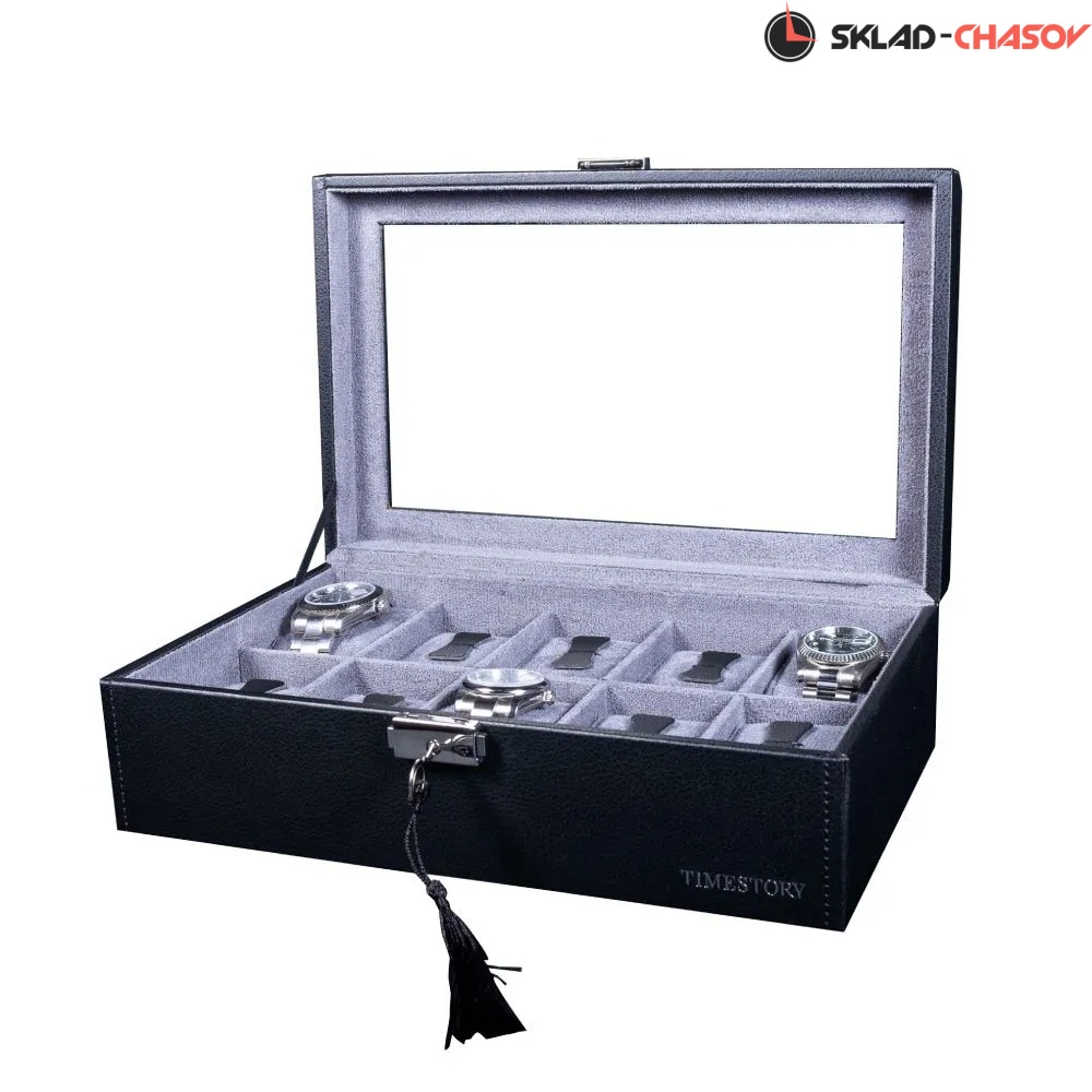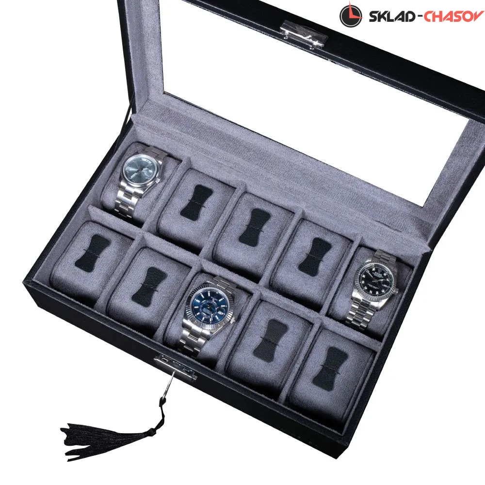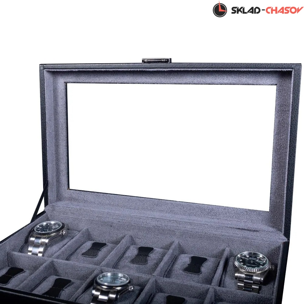 В моде всегда были кожаные изделия. Популярность и спрос на них никогда не падал. Изящность этого материала неповторима, а универсальность использования просто поражает. Чтобы воплотить желания клиентов, любящих кожаный корпус у шкатулок, была произведена коллекция Leather. Для ценителей своих наручных аксессуаров мы расположили прозрачное стекло посередине крышки, через которое можно созерцать коллекцию из 10-ти часов. Демонстрируя свои часы через крышку, нужно не забывать про их сохранность. Обеспечить ее позволяет небольшой замочек на торцевой части, закрывающийся на ключ. Исполнение в черной коже является классикой. В дополнении к элегантности шкатулки черный корпус переходит в приятный бархатный интерьер серого цвета. Эргономичные подушки позволят с максимальным комфортом и удобством застегнуть на них часы любых размеров.