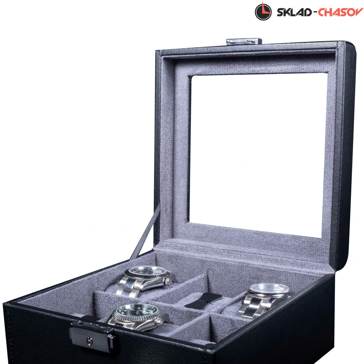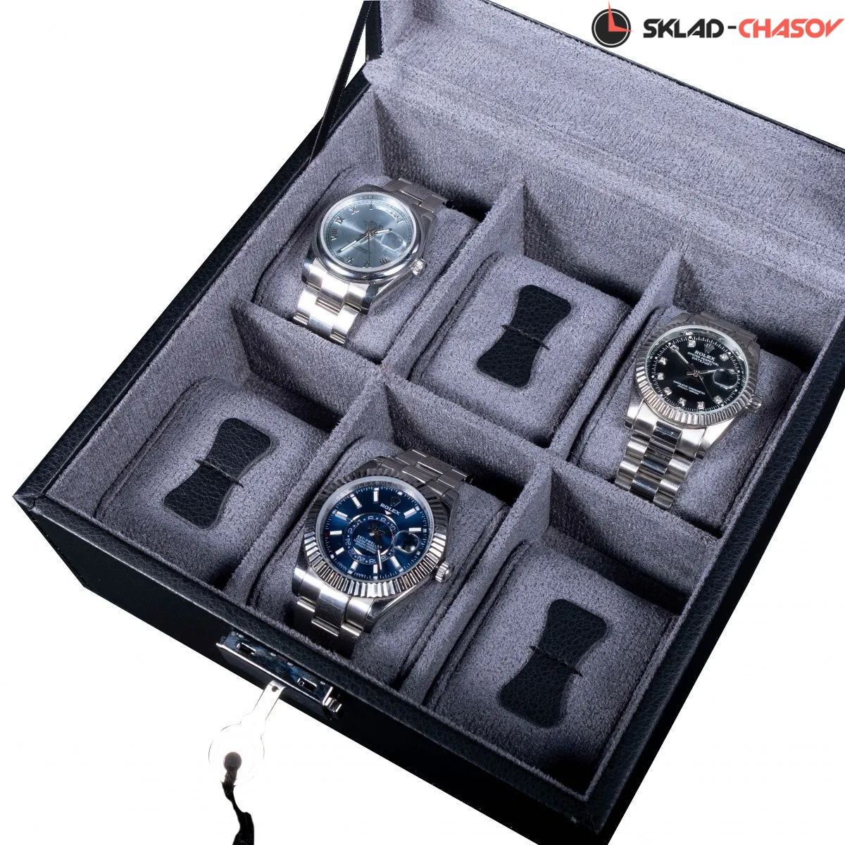 В моде всегда были кожаные изделия. Популярность и спрос на них никогда не падал. Изящность этого материала неповторима, а универсальность использования просто поражает. Чтобы воплотить желания клиентов, любящих кожаный корпус у шкатулок, была произведена коллекция Leather. Для ценителей своих наручных аксессуаров мы расположили прозрачное стекло посередине крышки, через которое можно созерцать коллекцию из 6-ти часов. Демонстрируя свои часы через крышку, нужно не забывать про их сохранность. Обеспечить ее позволяет небольшой замочек на торцевой части, закрывающийся на ключ. Исполнение в черной коже является классикой. В дополнении к элегантности шкатулки черный корпус переходит в приятный бархатный интерьер серого цвета. Эргономичные подушки позволят с максимальным комфортом и удобством застегнуть на них часы любых размеров.