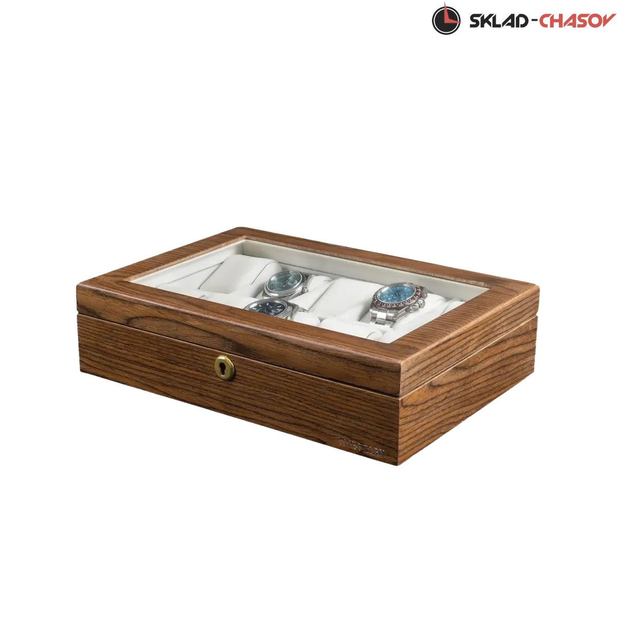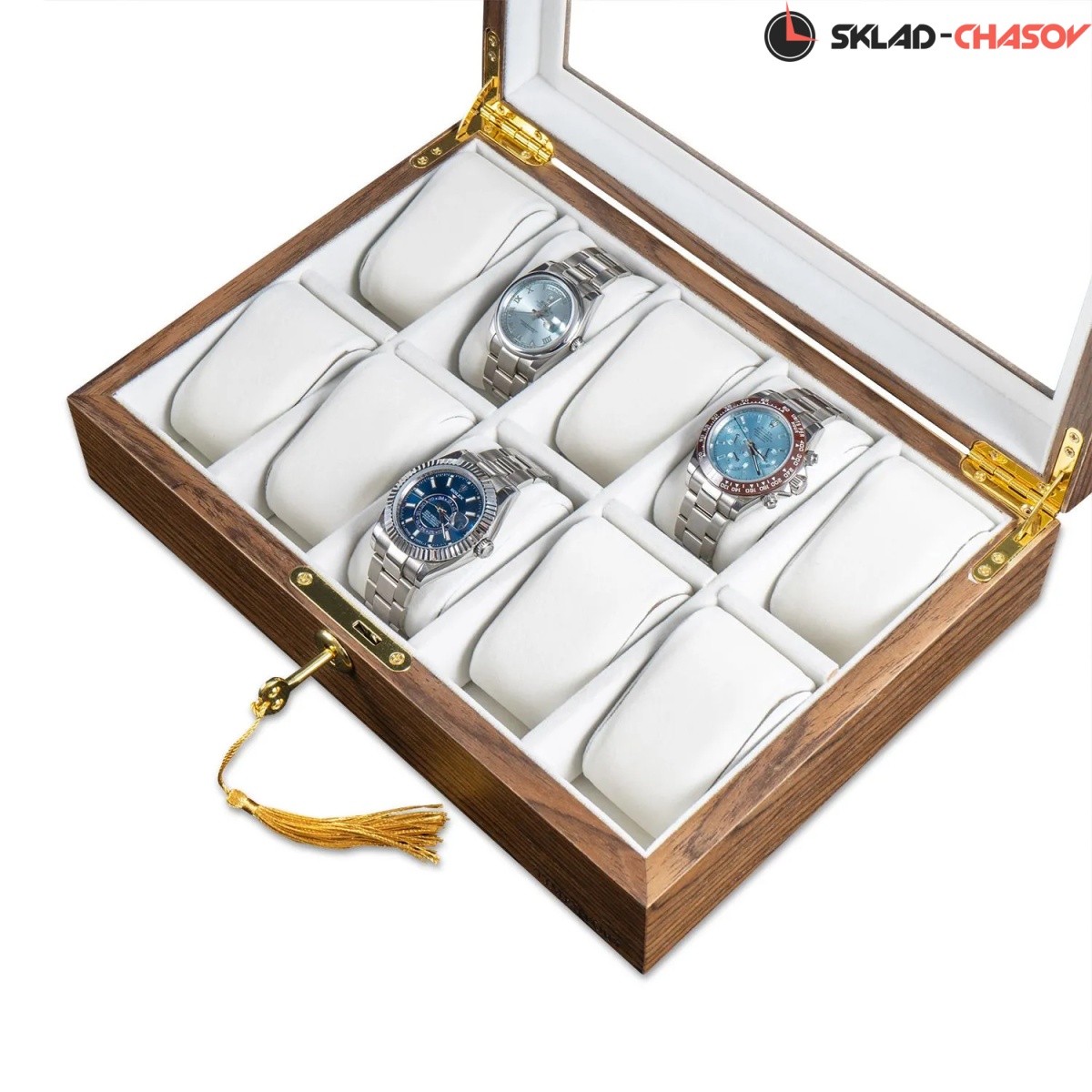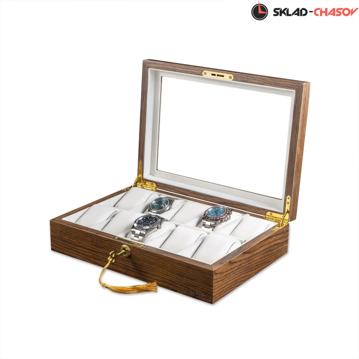 Приятный коричневый с белым и золотым цветом рождает необыкновенно-завораживающее сочетание. На такие шкатулки можно смотреть вечно, просто любуясь ими. Именно такая идеология была заложена в коллекции Miracle. Через прозрачное стекло в крышке шкатулки можно любоваться коллекцией из 10-ти часов. Неповторимое исполнение экстерьера в светло-коричневом дереве Ярра и покрытие множественными слоями высококачественного матового лака придает изящность. Прекрасный дизайн шкатулки дополняет маленький замок, закрывающийся на ключ. Приятный интерьер светлого оттенка завораживает. Эргономичные подушки позволят с максимальным комфортом и удобством застегнуть на них часы любых размеров.
