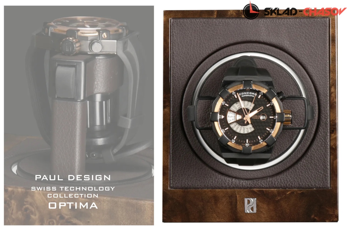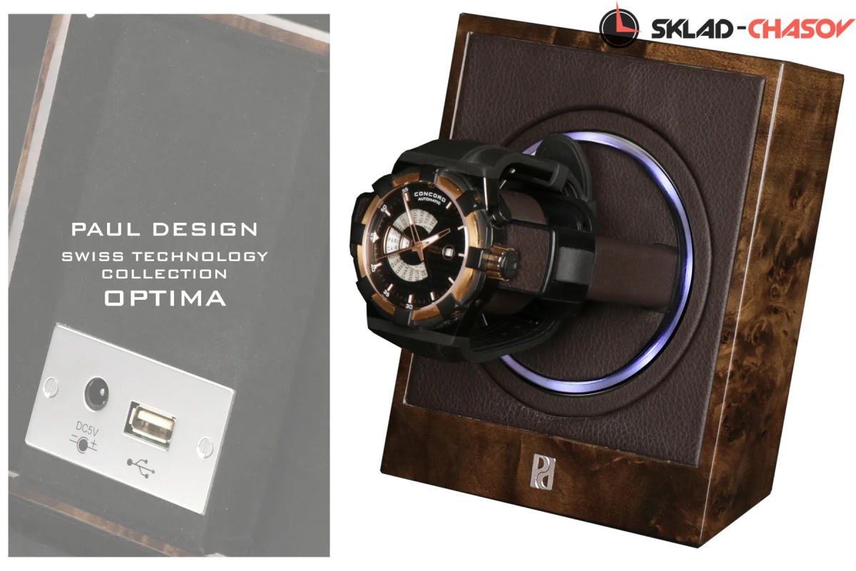 Модель OPTIMA 1db -интересная новинка, достаточно продвинутая модель с профессиональными настройками. Основное преимущество - эффектная подсветка держателя часов, показывающая детали процесса: направление вращения и количество оборотов. Совершенно новое, интересное решение в мире Автоматического Завода Часов. Корпус изготавливается из натурального дерева “ канадский клён « ,также используется кожа, микрофибра и металл. Преимущества модели: - светодиодная подсветка, - телескопический инновационный держатель для больших, средних и малых часов, - вход USB, - возможность подключение других шкатулок и/или других зарядных устройств к одному источнику питания. Фирменная подарочная коробка от PD.