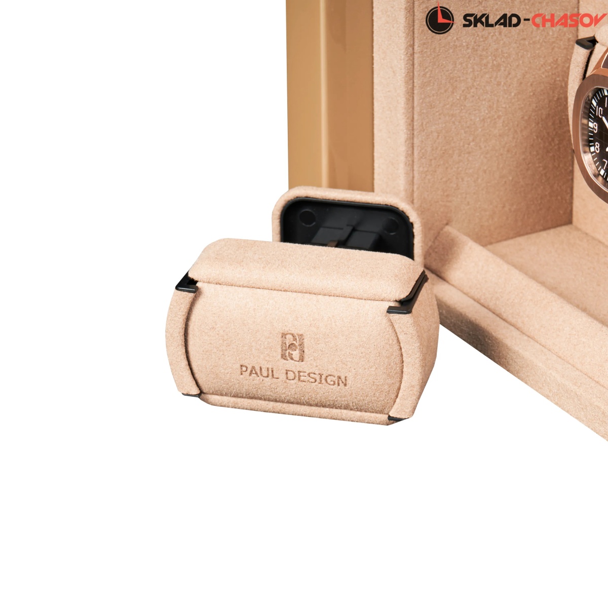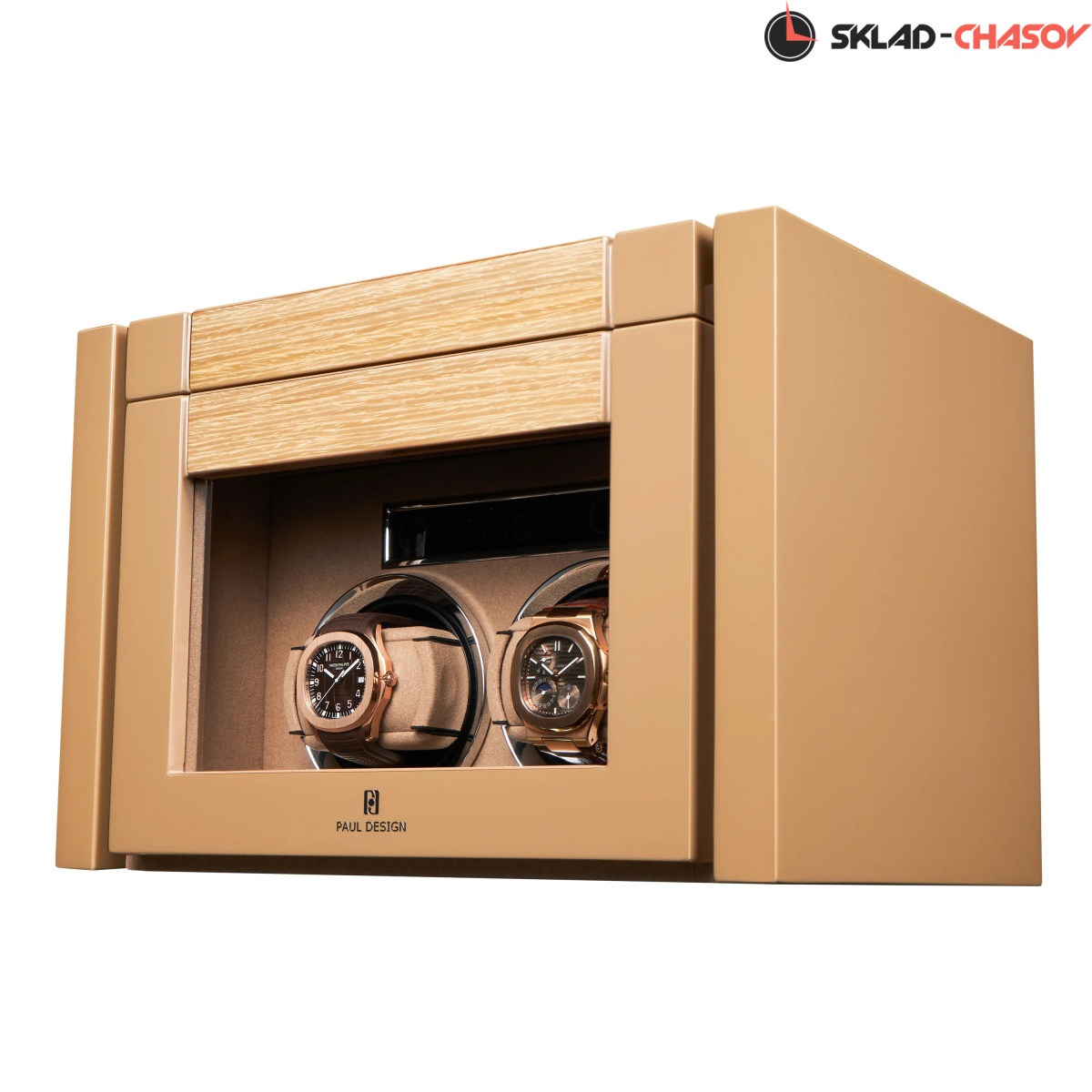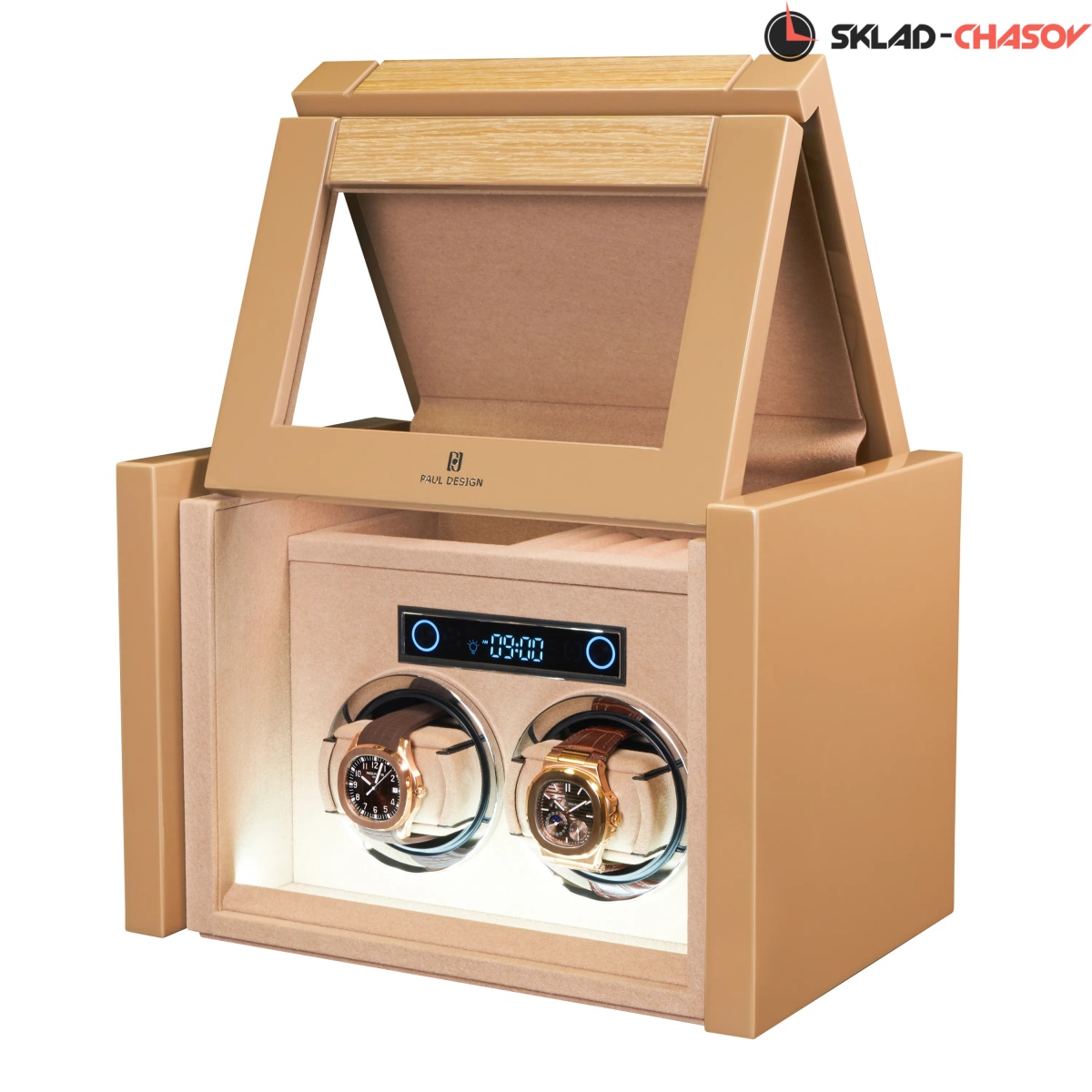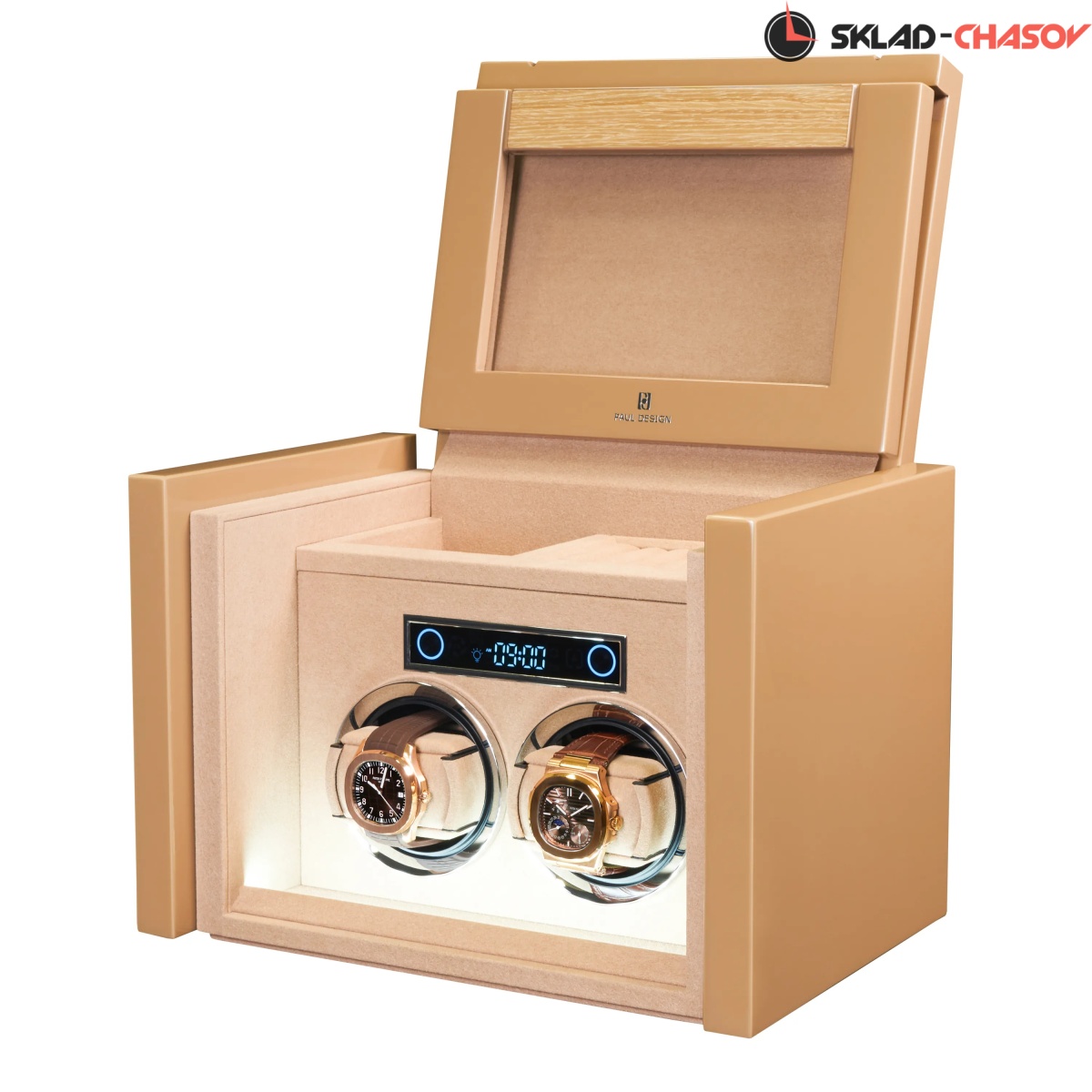 При открытии крышка удобно складывается наверх, открывая доступ к отсекам для хранения украшений и запонок. Нижняя секция — это две независимые ячейки для подзавода, каждая из которых настраивается индивидуально с помощью пульта дистанционного управления.Телескопические держатели нового поколения подстраиваются под любой размер часов. Прозрачная крышка позволяет любоваться часами, не открывая шкатулку, а светодиодная подсветка подчёркивает красоту коллекции и также включается с помощью пульта.
