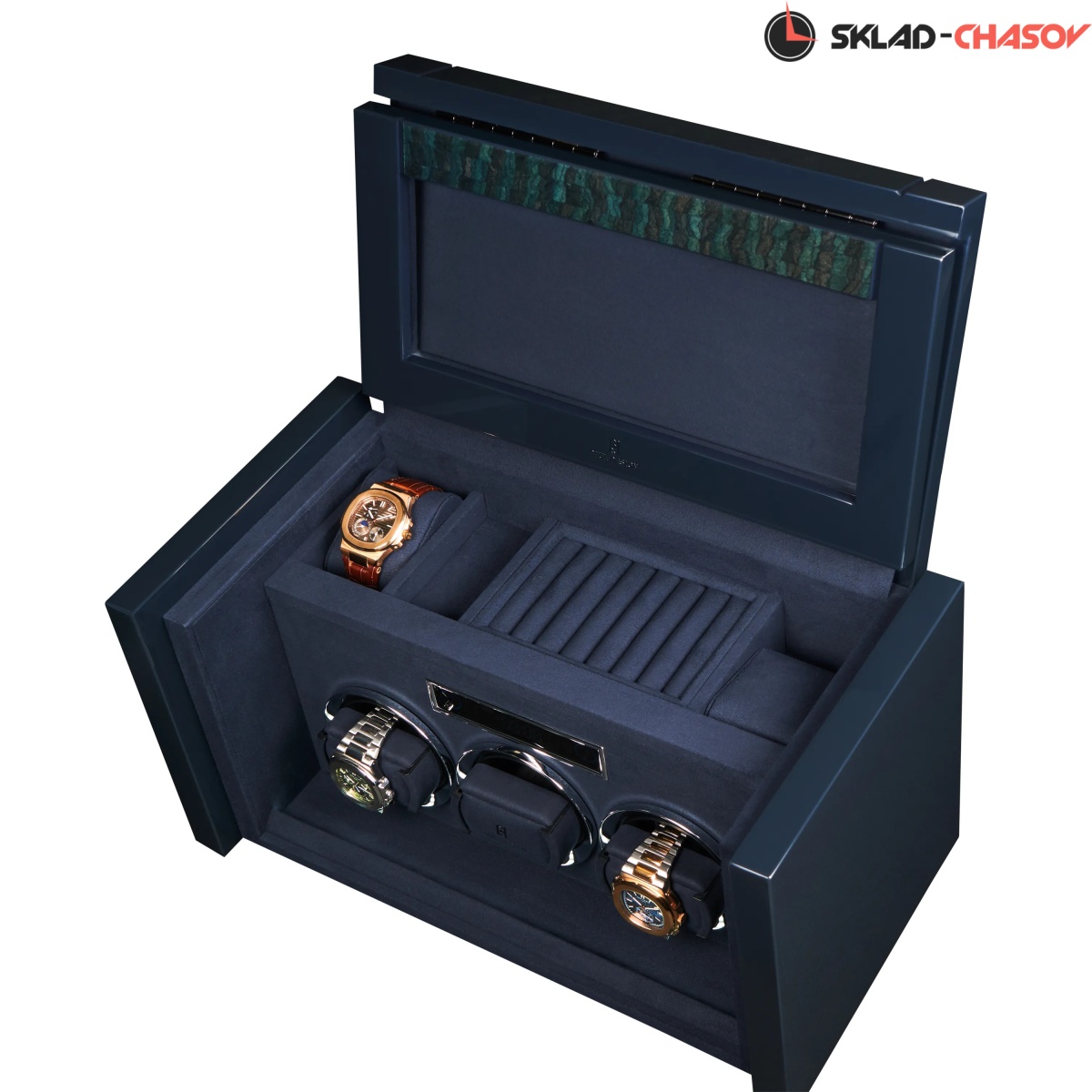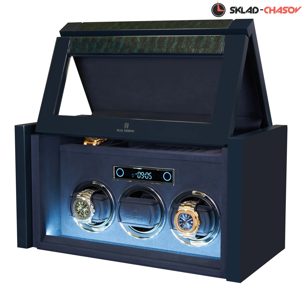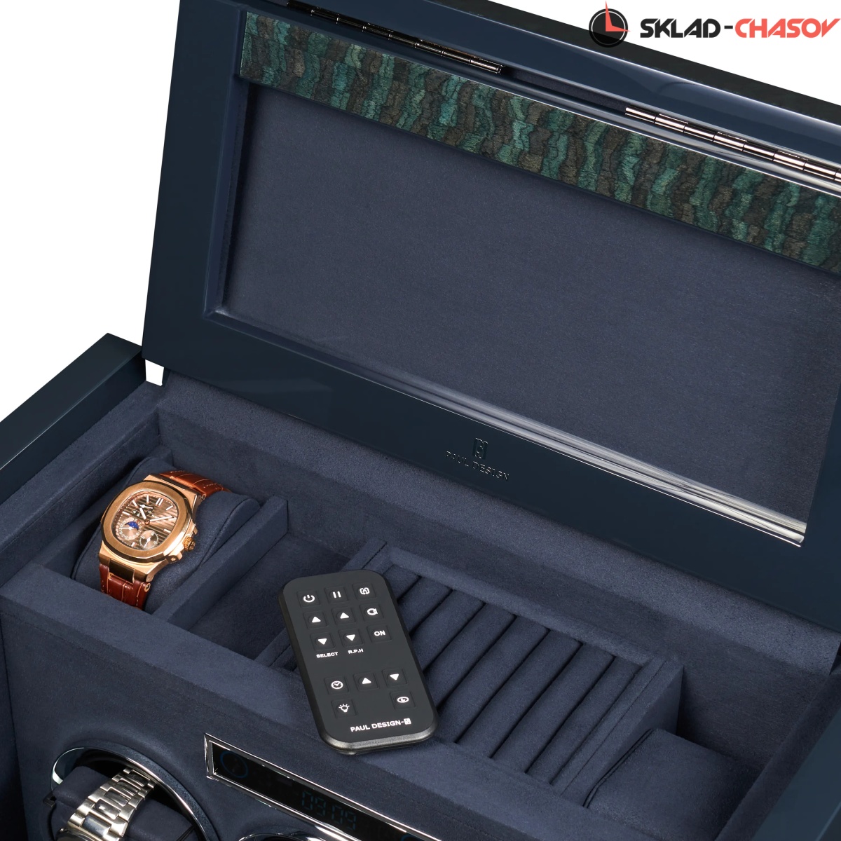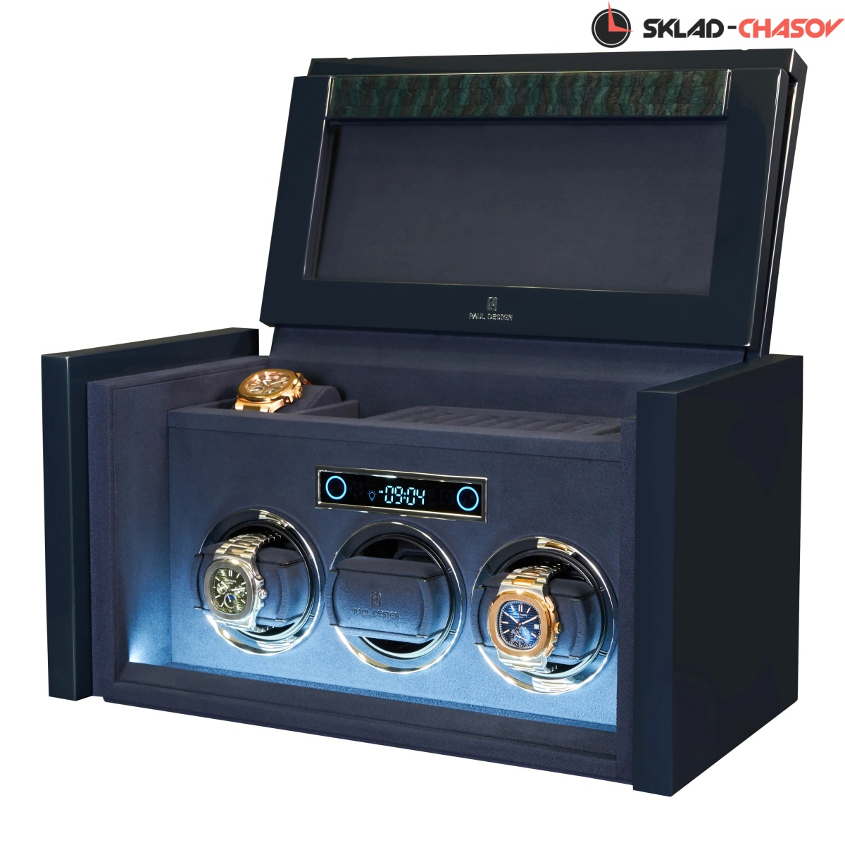 При открытии крышка удобно складывается наверх, открывая доступ к отсекам для хранения украшений, запонок и 2-х часов. Нижняя секция — это 3 независимые ячейки для подзавода, каждая из которых настраивается индивидуальнос помощью пульта дистанционного управления. Телескопические держатели нового поколения подстраиваются под любой размер часов. Прозрачная крышка позволяет любоваться часами, не открывая шкатулку, а светодиодная подсветка подчёркивает красоту коллекции и также включается с помощью пульта.
