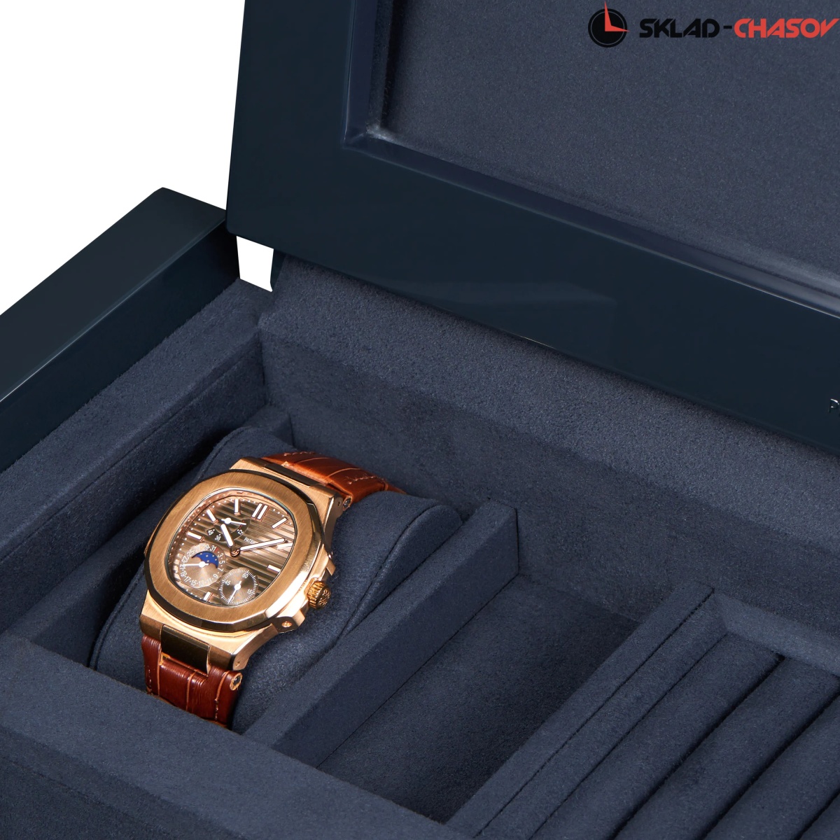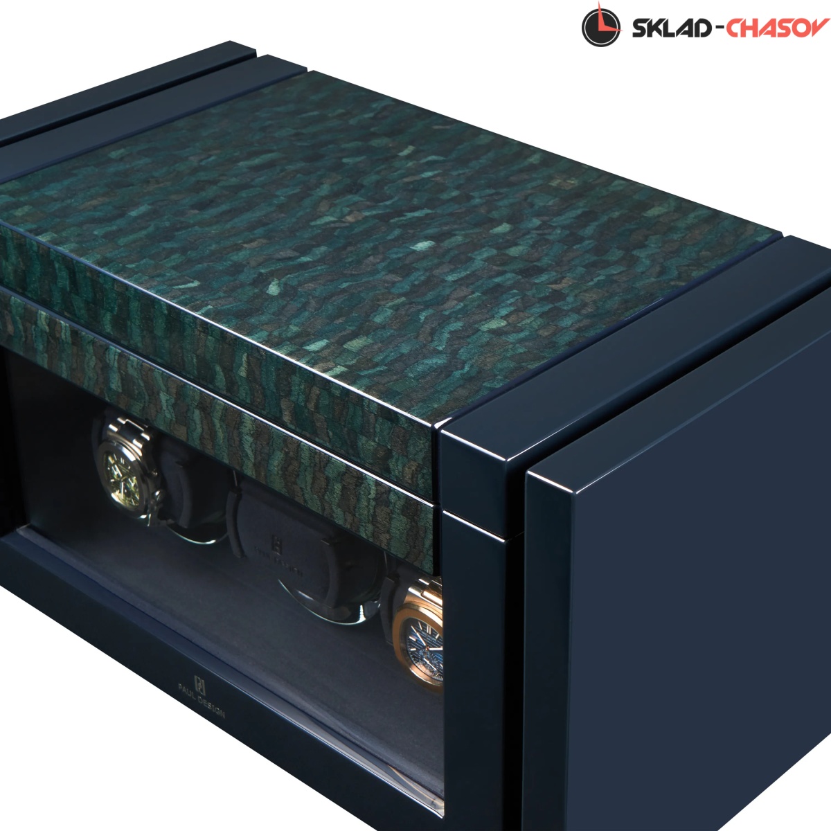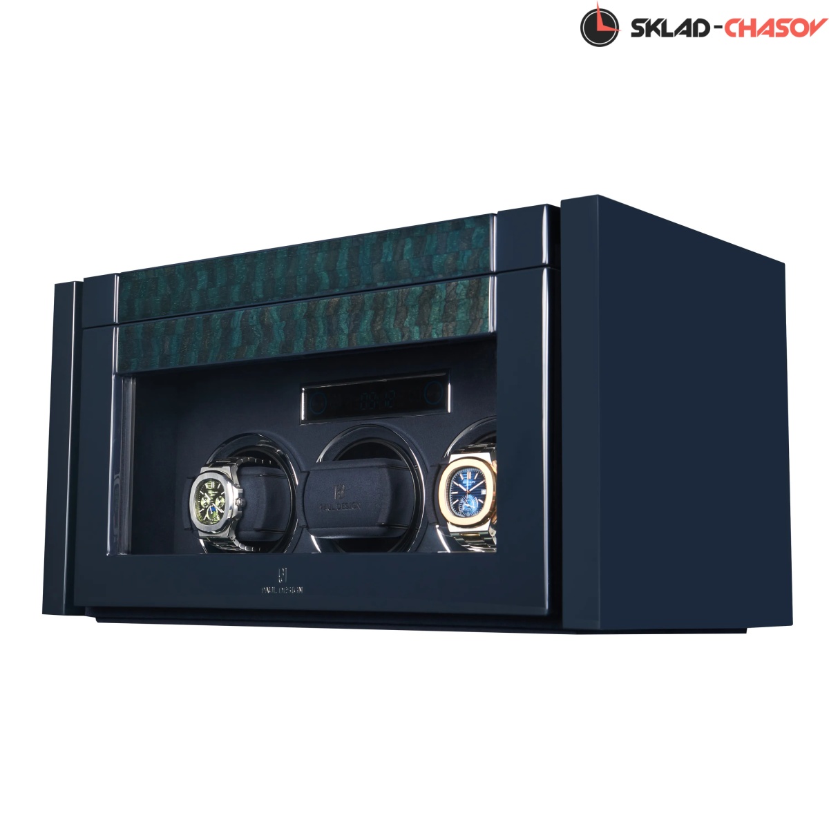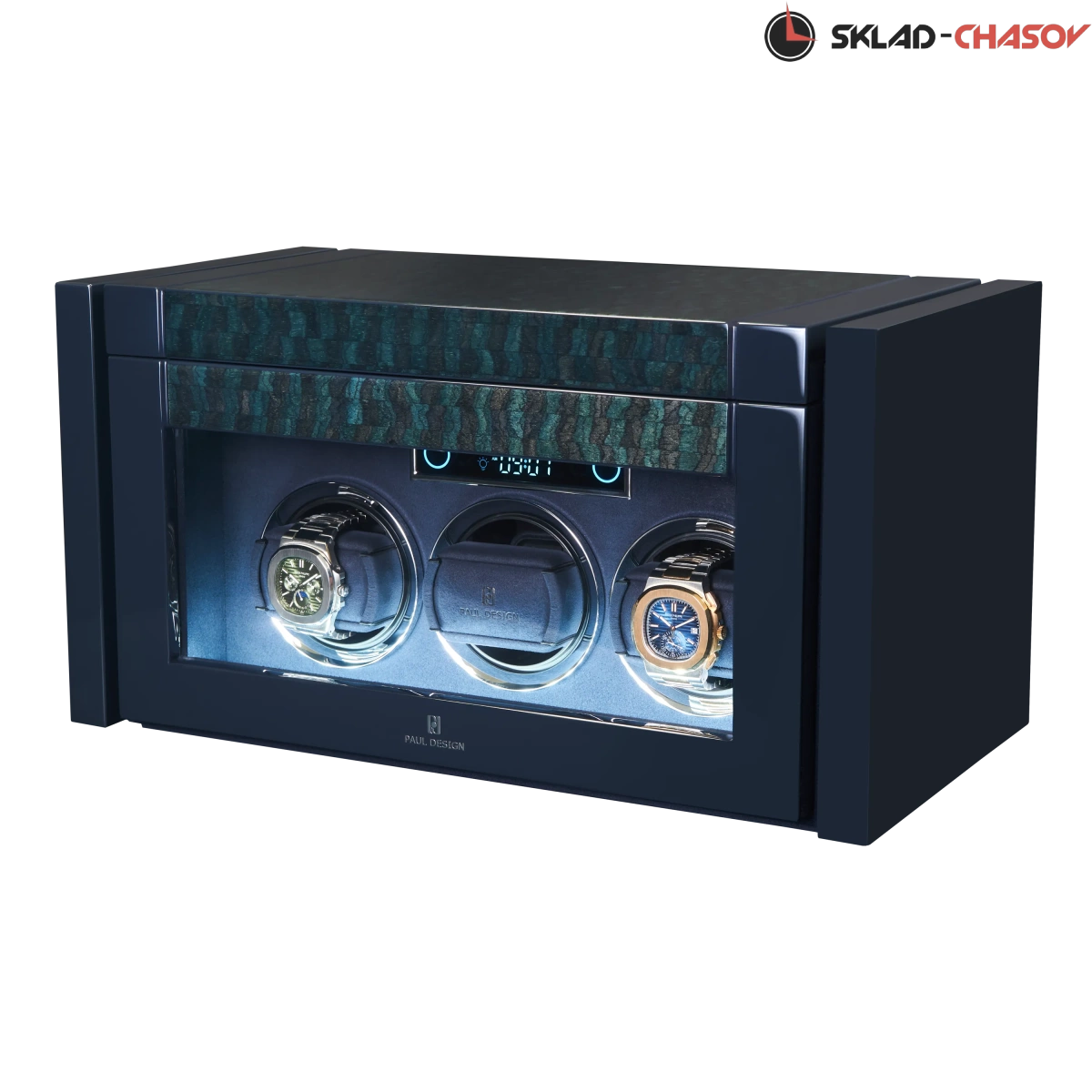 При открытии крышка удобно складывается наверх, открывая доступ к отсекам для хранения украшений, запонок и 2-х часов. Нижняя секция — это 3 независимые ячейки для подзавода, каждая из которых настраивается индивидуальнос помощью пульта дистанционного управления. Телескопические держатели нового поколения подстраиваются под любой размер часов. Прозрачная крышка позволяет любоваться часами, не открывая шкатулку, а светодиодная подсветка подчёркивает красоту коллекции и также включается с помощью пульта.