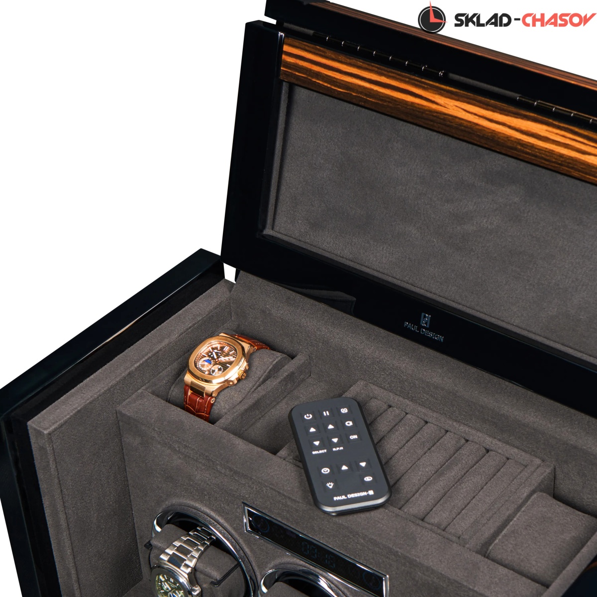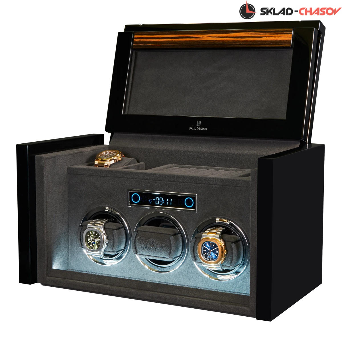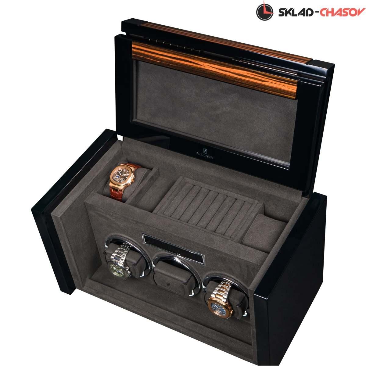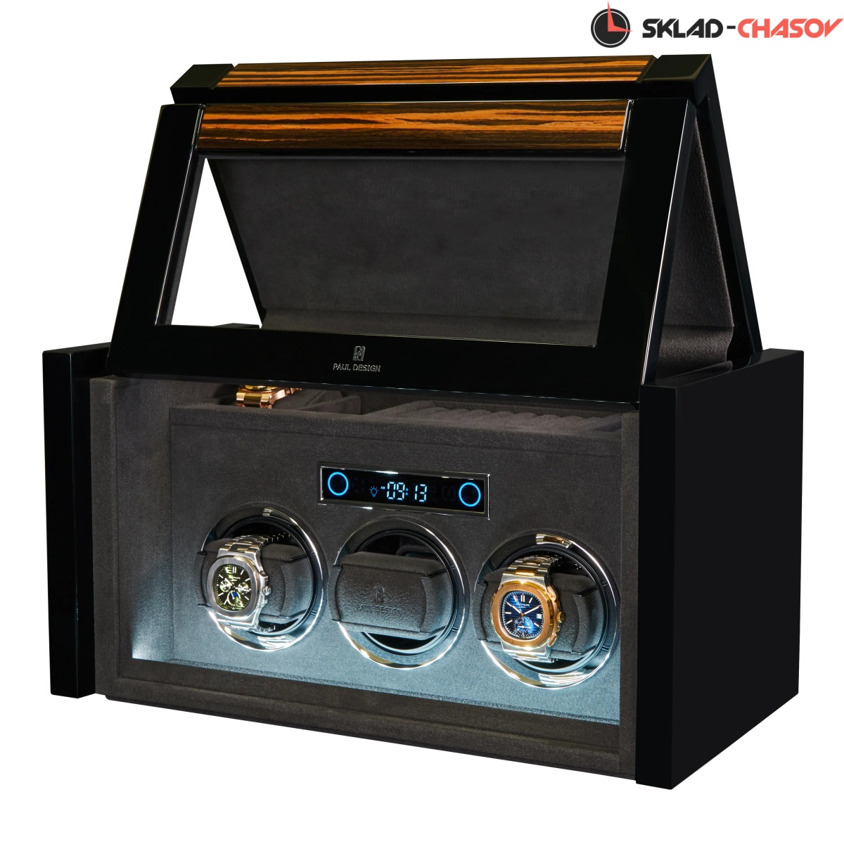 При открытии крышка удобно складывается наверх, открывая доступ к отсекам для хранения украшений, запонок и 2-х часов. Нижняя секция — это 3 независимые ячейки для подзавода, каждая из которых настраивается индивидуально с помощью пульта дистанционного управления. Телескопические держатели нового поколения подстраиваются под любой размер часов. Прозрачная крышка позволяет любоваться часами, не открывая шкатулку, а светодиодная подсветка подчёркивает красоту коллекции и также включается с помощью пульта.