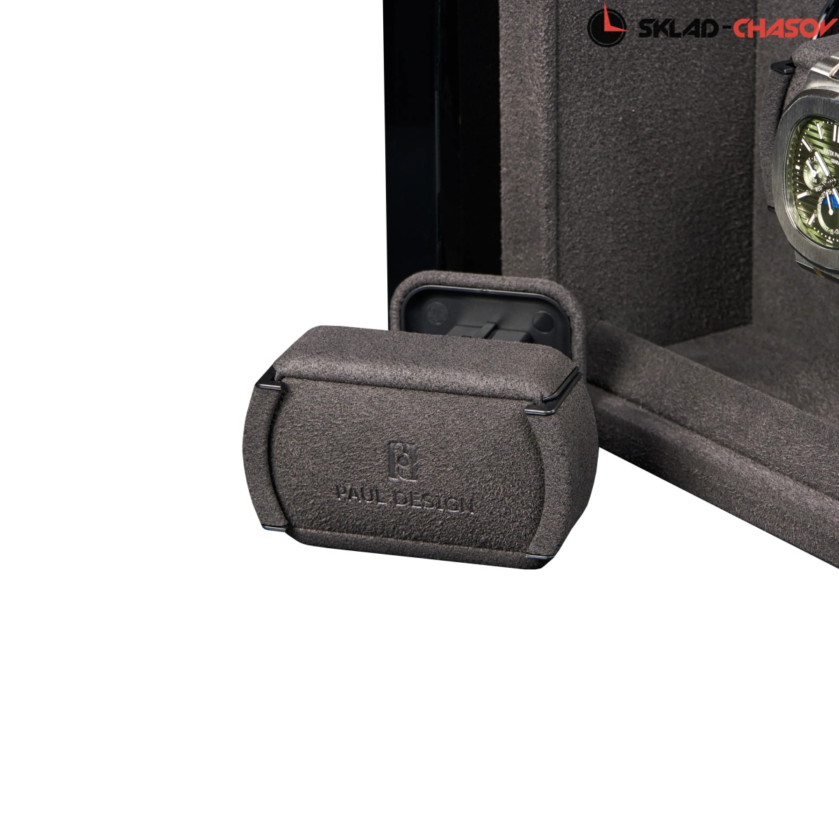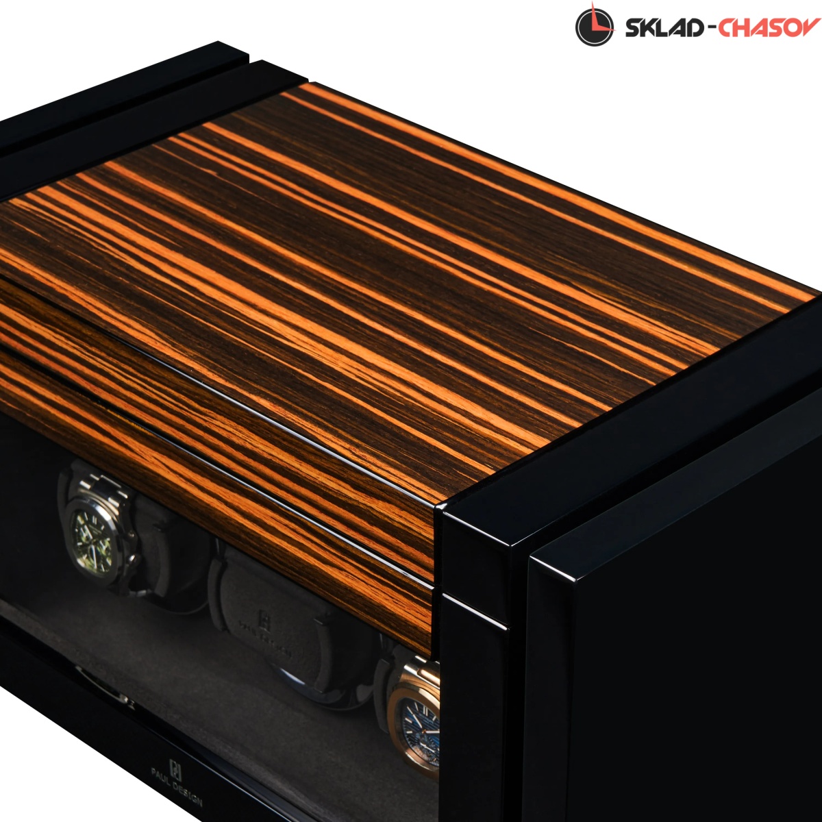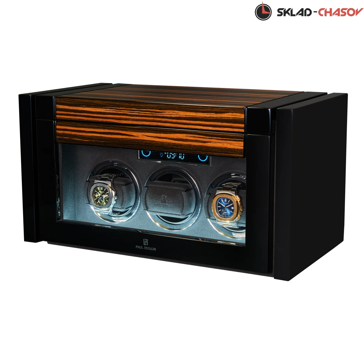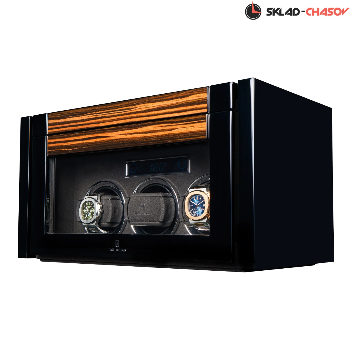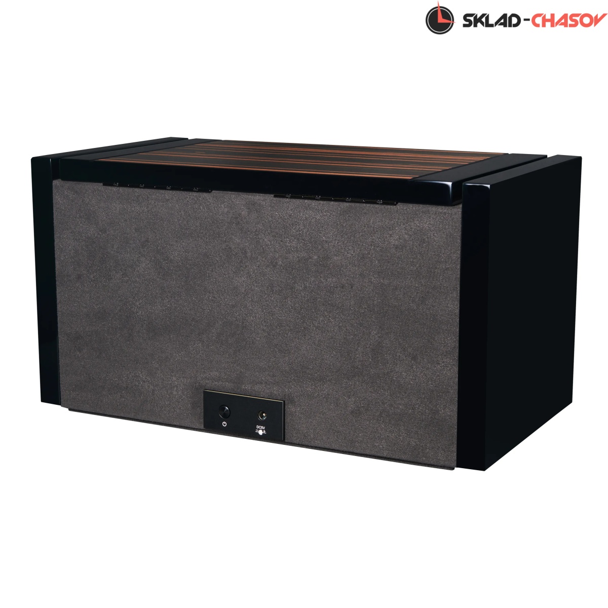При открытии крышка удобно складывается наверх, открывая доступ к отсекам для хранения украшений, запонок и 2-х часов. Нижняя секция — это 3 независимые ячейки для подзавода, каждая из которых настраивается индивидуально с помощью пульта дистанционного управления. Телескопические держатели нового поколения подстраиваются под любой размер часов. Прозрачная крышка позволяет любоваться часами, не открывая шкатулку, а светодиодная подсветка подчёркивает красоту коллекции и также включается с помощью пульта.