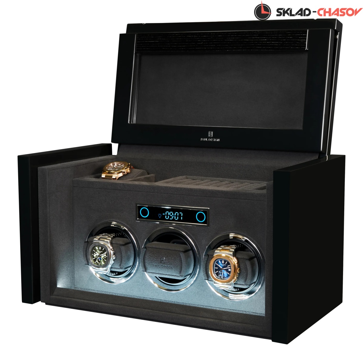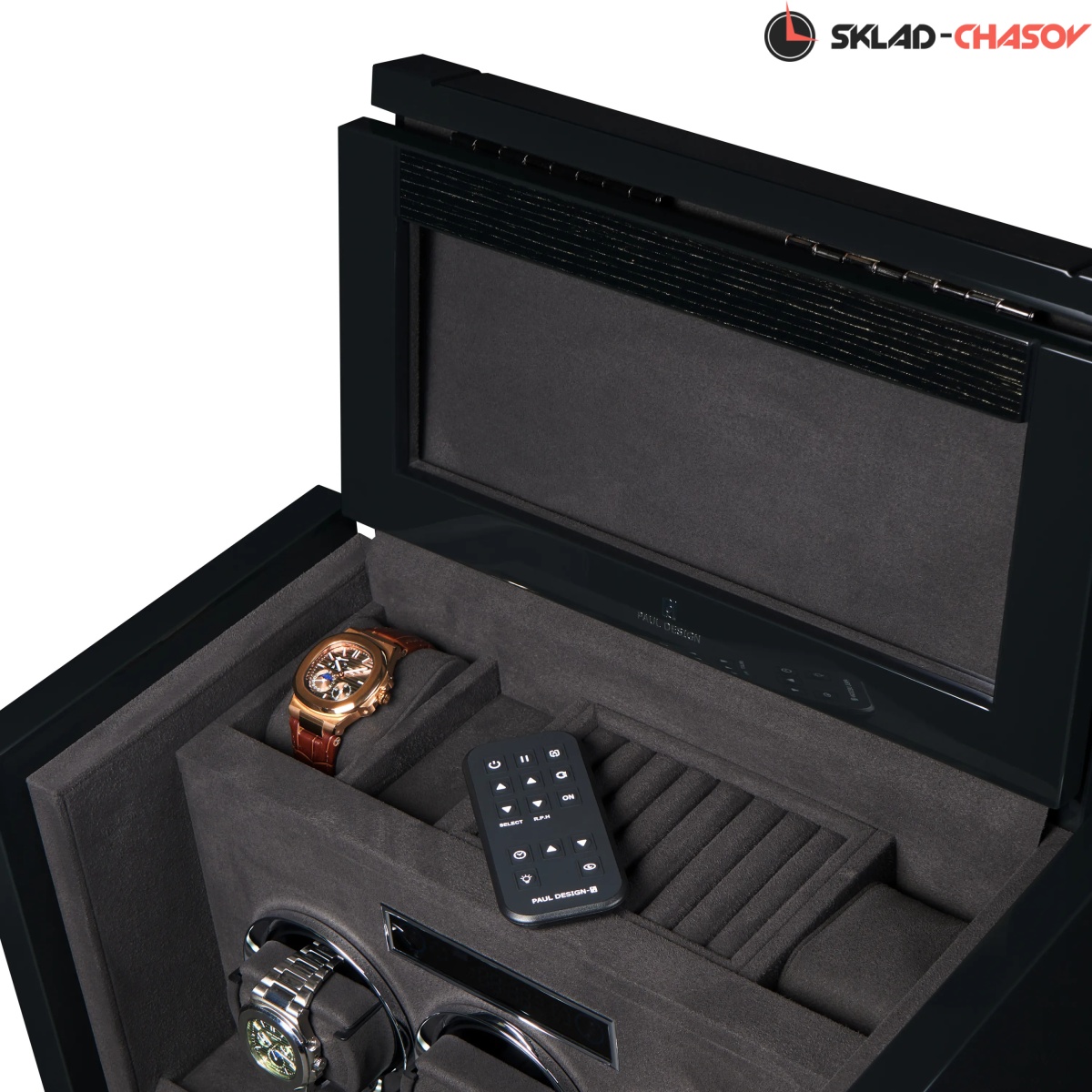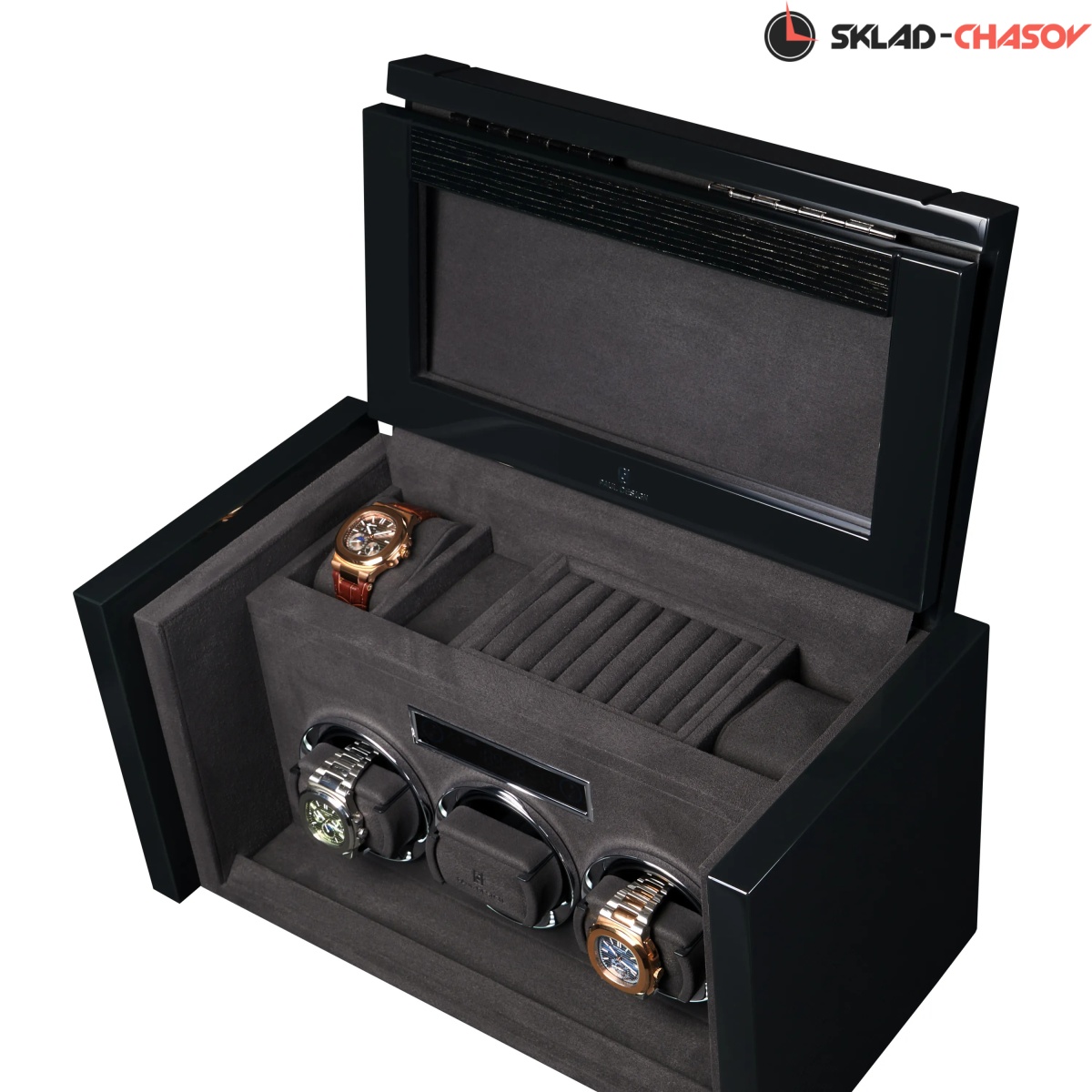 При открытии крышка удобно складывается наверх, открывая доступ к отсекам для хранения украшений, запонок и 2-х часов. Нижняя секция — это 3 независимые ячейки для подзавода, каждая из которых настраивается индивидуально с помощью пульта дистанционного управления.Телескопические держатели нового поколения подстраиваются под любой размер часов. Прозрачная крышка позволяет любоваться часами, не открывая шкатулку, а светодиодная подсветка подчёркивает красоту коллекции и также включается с помощью пульта.