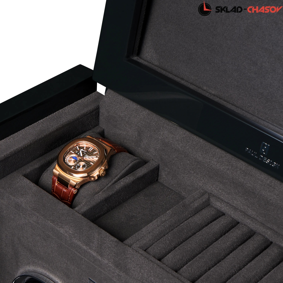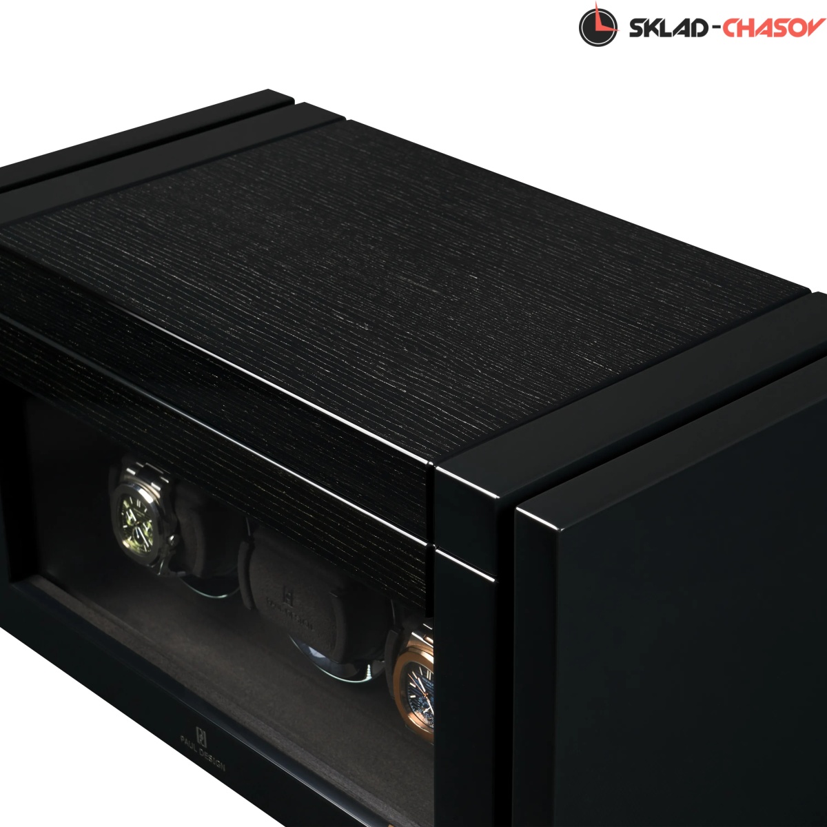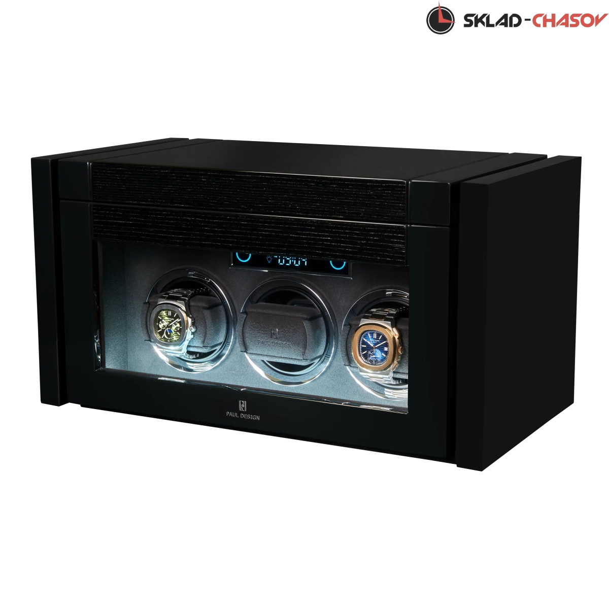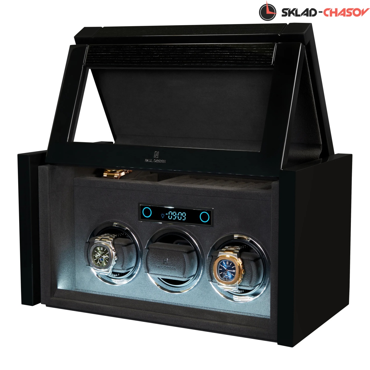 При открытии крышка удобно складывается наверх, открывая доступ к отсекам для хранения украшений, запонок и 2-х часов. Нижняя секция — это 3 независимые ячейки для подзавода, каждая из которых настраивается индивидуально с помощью пульта дистанционного управления.Телескопические держатели нового поколения подстраиваются под любой размер часов. Прозрачная крышка позволяет любоваться часами, не открывая шкатулку, а светодиодная подсветка подчёркивает красоту коллекции и также включается с помощью пульта.