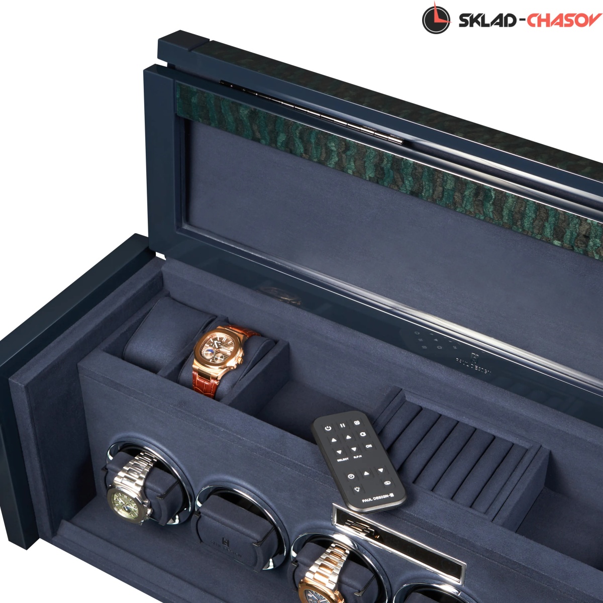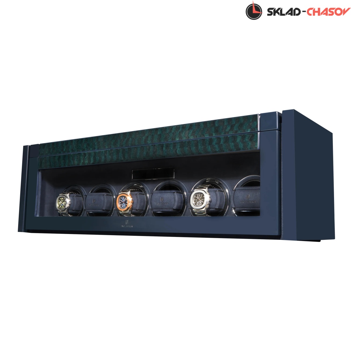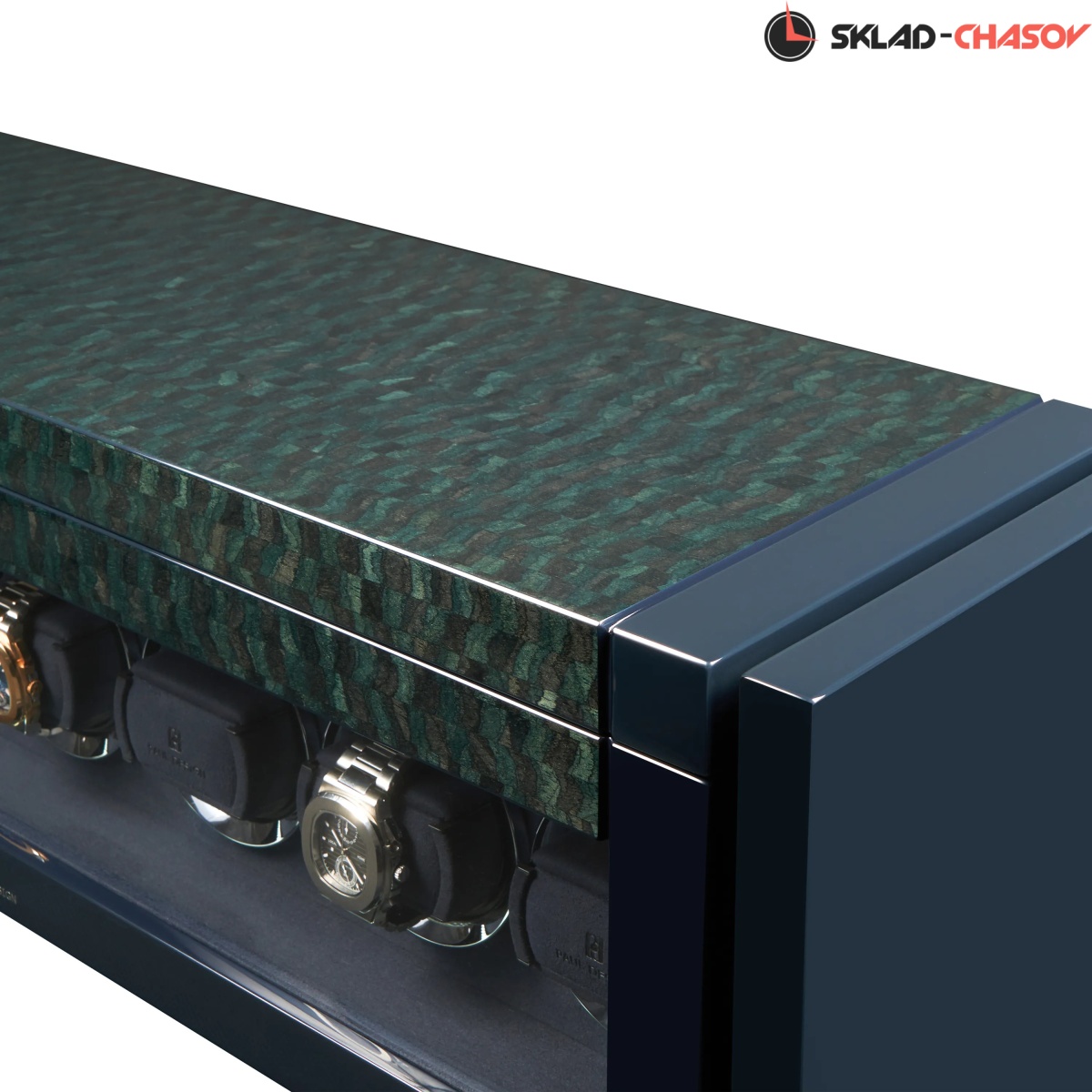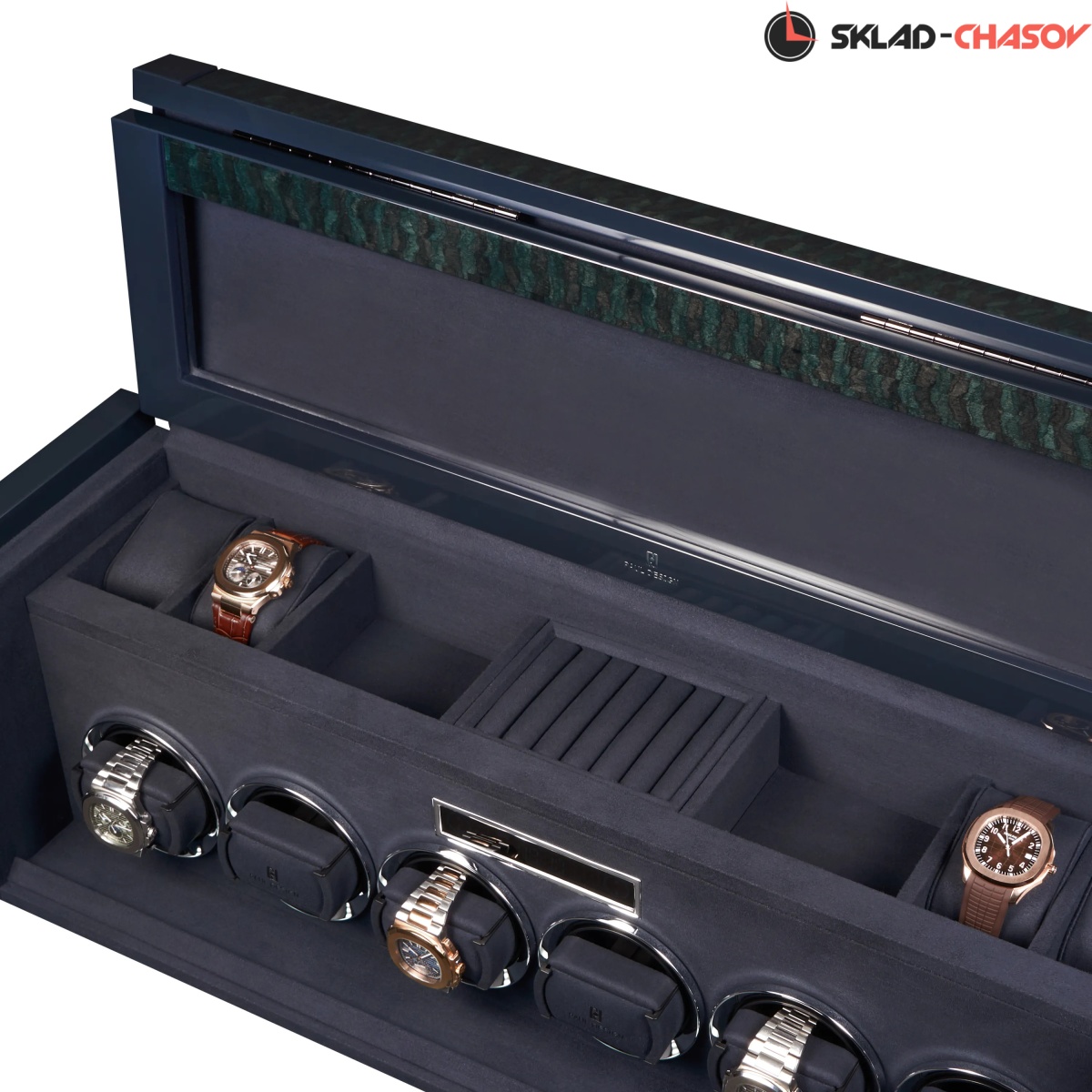 Шкатулка с автоподзаводом Othello 6 AB для автоподзавода 6-ти часов с дополнительным хранением сочетает в себе инновационный дизайн и безупречную функциональность. Экстерьер выполнен из дерева со вставками из синего агата и покрыт рояльным лаком насыщенного синего цвета. В интерьере используется мягкий бархат в едином гармоничном цветовом решении. 6 серебристых безелей элегантно обрамляют ячейки автоподзавода.