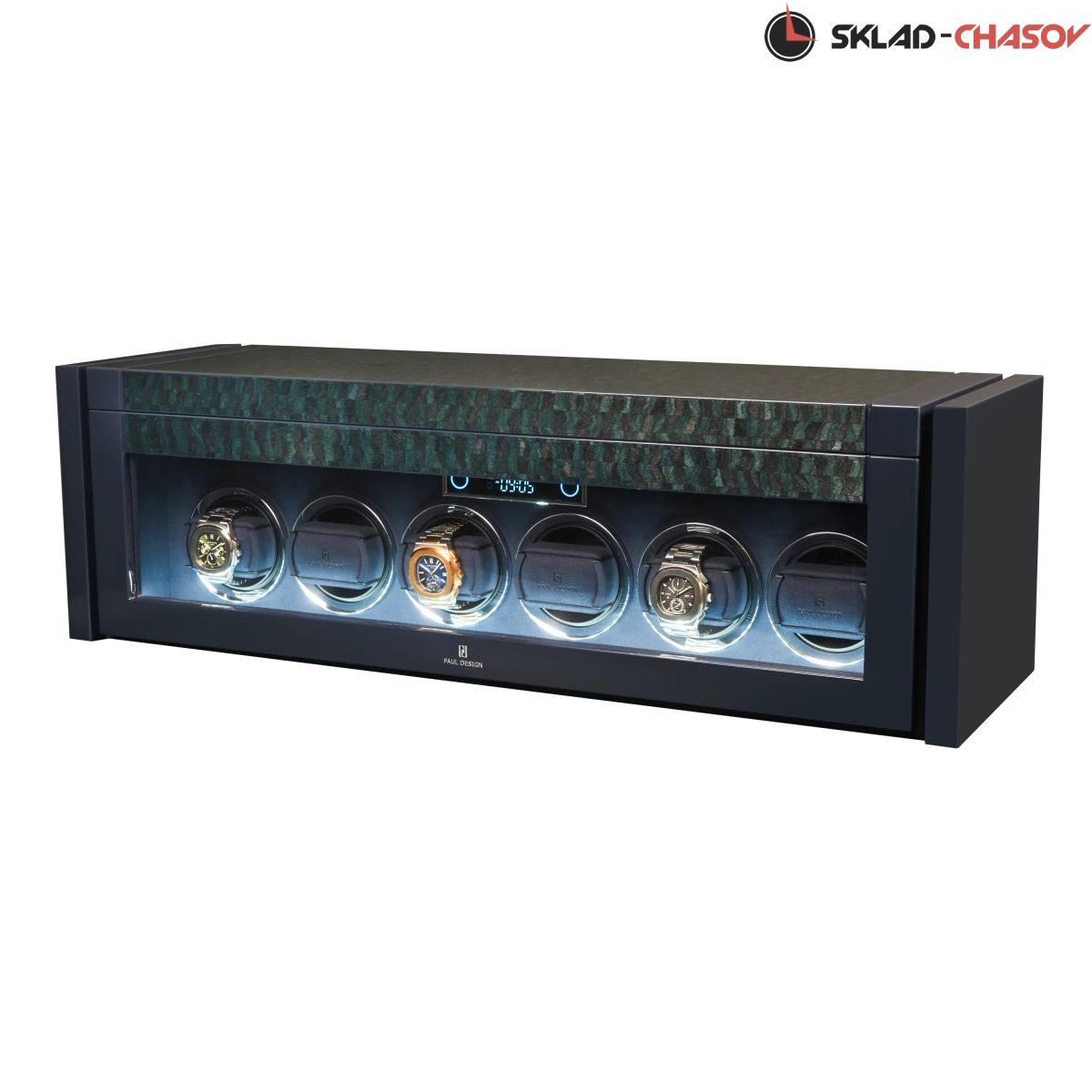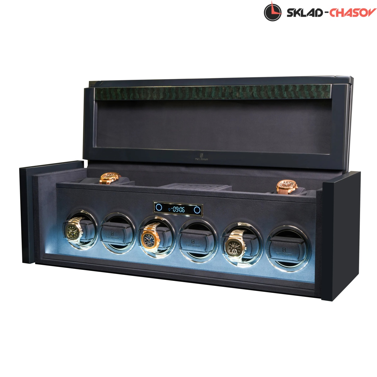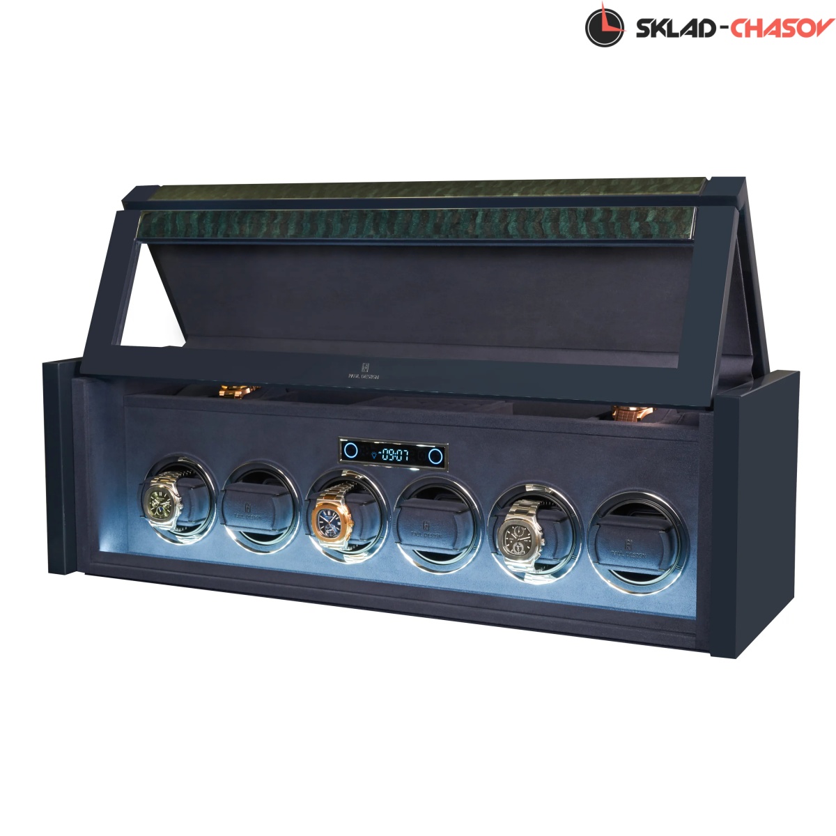 При открытии крышка удобно складывается наверх, открывая доступ к отсекам для хранения украшений, запонок и 4-ех часов. Нижняя секция — это 6 независимых ячеек для подзавода, каждая из которых настраивается индивидуально с помощью пульта дистанционного управления.Телескопические держатели нового поколения подстраиваются под любой размер часов. Прозрачная крышка позволяет любоваться часами, не открывая шкатулку, а светодиодная подсветка подчёркивает красоту коллекции и также включается с помощью пульта.