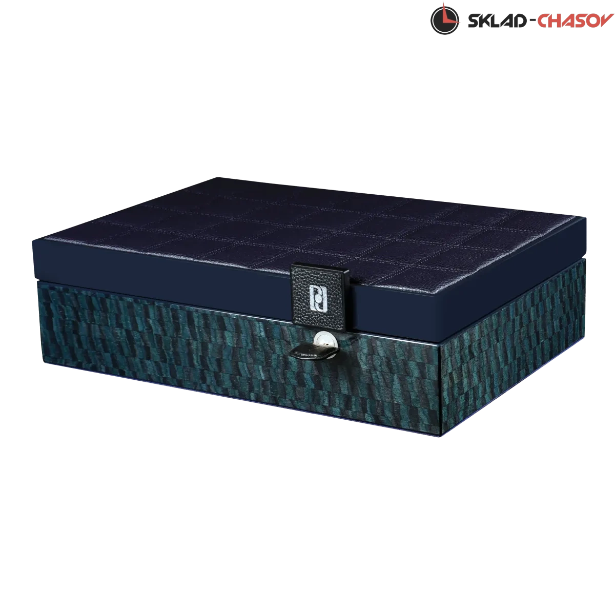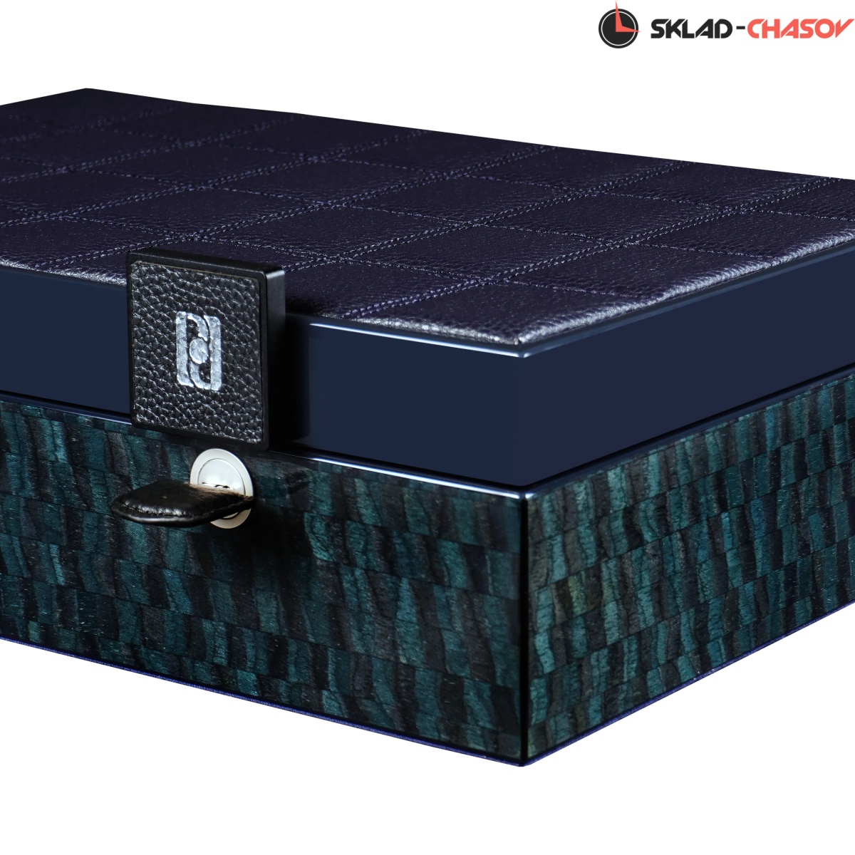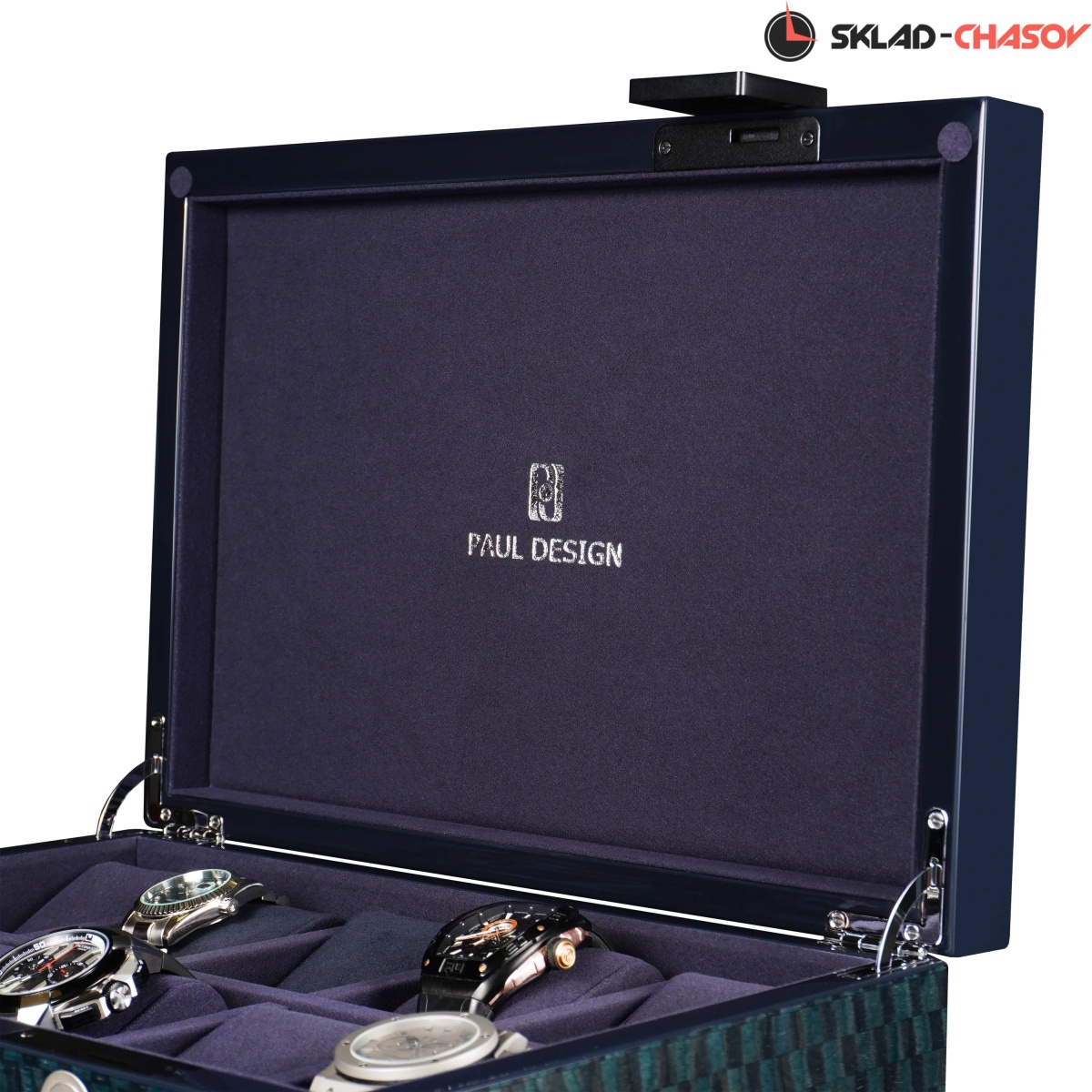 Новая, элегантная и роскошная шкатулка от легендарного бренда Paul Design для хранения 10-ти часов. Выполнена в необычной синей гамме: верхняя часть обтянута натуральной итальянской кожей с изысканным ромбовидным тиснением, нижняя часть — из синего агата. Закрывается на замок с кожаной оплёткой; фирменный логотип PD украшает внешний фиксатор. Внутри шкатулка отделана мягкой микрофиброй в тон экстерьера, которая бережно сохраняет ваши часы в идеальном состоянии. Держатели нового поколения подходят для часов с любой длиной ремешка или браслета. В комплекте — ключ в отдельном чехле. Упаковка — подарочная, фирменная, чёрного цвета, с логотипом бренда.