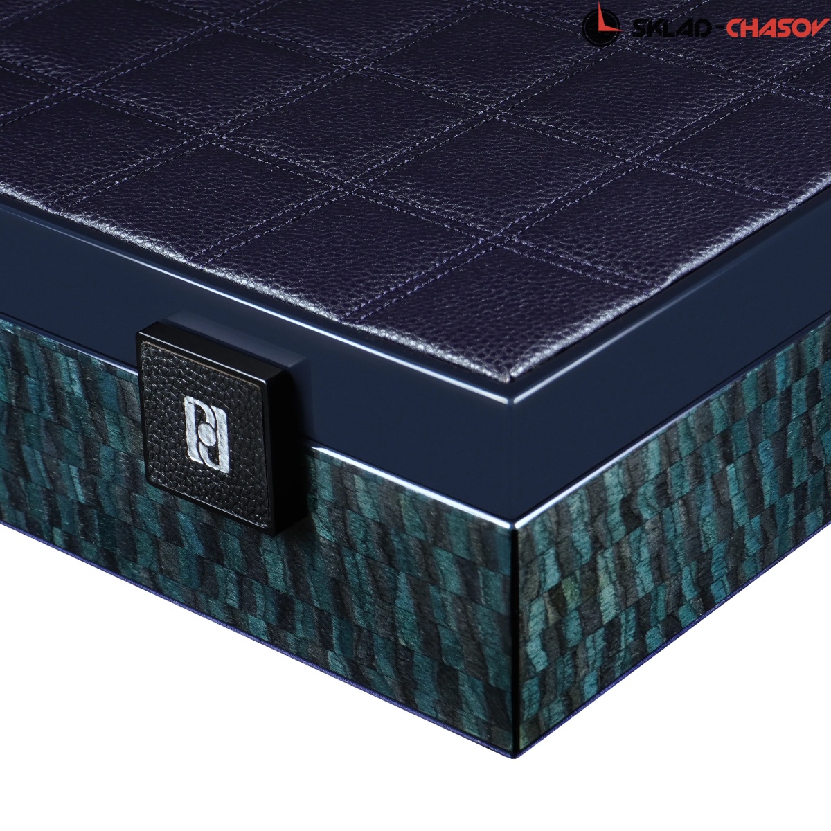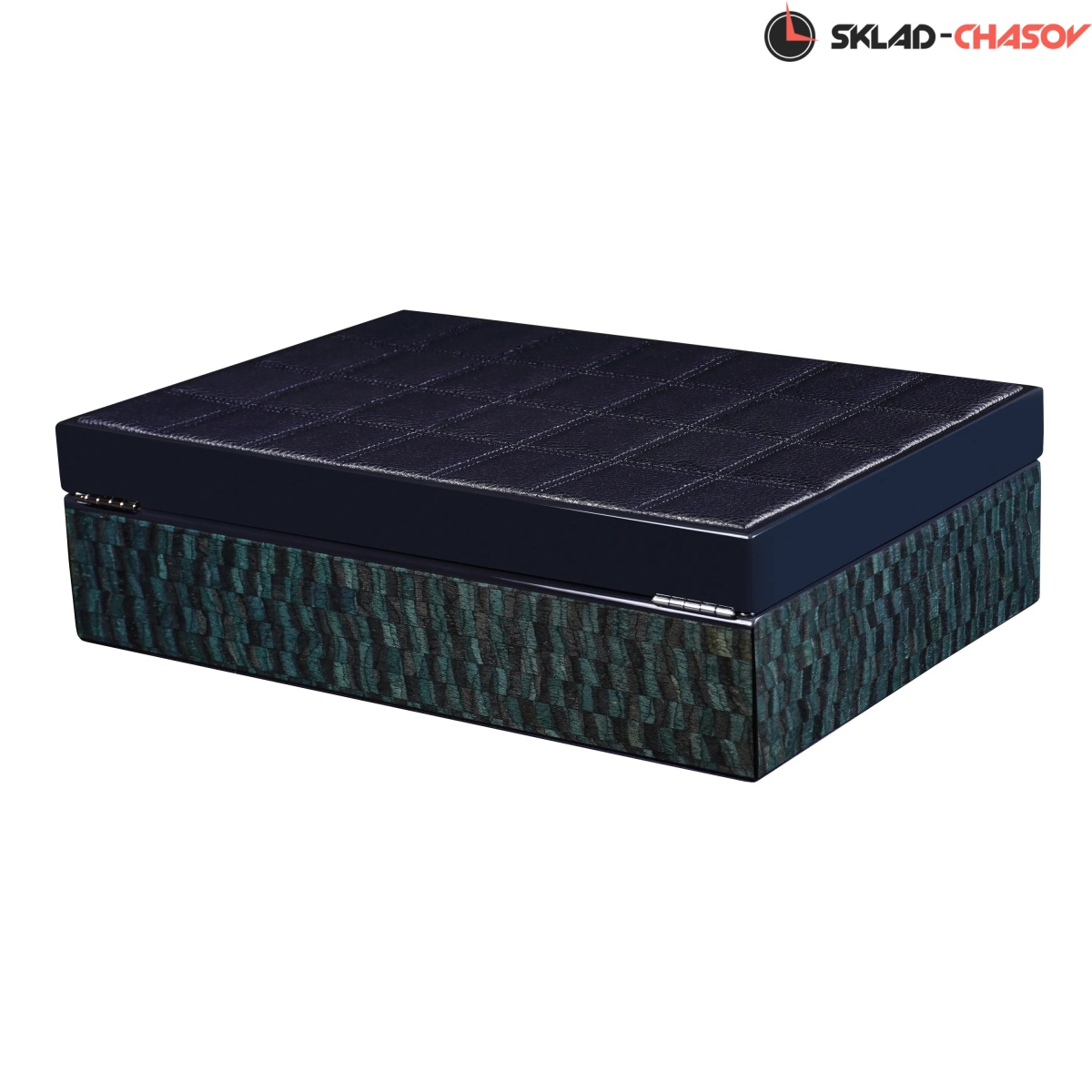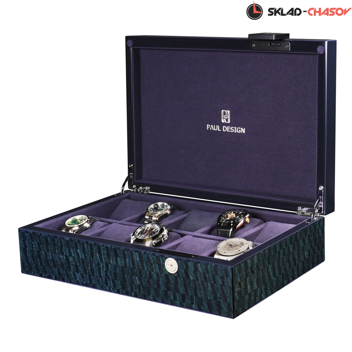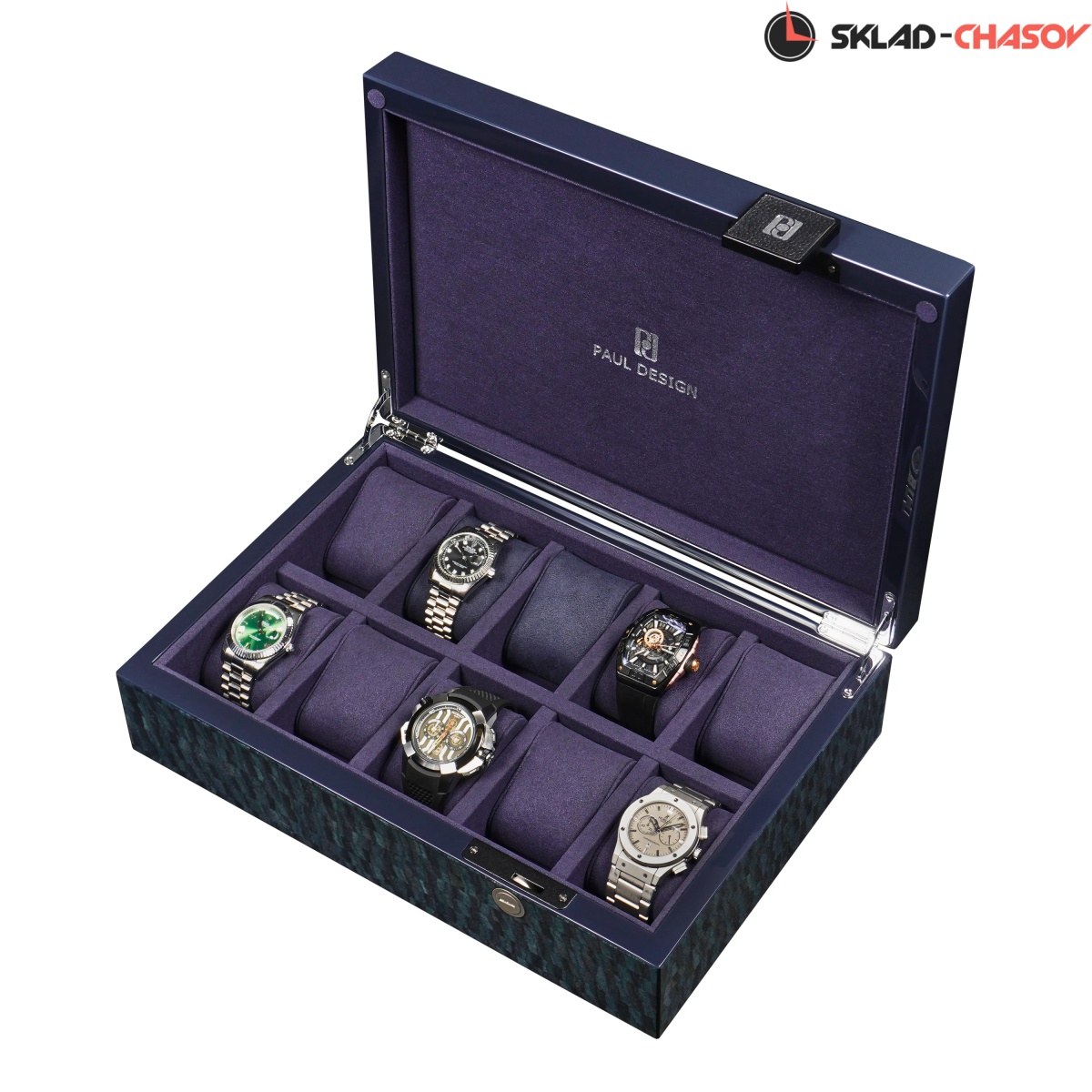 Новая, элегантная и роскошная шкатулка от легендарного бренда Paul Design для хранения 10-ти часов. Выполнена в необычной синей гамме: верхняя часть обтянута натуральной итальянской кожей с изысканным ромбовидным тиснением, нижняя часть — из синего агата. Закрывается на замок с кожаной оплёткой; фирменный логотип PD украшает внешний фиксатор. Внутри шкатулка отделана мягкой микрофиброй в тон экстерьера, которая бережно сохраняет ваши часы в идеальном состоянии. Держатели нового поколения подходят для часов с любой длиной ремешка или браслета. В комплекте — ключ в отдельном чехле. Упаковка — подарочная, фирменная, чёрного цвета, с логотипом бренда.
