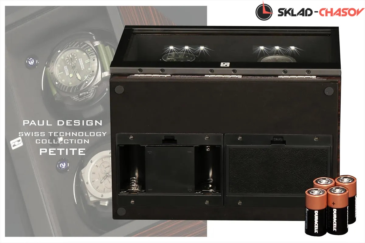 Для удобства виндер работает как от сети 220 В, так и от двух батареек класса C, что делает его универсальным и мобильным решением. Верхняя светодиодная подсветка, включаемая кнопкой на задней панели, эффектно подчёркивает красоту коллекции.