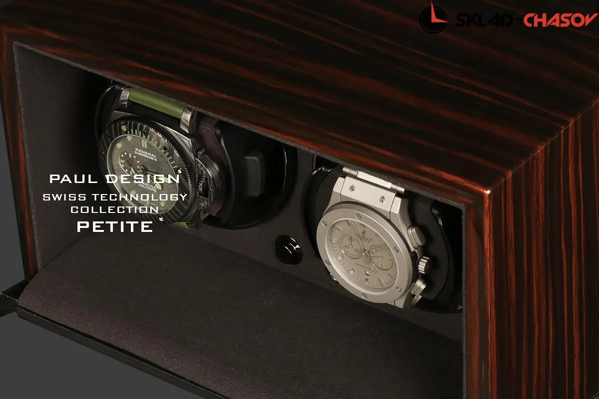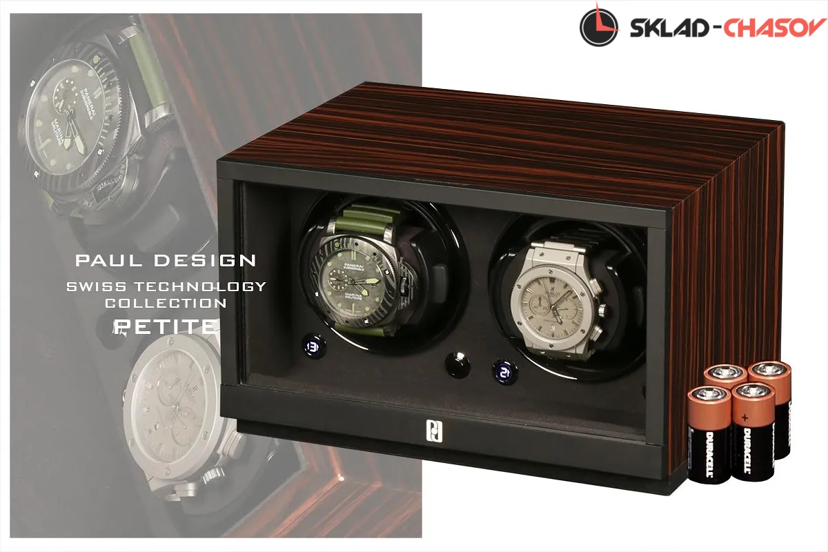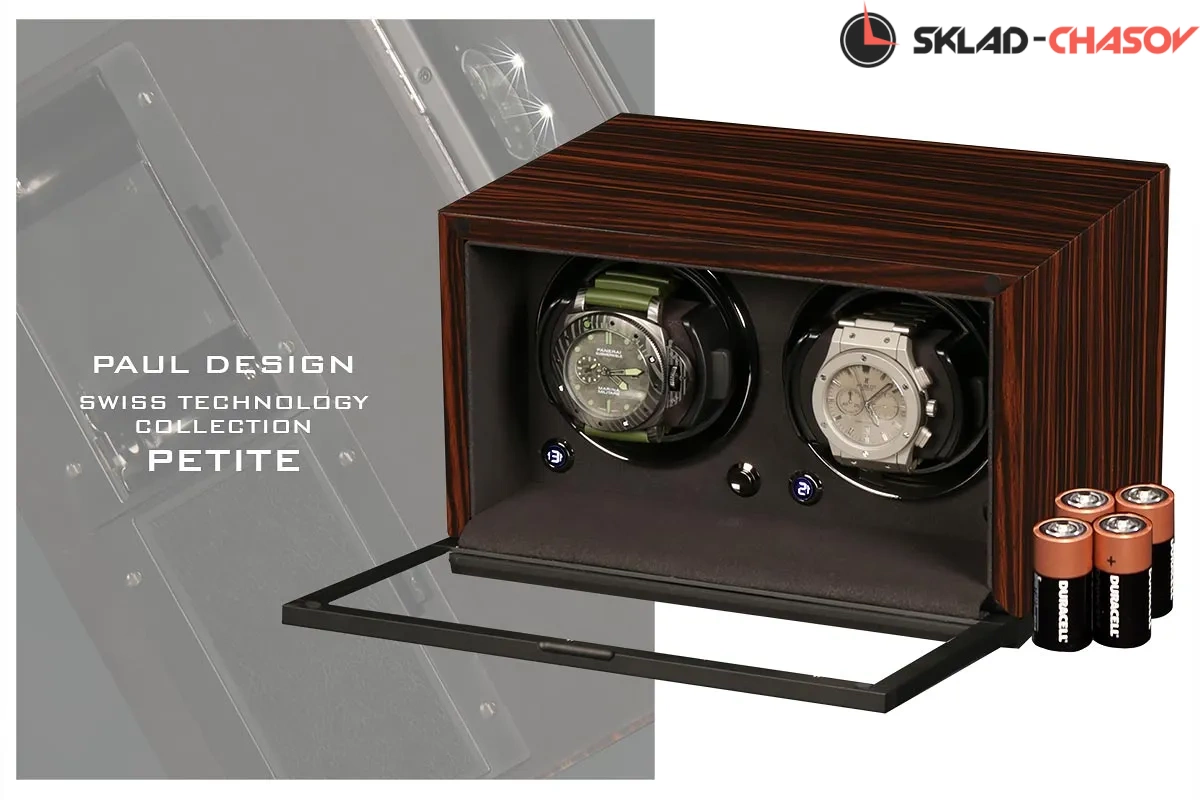 Элегантный виндер для автоподзавода 2-х часов Petite 2D MAC-K от Paul Design сочетает в себе утончённый дизайн и современную функциональность. Корпус выполнен из дерева «макассар» и покрыт рояльным лаком, придающим поверхности изысканный глянец и подчёркивающим благородство материала. Внутреннее пространство отделано мягкой микрофиброй графитового оттенка, которая бережно сохраняет часы и создаёт гармоничный контраст с тёплой фактурой древесины.