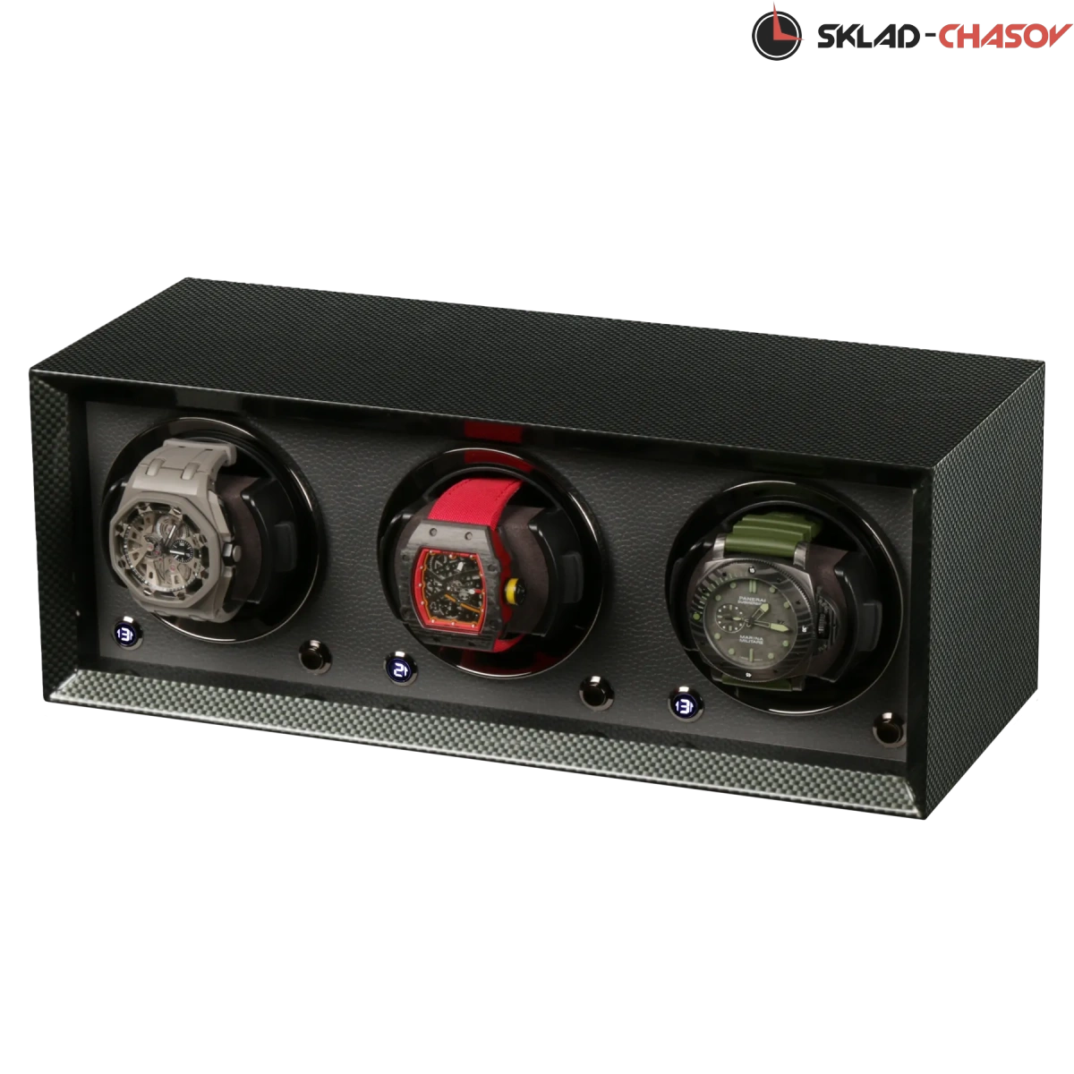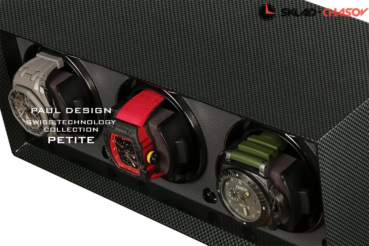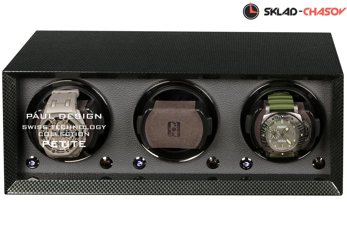 Элегантный виндер для автоподзавода 3-х часов Petite 3 CF-K от Paul Design сочетает в себе утончённый дизайн и современную функциональность. Корпус выполнен из дерева с отделкой из карбона и покрыт рояльным лаком, придающим поверхности изысканный глянец и подчёркивающим благородство материала. Внутреннее пространство выполнено в коже серого цвета.