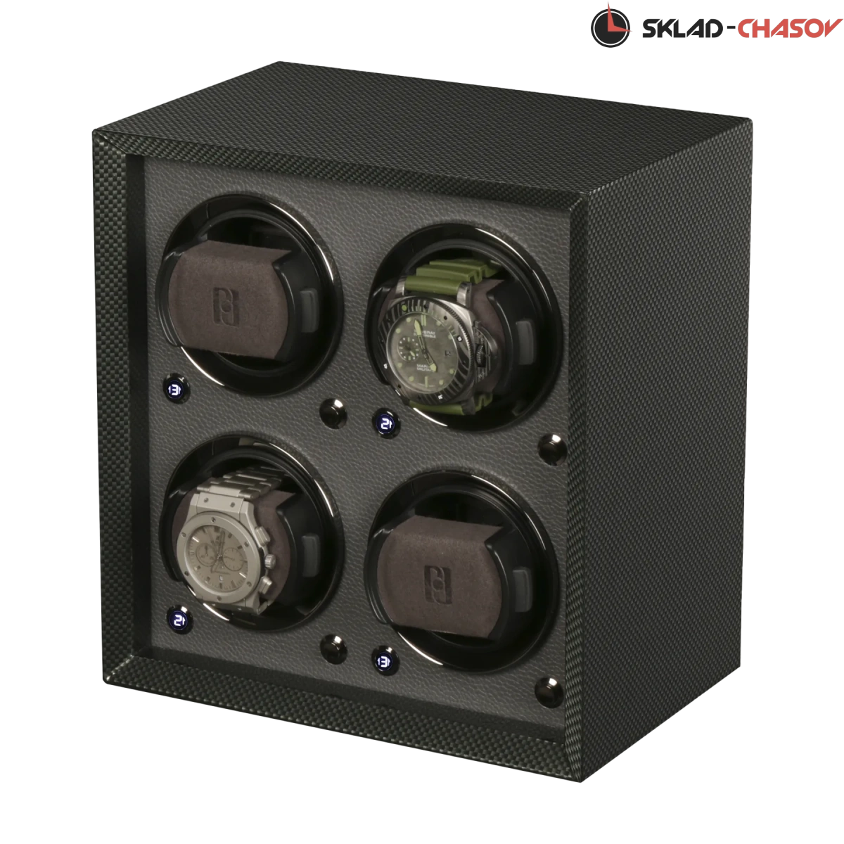Модель оснащена системой автоподзавода для 4-х часов с возможностью индивидуальной настройки каждой ячейки. С помощью удобного дисплея доступны три направления вращения и шесть режимов количества оборотов в сутки — 600, 900, 1200, 1500, 1800 или 2100, что обеспечивает идеальный уход за часами любого класса.