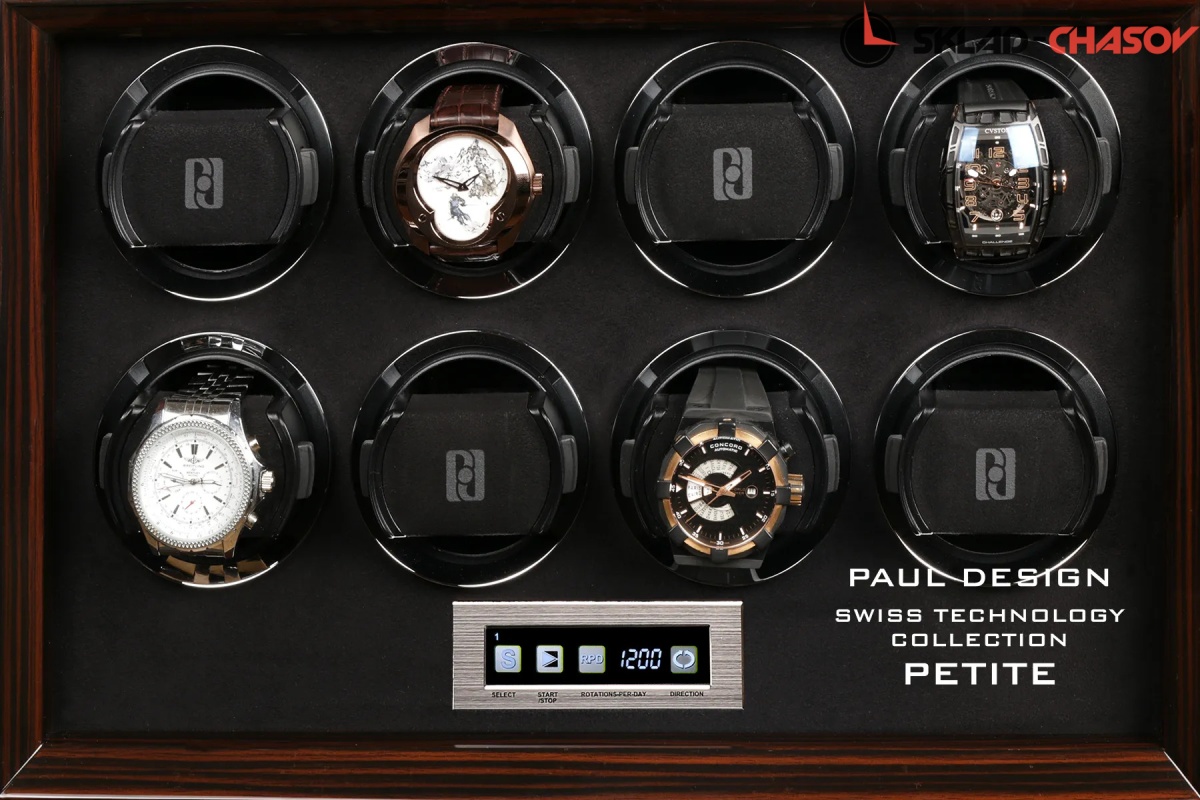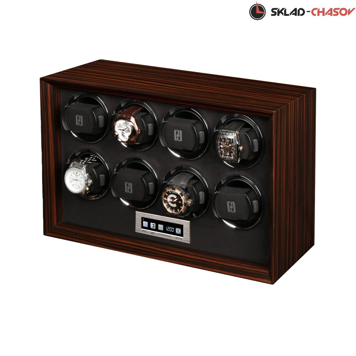 Модель оснащена системой автоподзавода для 8-ми часов с возможностью индивидуальной настройки каждой ячейки. С помощью удобного дисплея доступны три направления вращения и шесть режимов количества оборотов в сутки — 600, 900, 1200, 1500, 1800 или 2100, что обеспечивает идеальный уход за часами любого класса.