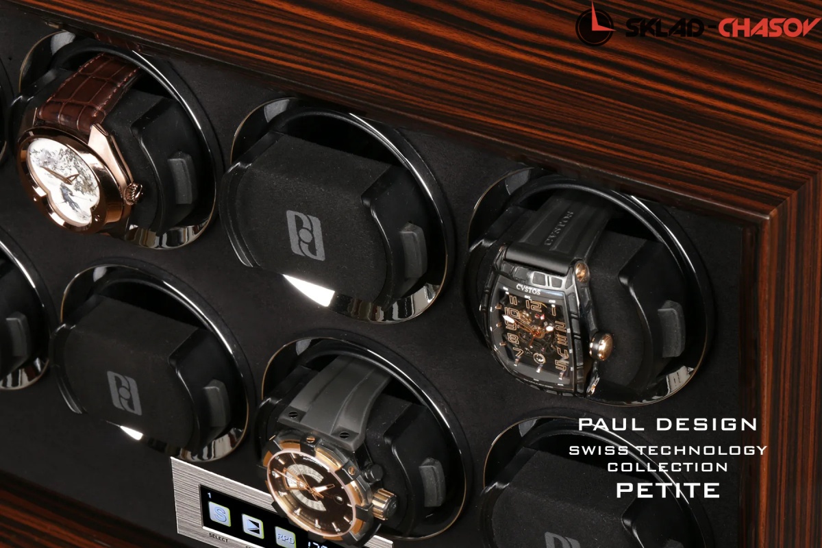Элегантная шкатулка для автоподзавода 8-ми часов Petite 8 MAC от Paul Design сочетает изысканный дизайн и современные технологии. Корпус выполнен из дерева макассар и покрыт рояльным лаком, который придаёт поверхности безупречный глянец и утончённую современную эстетику. Внутреннее пространство выполнено в лаконичном чёрном цвете.