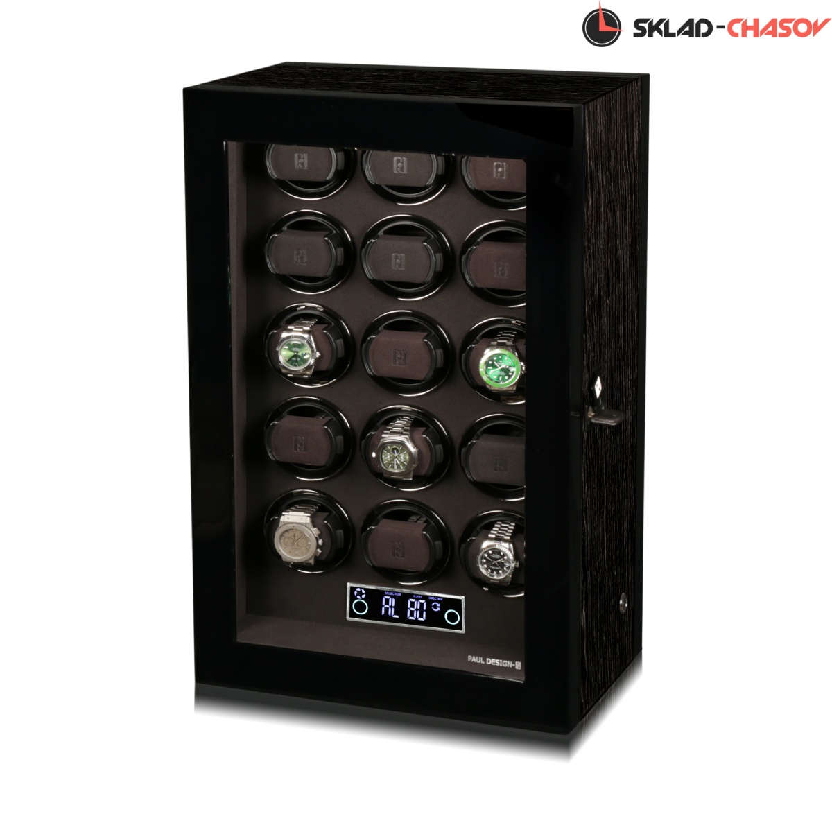 Новая модель для подзавода 15 часов с новым инновационным открытием (отпечаток пальца, с возможностью запрограммировать до 5 отпечатков). Корпус выполнен из двух благородных пород дерева (чёрное Венге и дерево темный бамбук), внутри выстлано практичной микрофиброй. Новые и самые удобные держатели позволяют без труда фиксировать ваши часы под любой размер запястья с внутренним фиксатором. Современный сенсорный экран позволяет настраивать под любые часы, любой сложности (все возможные регулировки), пульт даёт возможность регулировки отдельно на каждые часы. Встроенные часы на табло. Светодиодная подсветка, алюминиевые красивые рамки для часов, отдельная кнопка вкл/выкл подсветки. Фирменная подарочная коробка PD. Лучшая цена — за лучшую шкатулку!