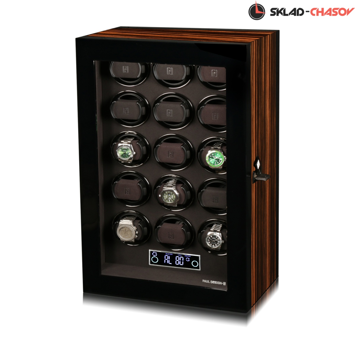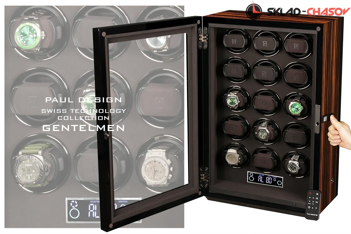 Новая модель для подзавода 15 часов с новым инновационным открытием (отпечаток пальца, с возможностью запрограммировать до 5 отпечатков). Корпус выполнен из двух благородных пород дерева (чёрное Венге и дерево макасар), внутри выстлано практичной микрофиброй. Новые и самые удобные держатели позволяют без труда фиксировать ваши часы под любой размер запястья с внутренним фиксатором. Современный сенсорный экран позволяет настраивать под любые часы, любой сложности (все возможные регулировки), пульт даёт возможность регулировки отдельно на каждые часы. Встроенные часы на табло. Светодиодная подсветка, алюминиевые красивые рамки для часов, отдельная кнопка вкл/выкл подсветки. Фирменная подарочная коробка PD. Лучшая цена — за лучшую шкатулку!
