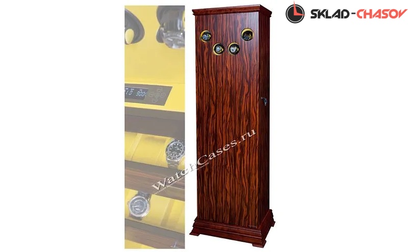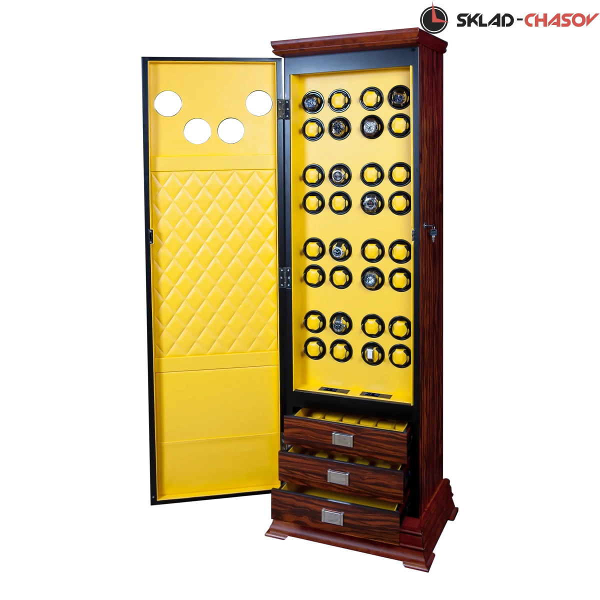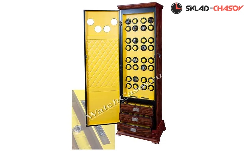 Шкаф (заводной шкаф) коричневого цвета от компании ALTITUDE предназначен для хранения и автоматической заводки 32-х часов, имеется три ящика для хранения часов, ювелирных украшений или документов. Лимитированная серия. Внешняя отделка - 15 слоев рояльного лака, поверхность - корень клена темно-коричневого цвета, внутренняя отделка - натуральная кожа желтого цвета. . Индикатор включения. Замок повышенной секретности. Бесшумный высоконадежный мотор потребляет минимальное количество электроэнергии. Работает от сети 220 В. Адаптер в комплекте. Идеально подходит для автоподзавода большинства механических часов, есть встроенные программы, возможность выбора пользовательского режима и регулировка количества оборотов. Основной режим - 1800 оборотов в сутки. Подушечка и держатель - универсальные, размер регулируется под конкретные часы.