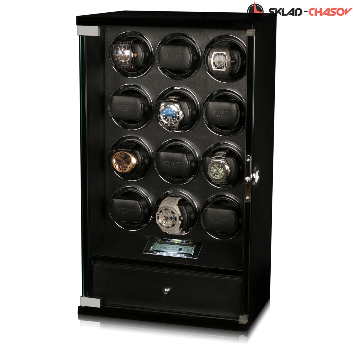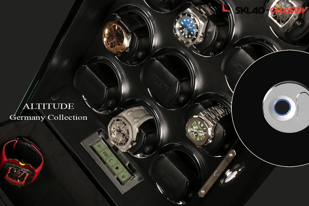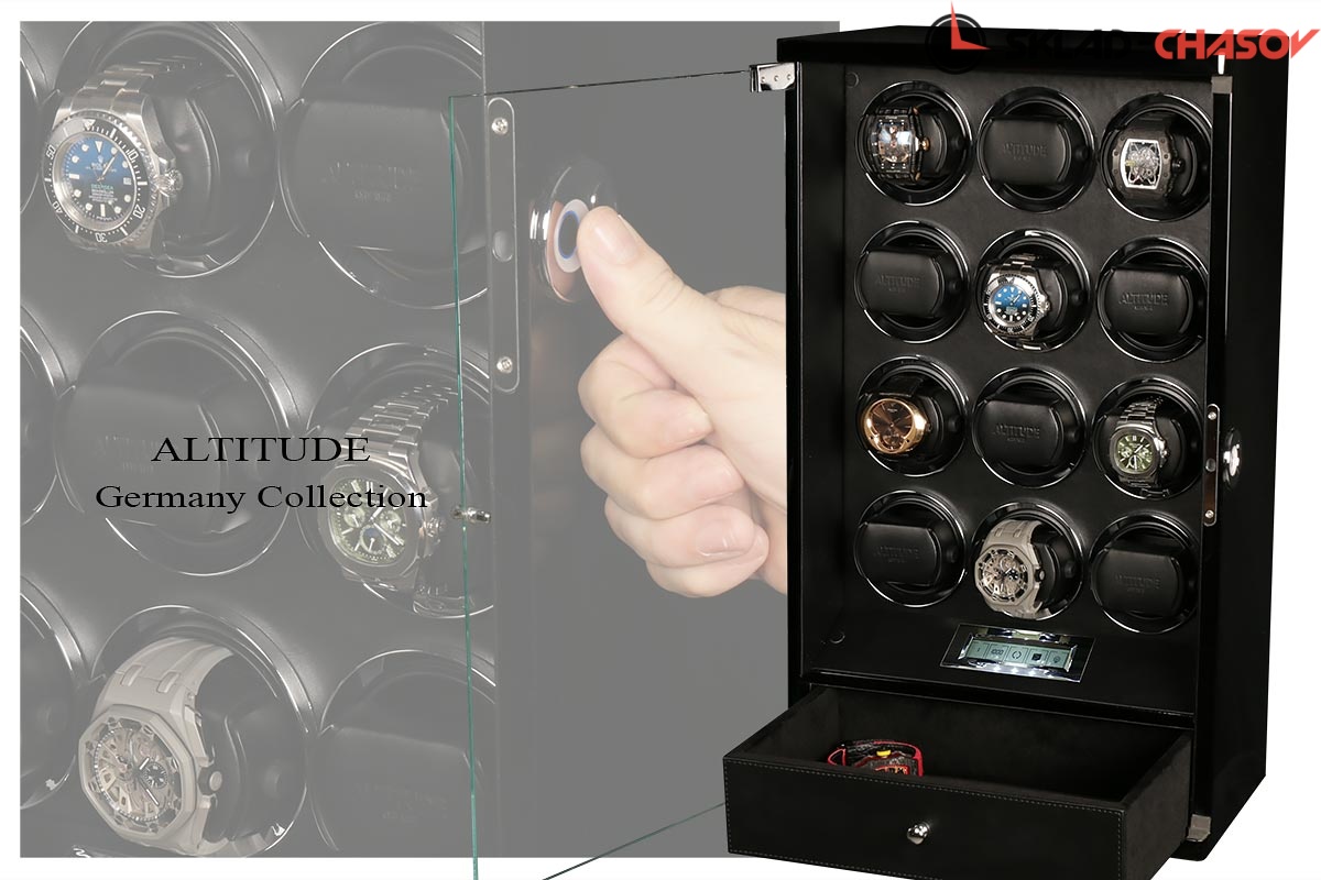 Новая серия шкатулок “ Diamond “. Удобная и популярная на сегодняшний день система открывания с помощью отпечатка пальца . Черное дерево «венге» покрыто 15 слоями рояльного лака, натуральное стекло, внутри прошито чёрной кожей, есть удобный, большой отсек для свободного хранения ваших ценностей, тачскрин позволяет выбрать нужные для ваших часов регулировки направления вращения (3 варианта) и количество оборотов в сутки (600/750/100/1800). Подзавод 12 часов, каждого звена отдельно. Система автостоп - при открытие дверцы моторы останавливаются. Самые удобные держатели для часов, идеальна регулировка под ваше большое или маленькое запястье. Возможность вкл/ выкл на задней части шкатулки.