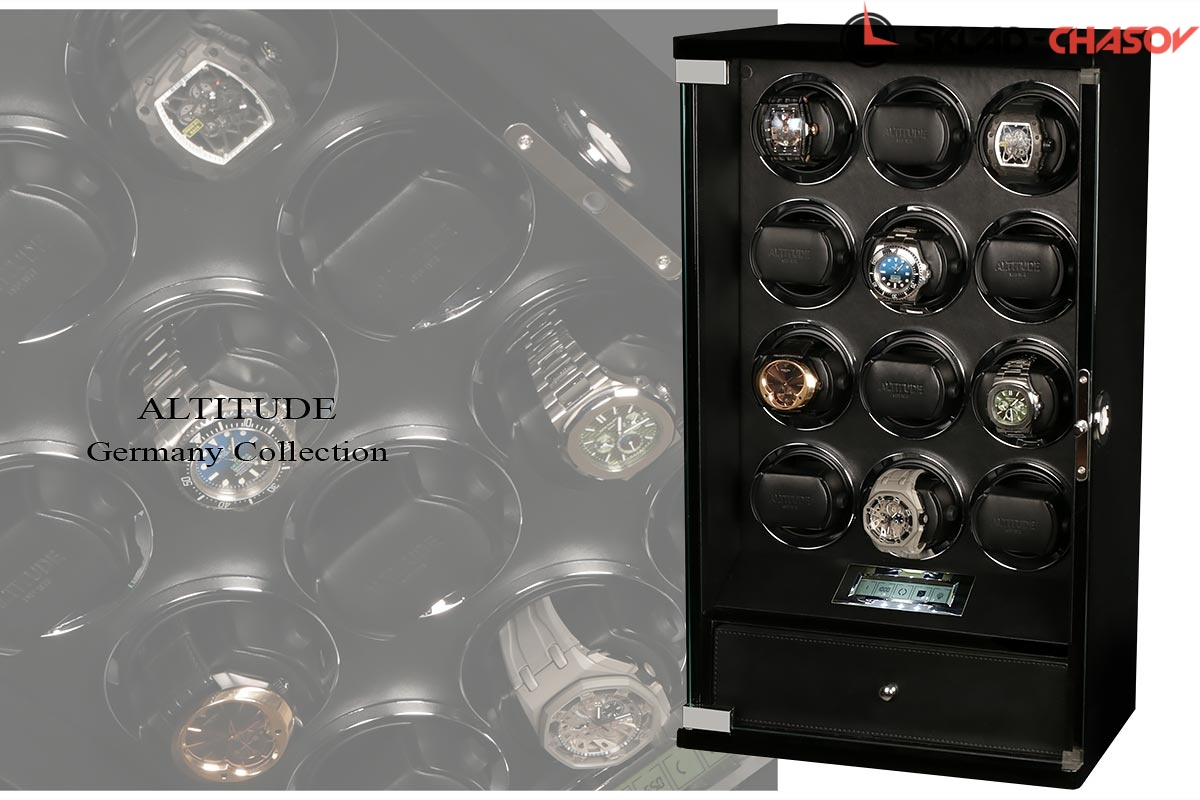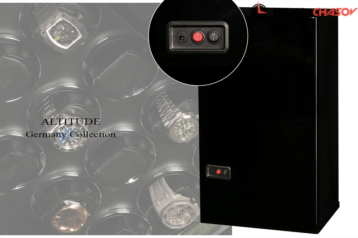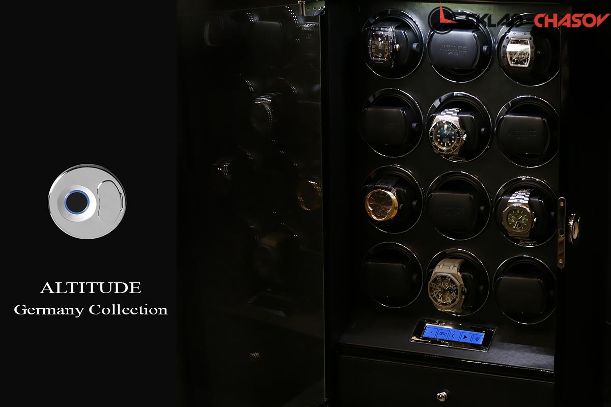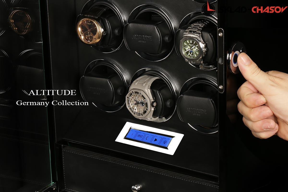 Новая серия шкатулок “ Diamond “. Удобная и популярная на сегодняшний день система открывания с помощью отпечатка пальца . Черное дерево «венге» покрыто 15 слоями рояльного лака, натуральное стекло, внутри прошито чёрной кожей, есть удобный, большой отсек для свободного хранения ваших ценностей, тачскрин позволяет выбрать нужные для ваших часов регулировки направления вращения (3 варианта) и количество оборотов в сутки (600/750/100/1800). Подзавод 12 часов, каждого звена отдельно. Система автостоп - при открытие дверцы моторы останавливаются. Самые удобные держатели для часов, идеальна регулировка под ваше большое или маленькое запястье. Возможность вкл/ выкл на задней части шкатулки.
