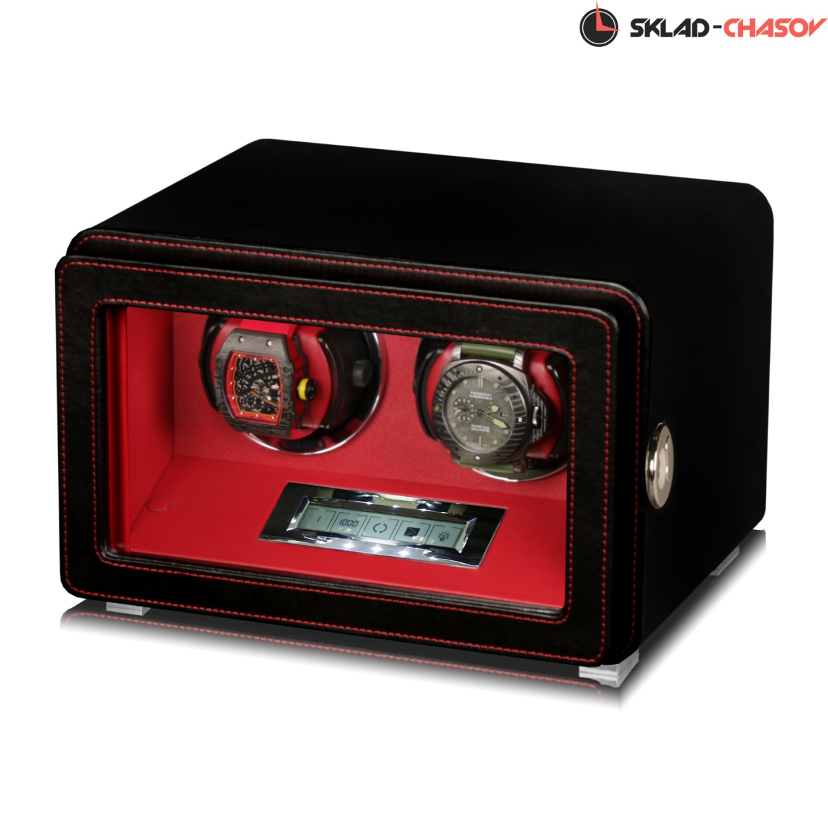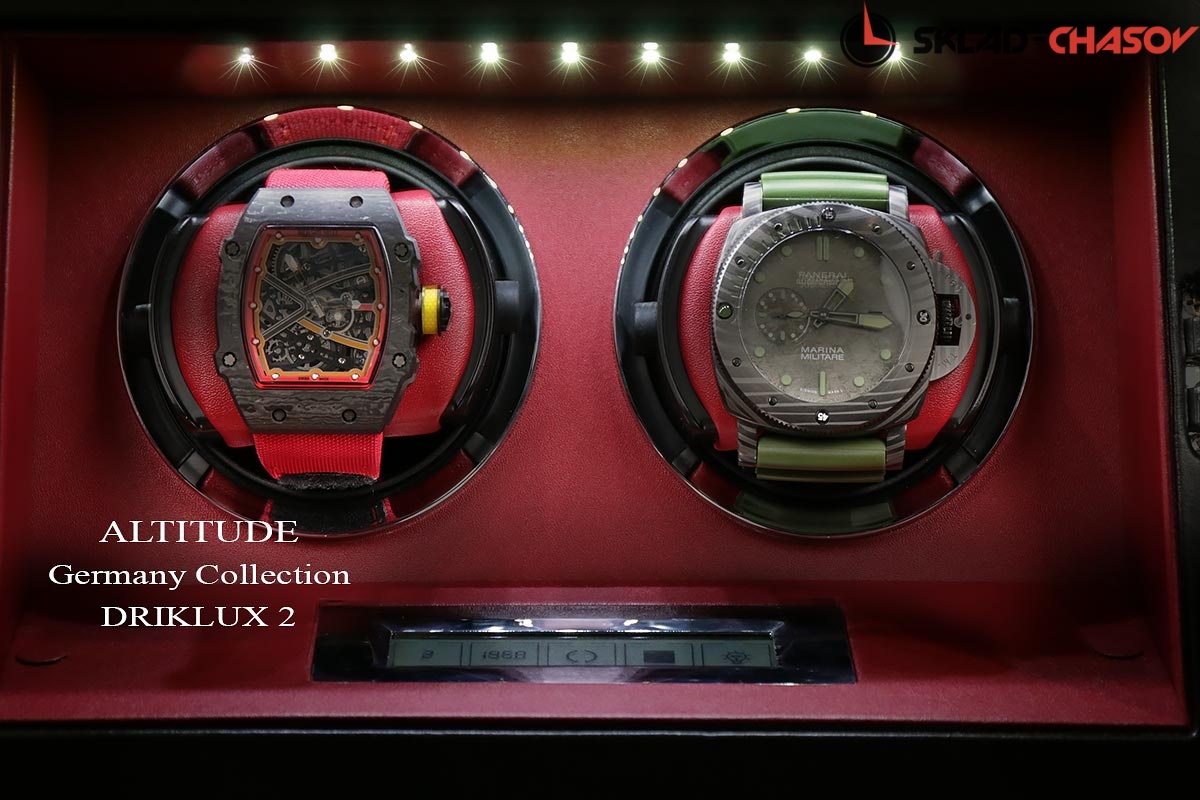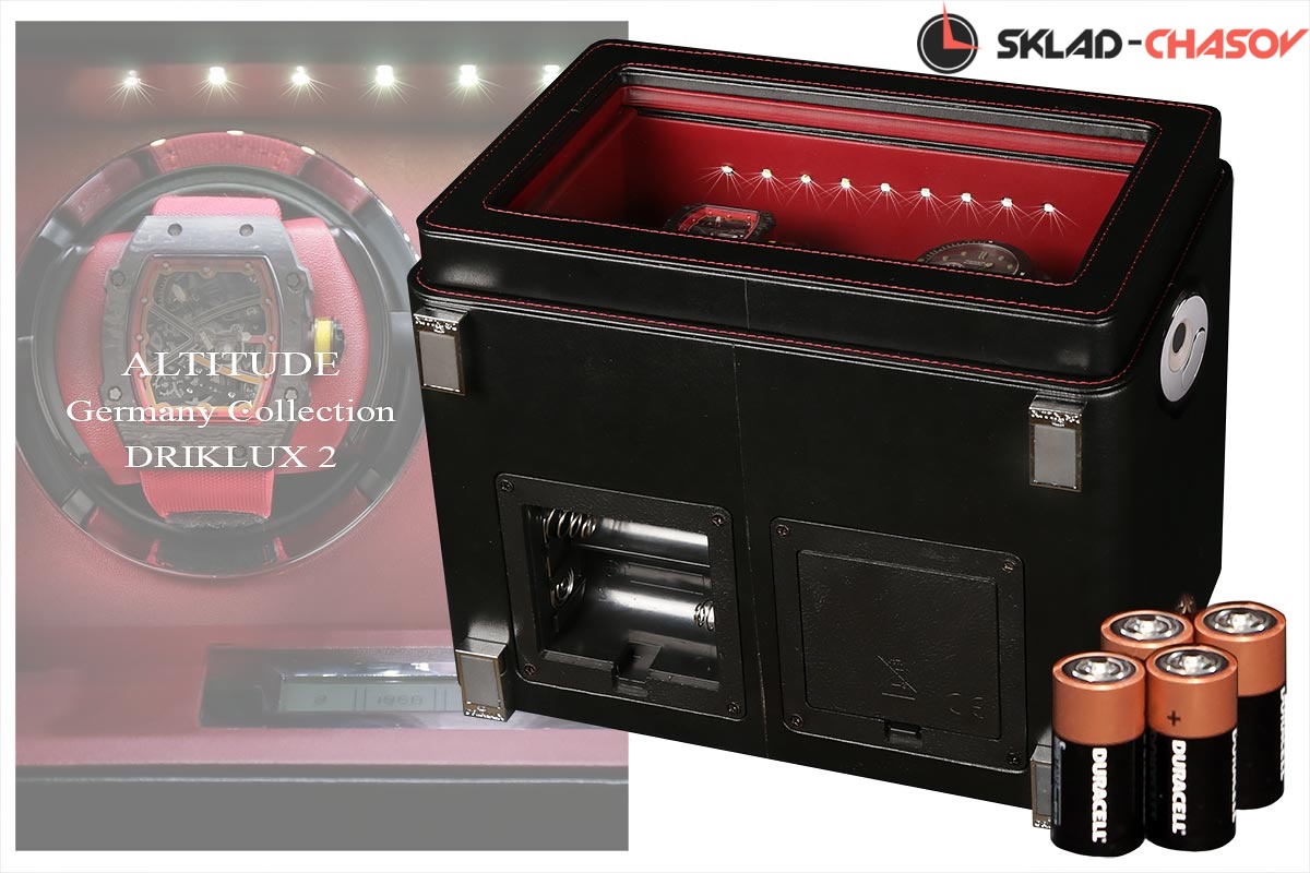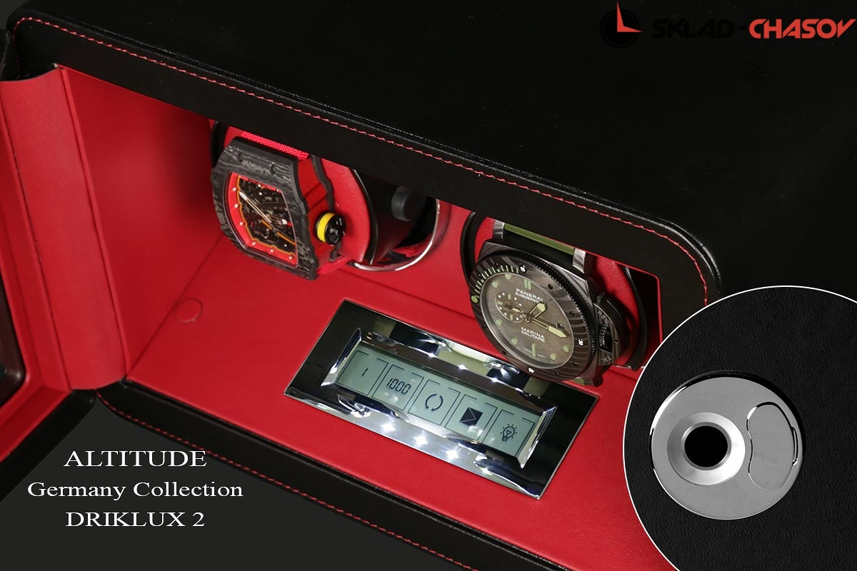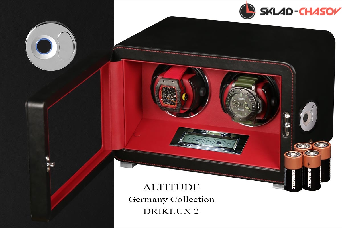 Новинка. Подзавод отдельно для каждых из двух часов. Новая серия шкатулок с отпечатком пальца (память на 5 владельцев и более). серия "Driklux" от немецкого производителя Altitude выполнена из чёрной кожи с красной строчкой, внутри прошито красной кожей с телескопическими держателями (идеально подходящих для больших и малых запястьев), работает от сети 220 вольт или четырёх батареек класса D. Светодиодная подсветка, металлизированные фирменные ножки, система автостоп при открытии дверцы. Регулируется направления вращения в трёх вариантах и количество оборотов в сутки 600/750/1000/1800.