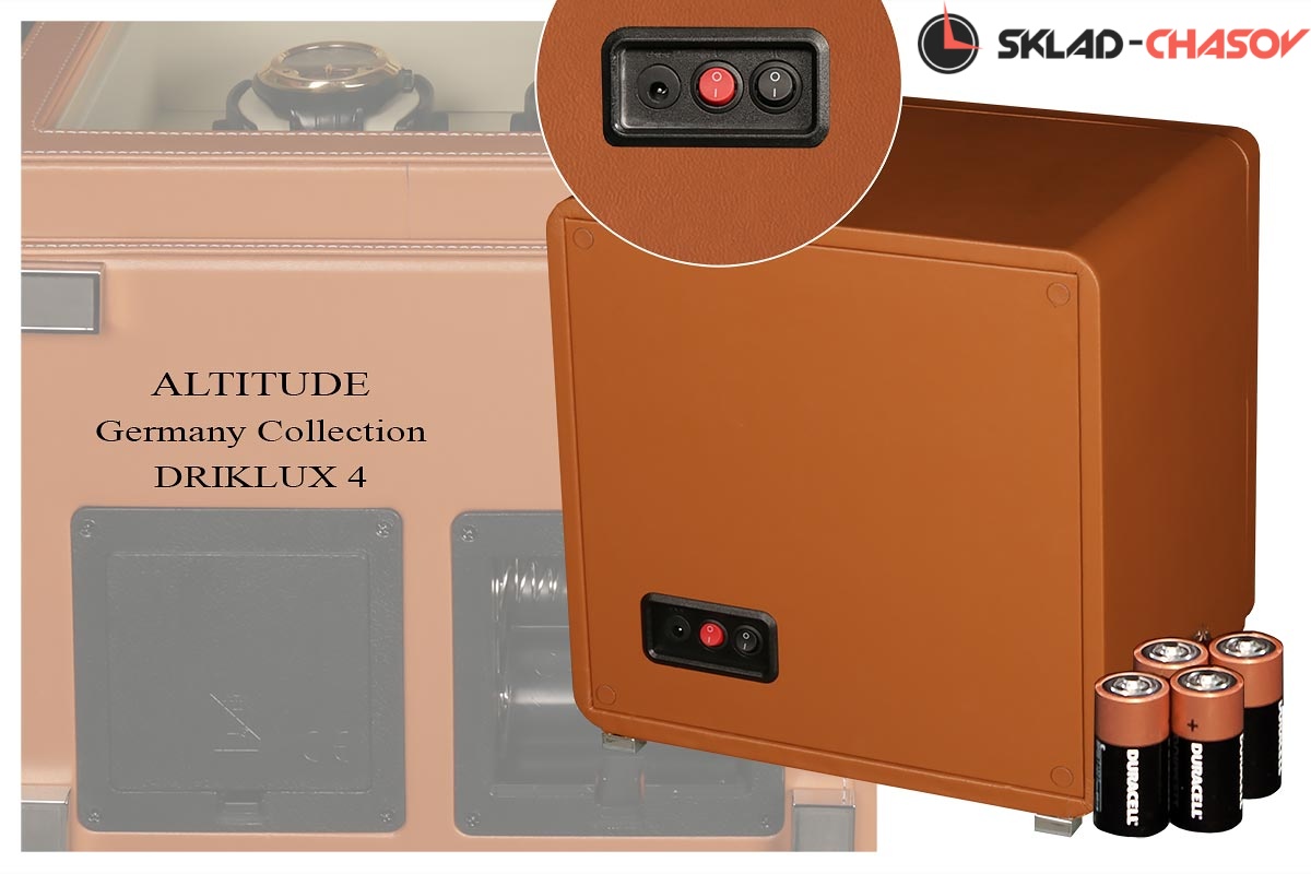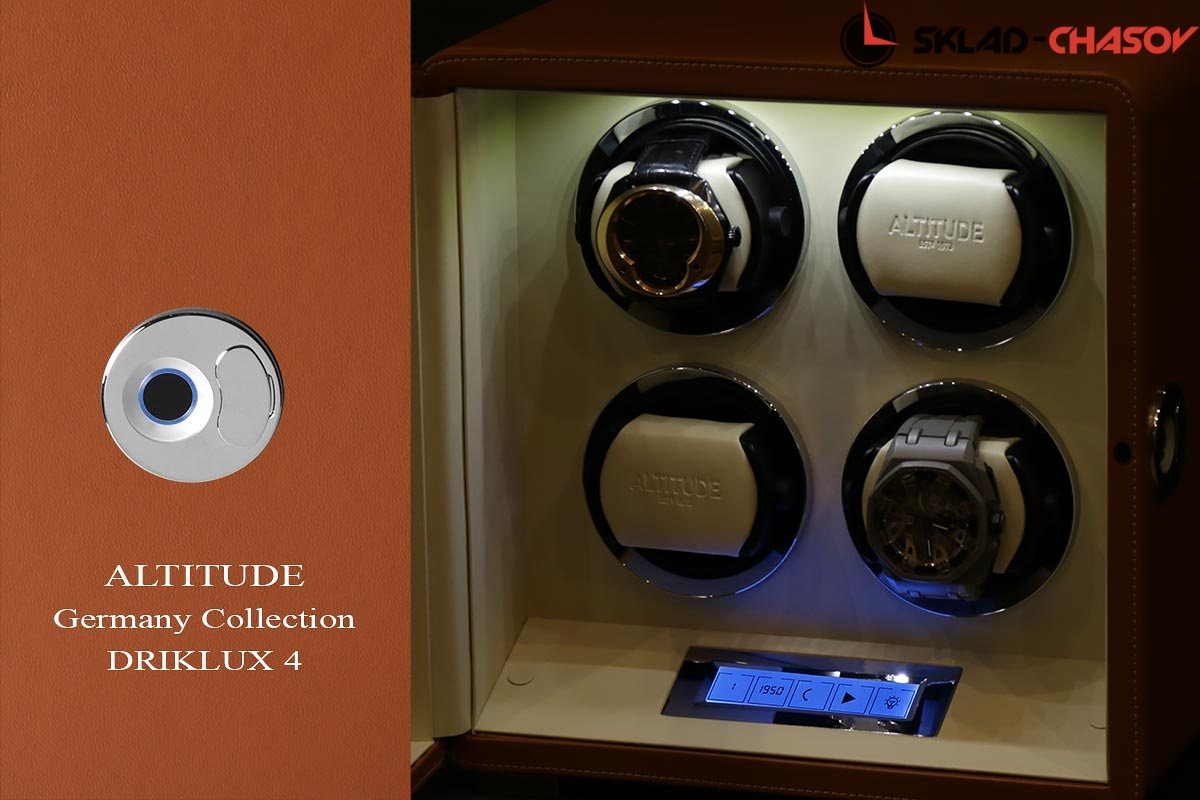 Подзавод отдельно для каждых из четырёх часов. Новая серия шкатулок с отпечатком пальца (память на 5 владельцев) серия "Driklux" от немецкого производителя Altitude выполнена из коричневой кожи с белой строчкой, внутри прошито белой кожей с телескопическими держателями (идеально подходящих для больших и малых запястье), работает от сети 220 вольт или четырёх батареек класса D. Светодиодная подсветка, металлизированные фирменные ножки, система автостоп при открытии дверцы. Регулируется направления вращения в трёх вариантах и количество оборотов в сутки 600/750/1000/1800.