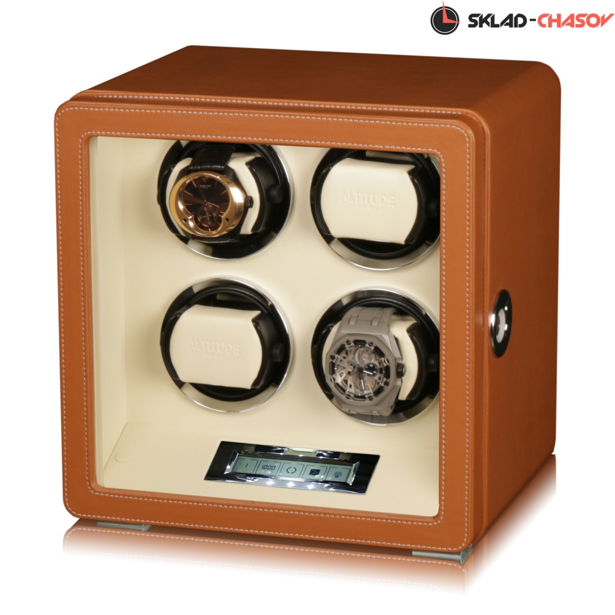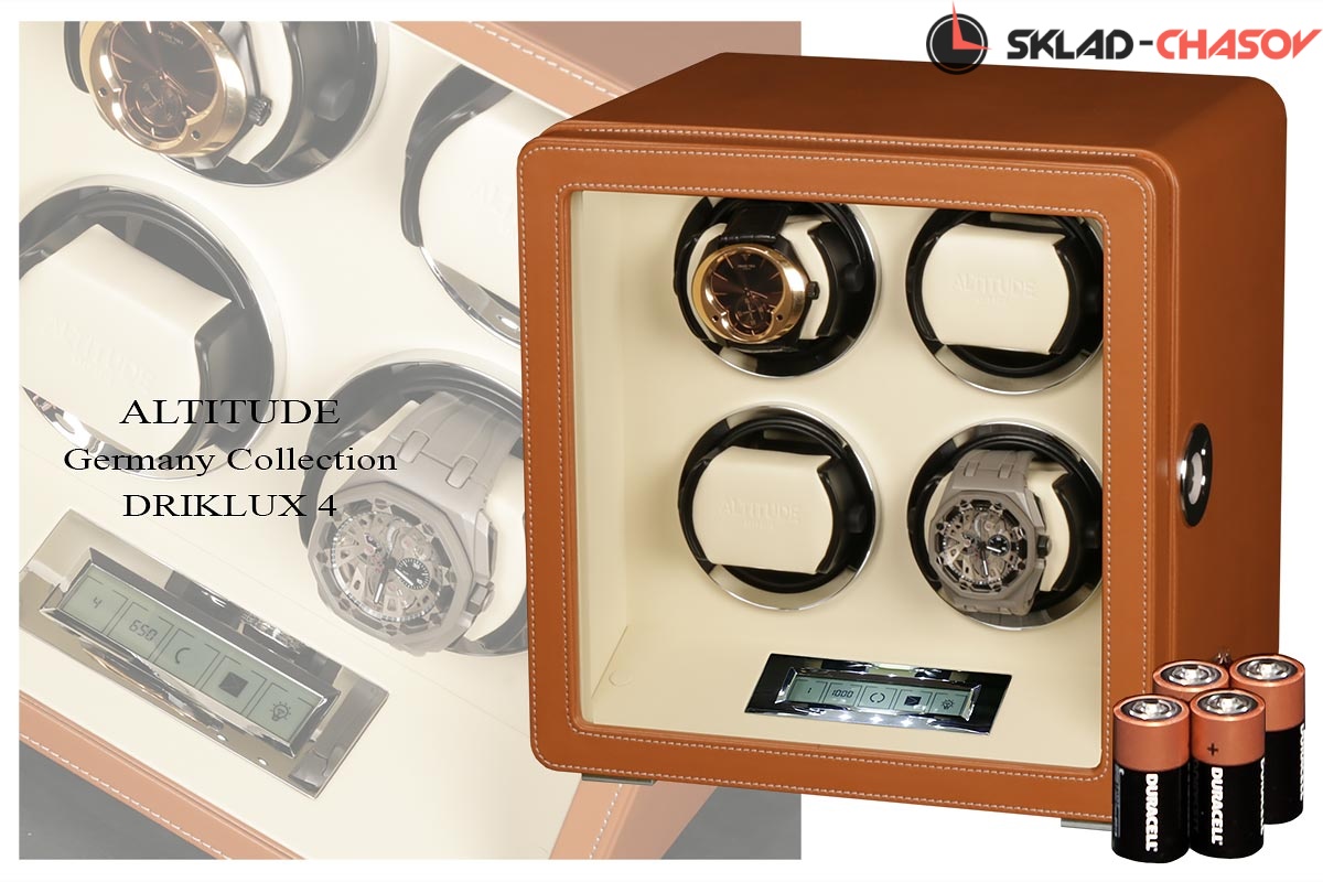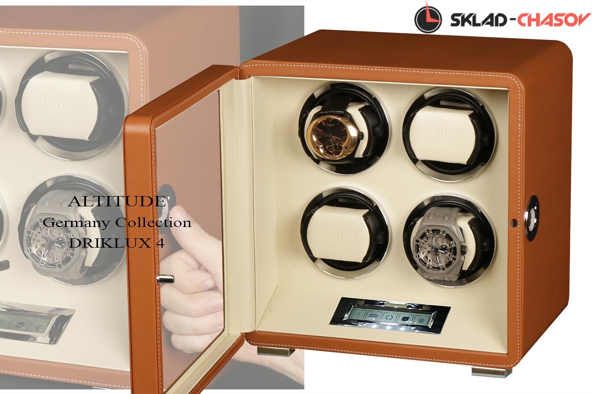 Подзавод отдельно для каждых из четырёх часов. Новая серия шкатулок с отпечатком пальца (память на 5 владельцев) серия "Driklux" от немецкого производителя Altitude выполнена из коричневой кожи с белой строчкой, внутри прошито белой кожей с телескопическими держателями (идеально подходящих для больших и малых запястье), работает от сети 220 вольт или четырёх батареек класса D. Светодиодная подсветка, металлизированные фирменные ножки, система автостоп при открытии дверцы. Регулируется направления вращения в трёх вариантах и количество оборотов в сутки 600/750/1000/1800.