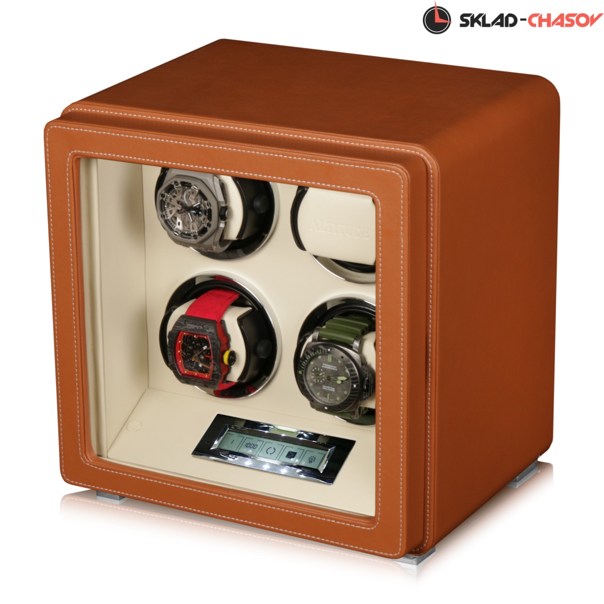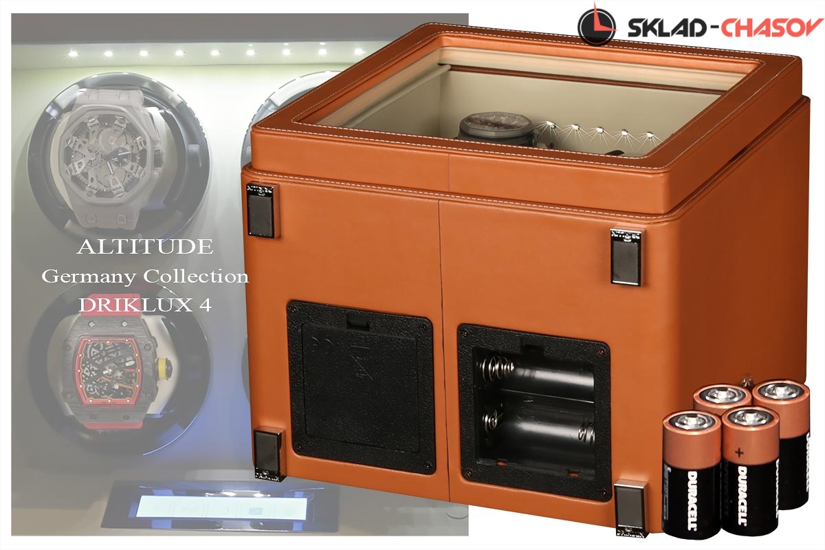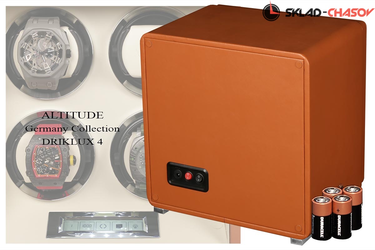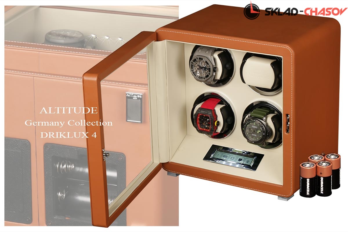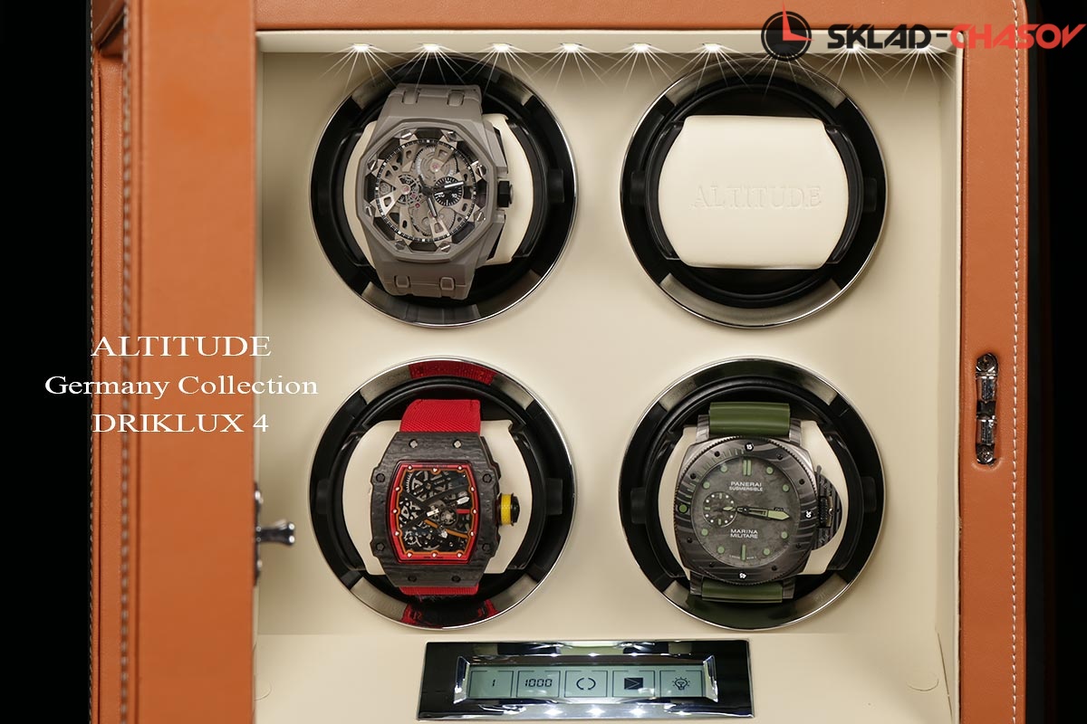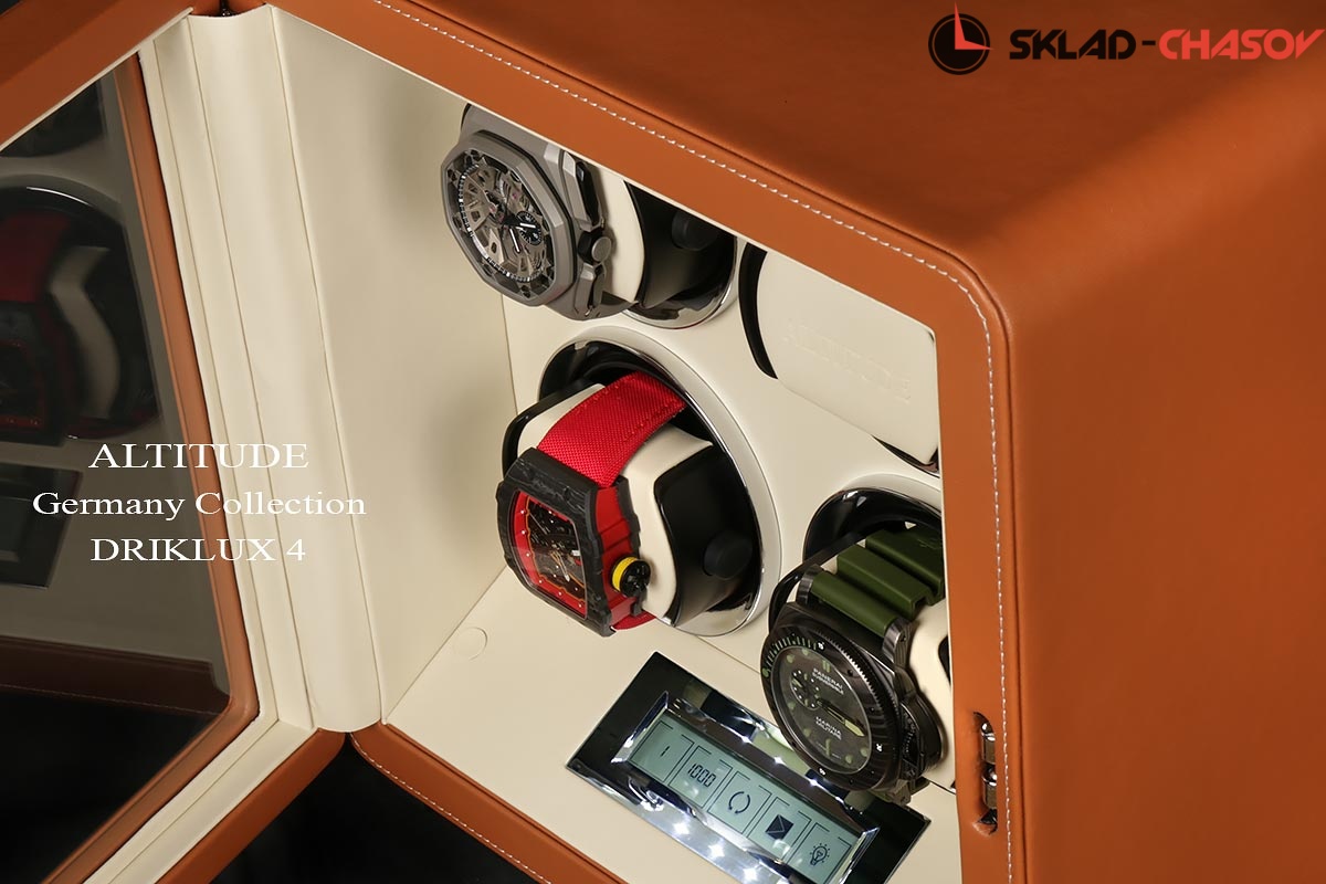Подзавод отдельно для каждых из четырёх часов. Новая серия шкатулок "Driklux" от немецкого производителя Altitude выполнена из коричневой кожи с белой строчкой, внутри прошито белой кожей с телескопическими держателями, работает от сети 220 вольт или четырёх батареек. Светодиодная подсветка, металлизированные фирменные ножки, система автостоп при открытии дверцы. Регулируется направления вращения в трёх вариантах и количество оборотов в сутки 600/750/1000/1800.