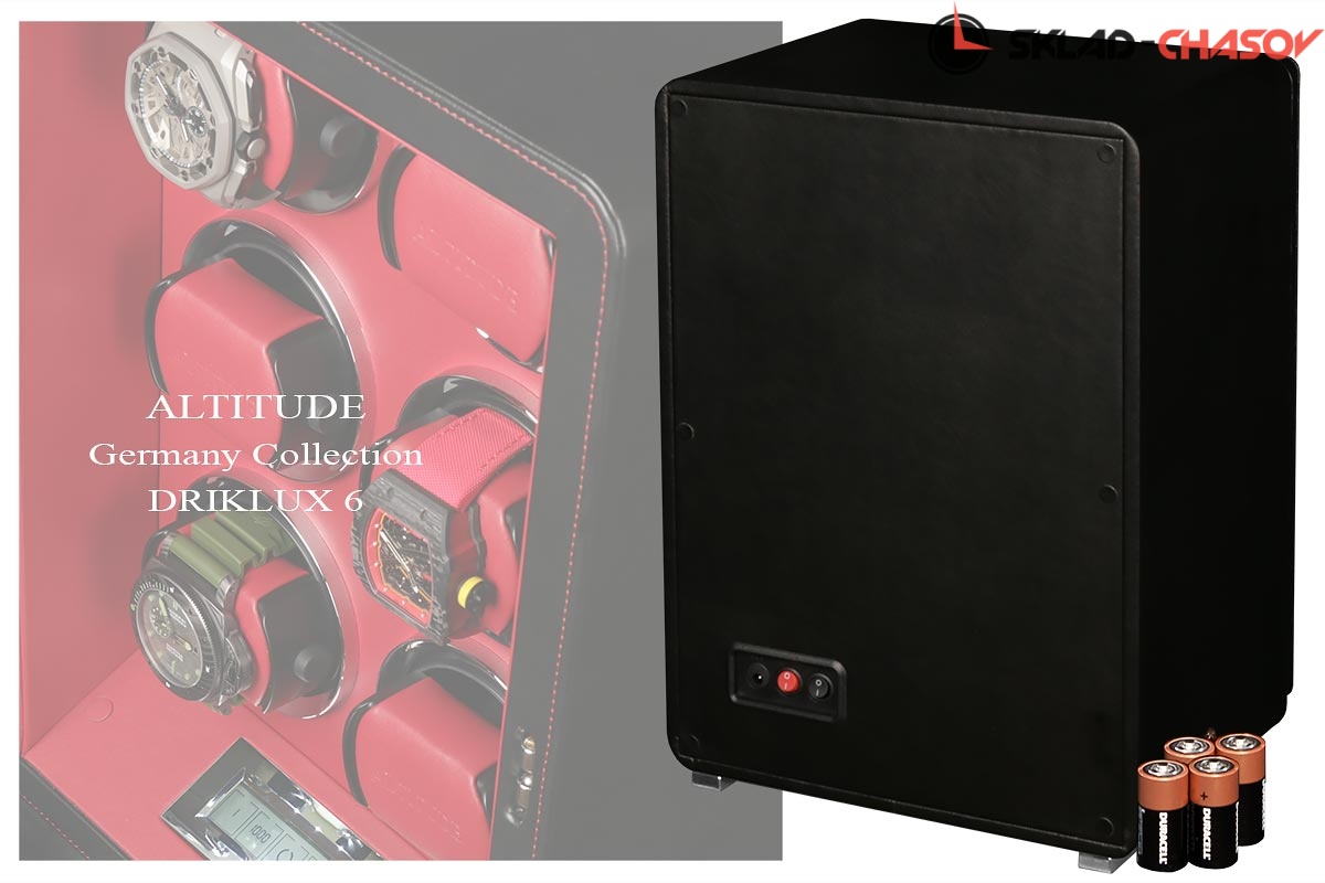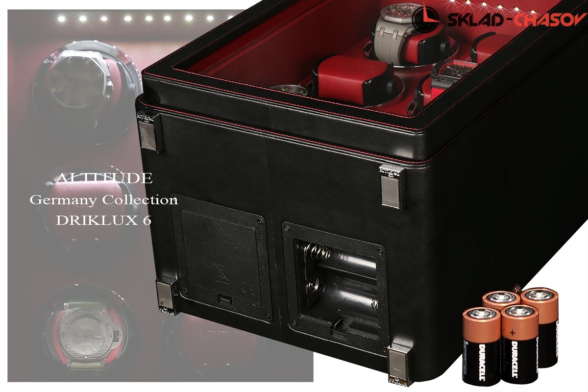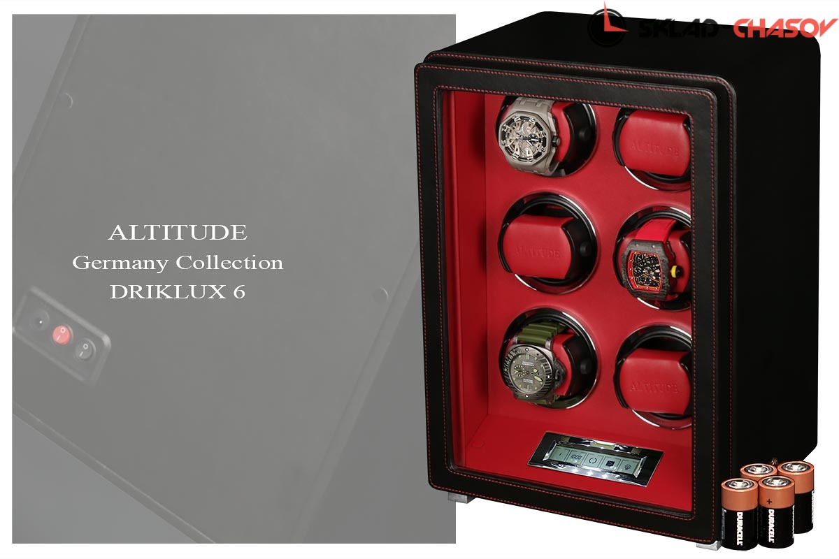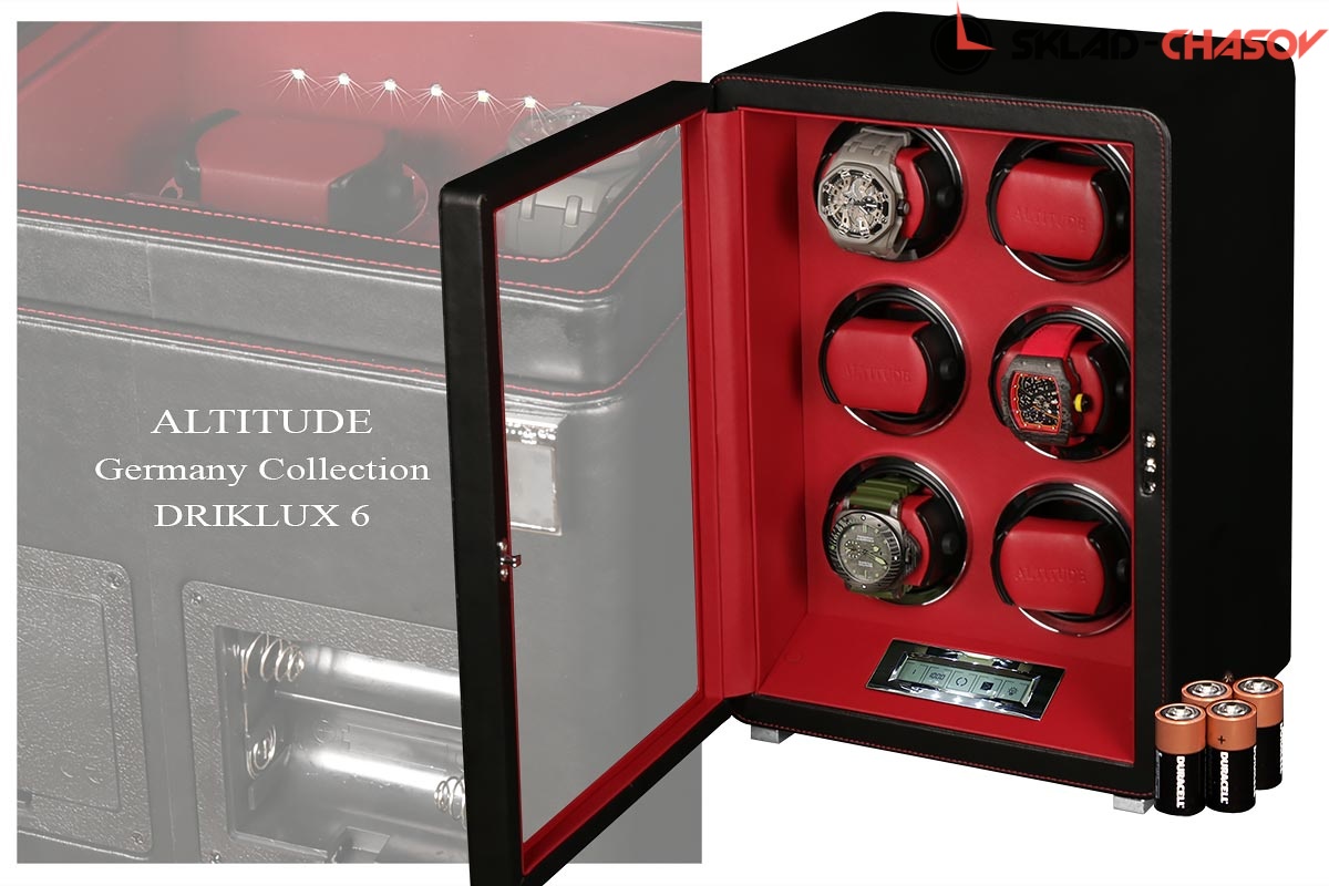 Новая серия шкатулок от немецкого производителя Altitude выполнена из чёрной кожи с красной строчкой, внутри прошито красной кожей с телескопическими держателями, работает от сети 220 вольт или двух батареек. Светодиодная подсветка, металлизированные фирменные ножки, система автостоп при открытии дверцы. Все возможные регулировки направления вращения и количества оборотов в сутки выполняется с помощью нового электронного табло.