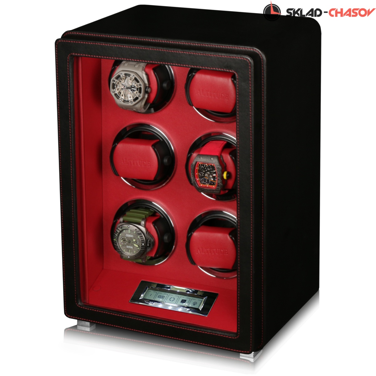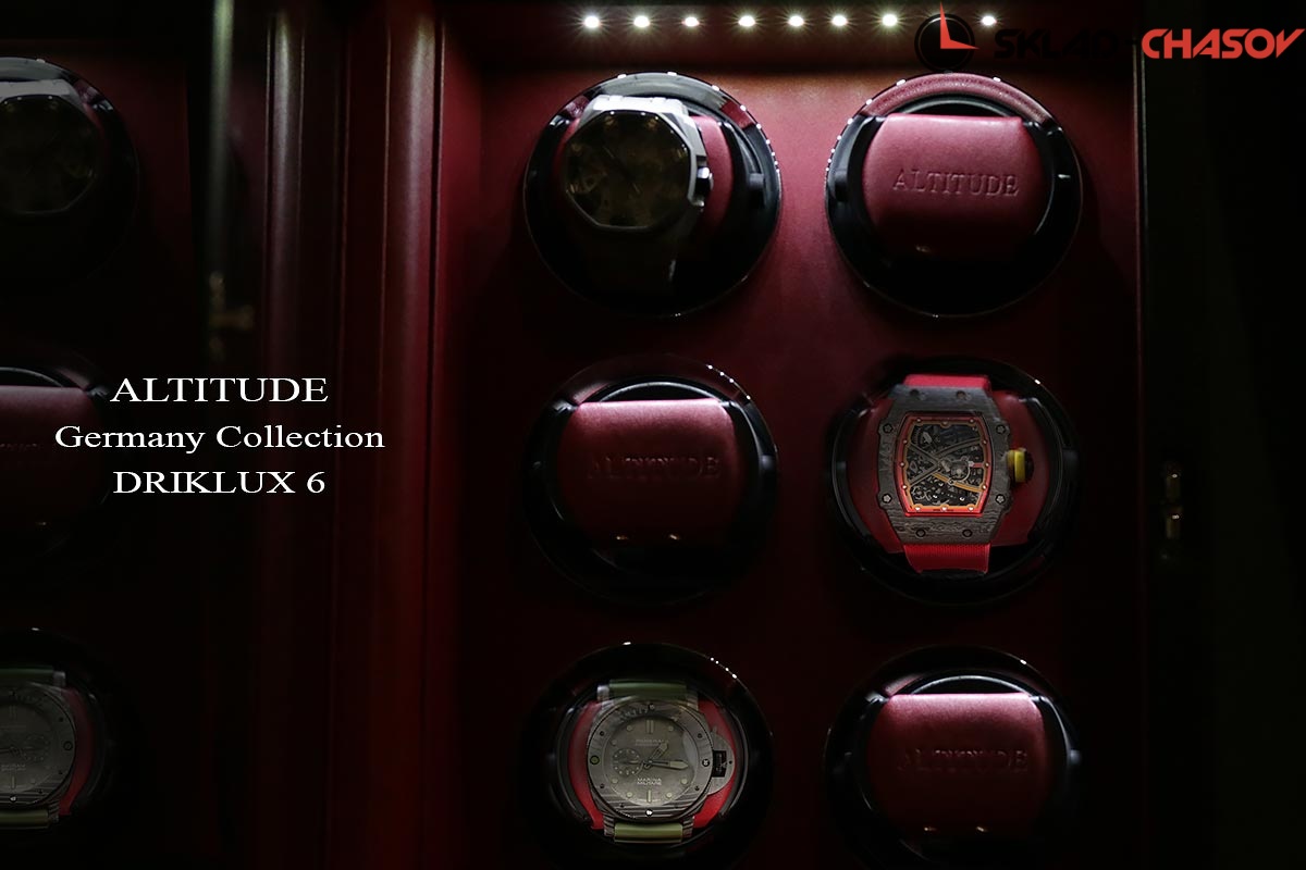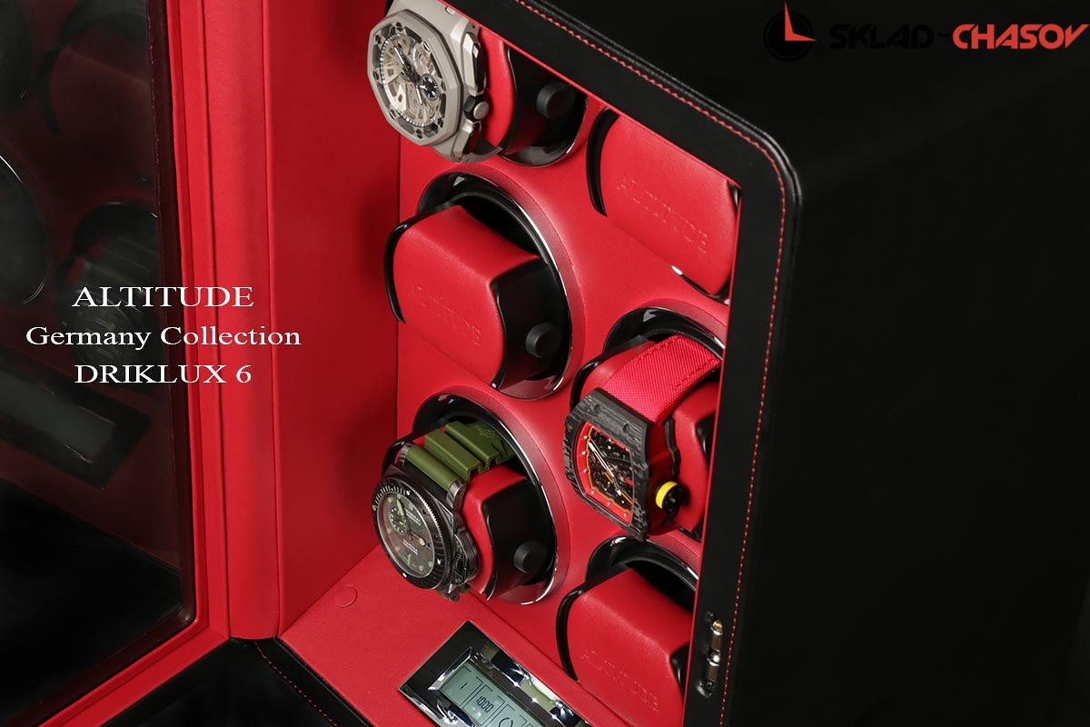 Новая серия шкатулок от немецкого производителя Altitude выполнена из чёрной кожи с красной строчкой, внутри прошито красной кожей с телескопическими держателями, работает от сети 220 вольт или двух батареек. Светодиодная подсветка, металлизированные фирменные ножки, система автостоп при открытии дверцы. Все возможные регулировки направления вращения и количества оборотов в сутки выполняется с помощью нового электронного табло.
