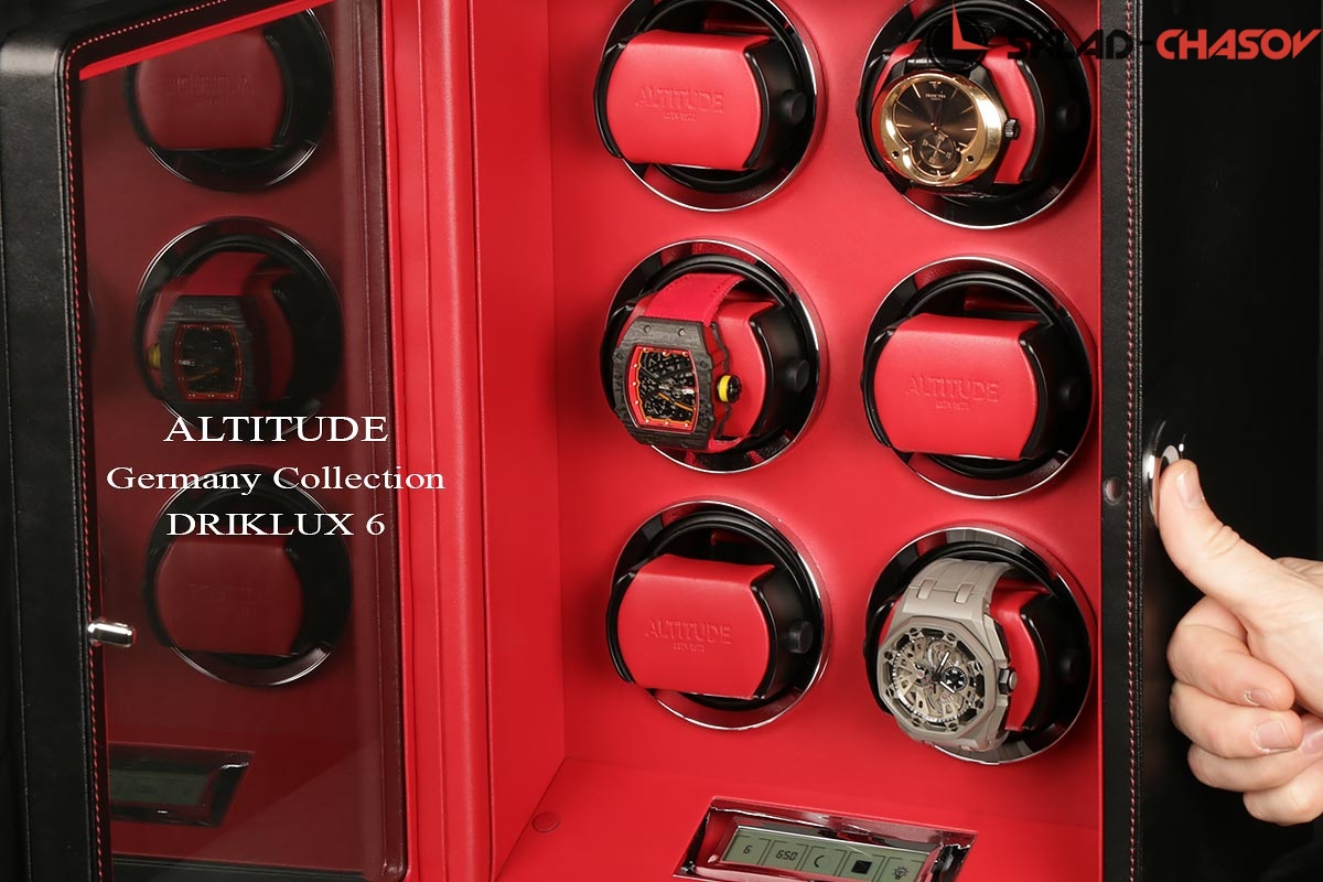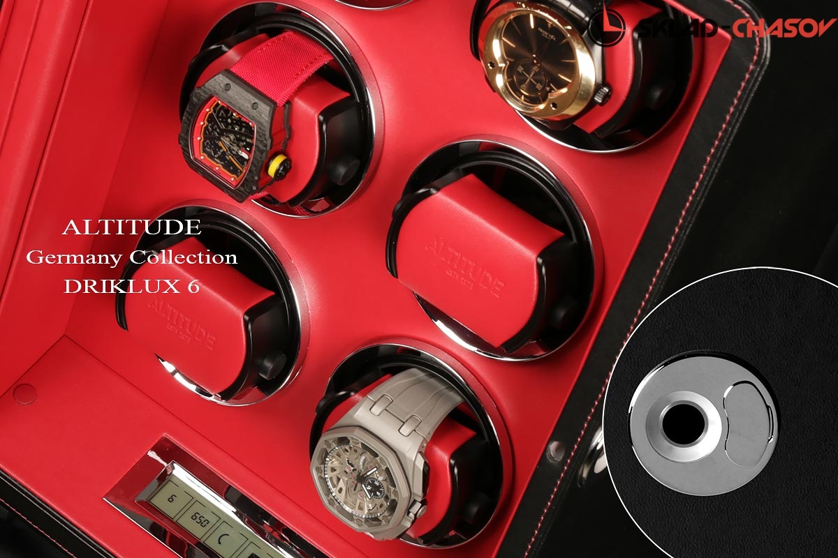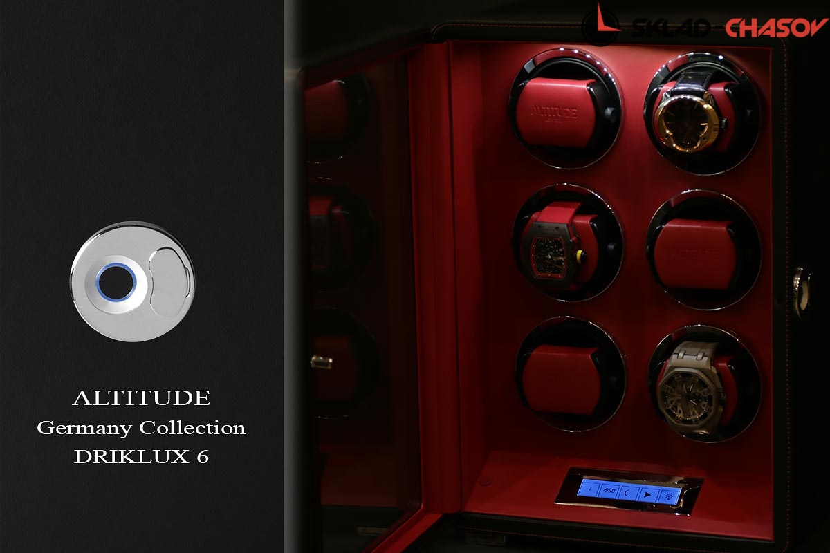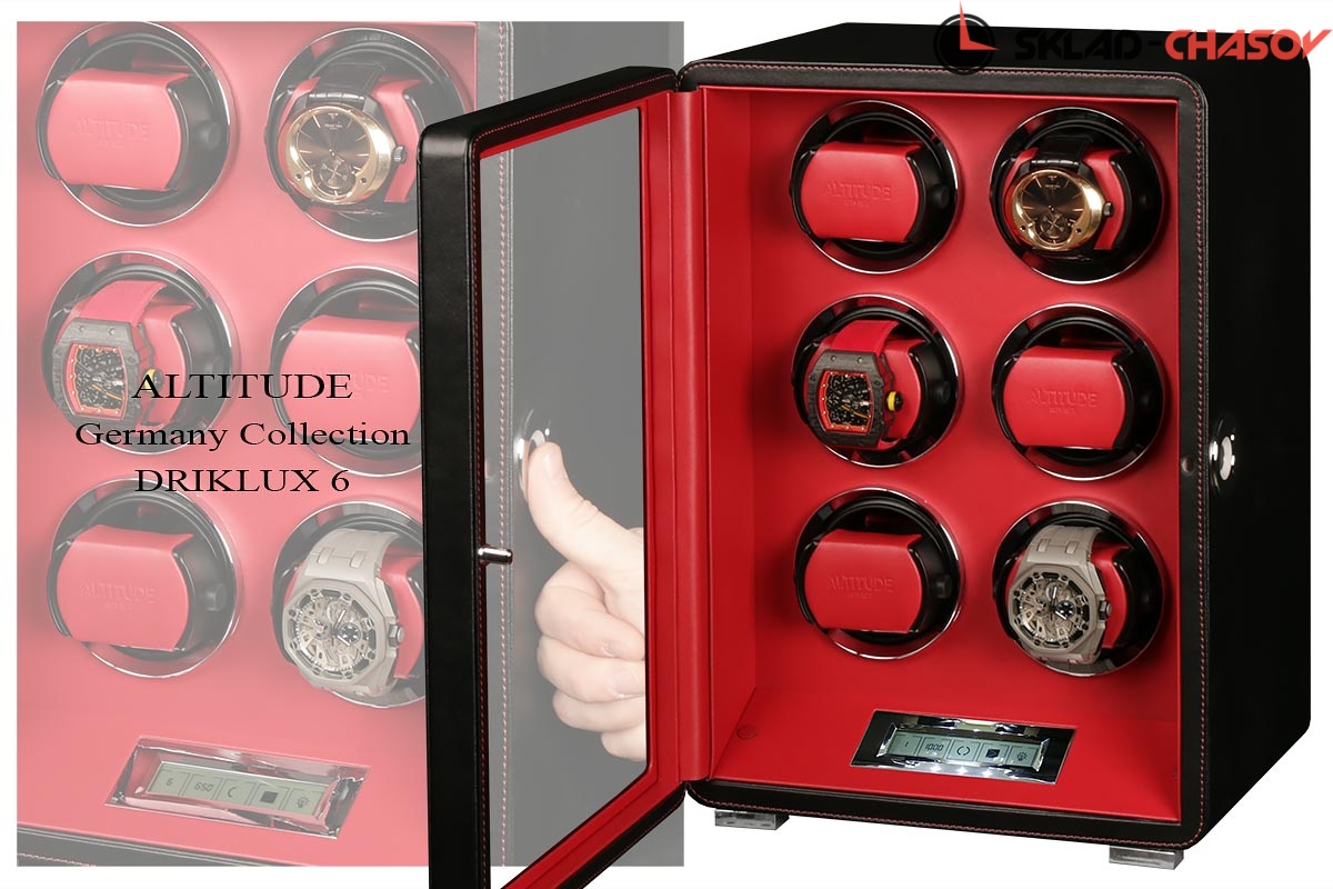 Подзавод отдельно для каждых из шести часов. Новая серия шкатулок с отпечатком пальца (память на 5 владельцев) серия "Driklux" от немецкого производителя Altitude выполнена из чёрной кожи с красной строчкой, внутри прошито красной кожей с телескопическими держателями (идеально подходящих для больших и малых запястьев), работает от сети 220 вольт или четырёх батареек класса D. Светодиодная подсветка, металлизированные фирменные ножки, система автостоп при открытии дверцы. Регулируется направления вращения в трёх вариантах и количество оборотов в сутки 600/750/1000/1800.