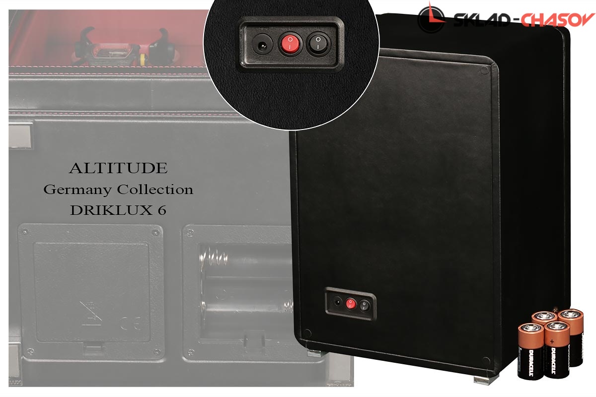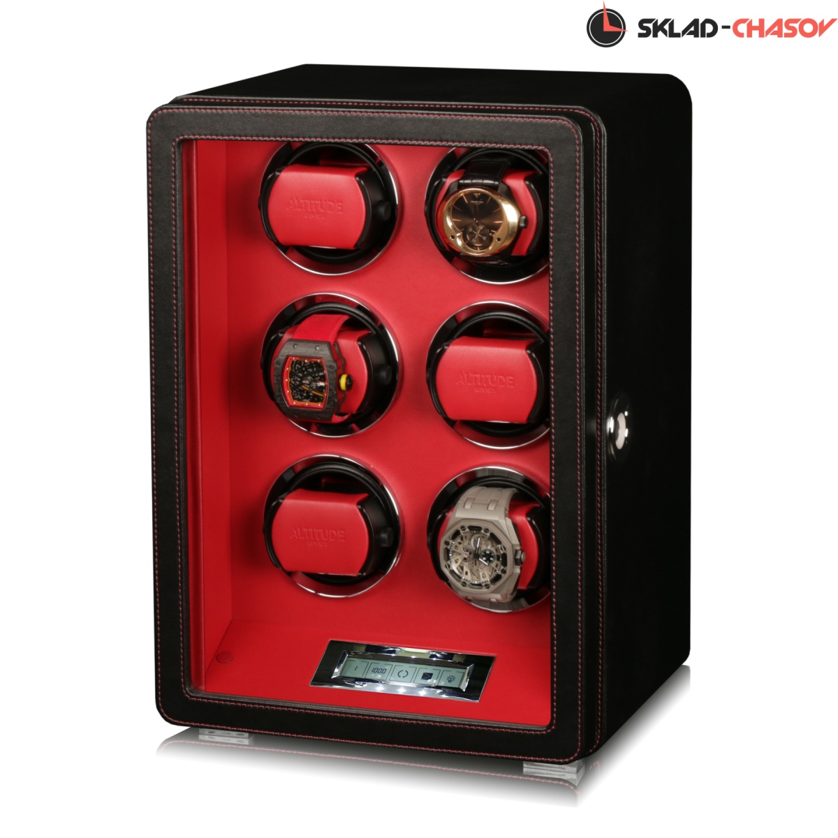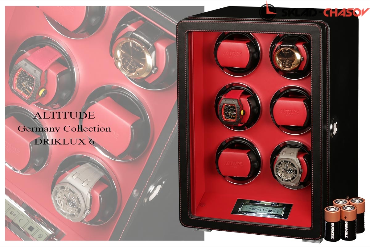 Подзавод отдельно для каждых из шести часов. Новая серия шкатулок с отпечатком пальца (память на 5 владельцев) серия "Driklux" от немецкого производителя Altitude выполнена из чёрной кожи с красной строчкой, внутри прошито красной кожей с телескопическими держателями (идеально подходящих для больших и малых запястьев), работает от сети 220 вольт или четырёх батареек класса D. Светодиодная подсветка, металлизированные фирменные ножки, система автостоп при открытии дверцы. Регулируется направления вращения в трёх вариантах и количество оборотов в сутки 600/750/1000/1800.