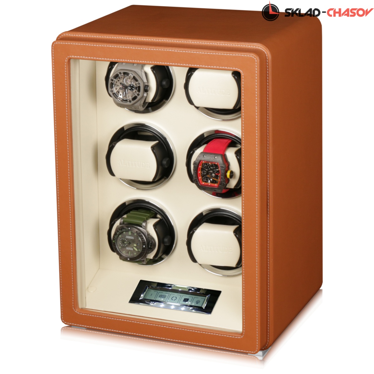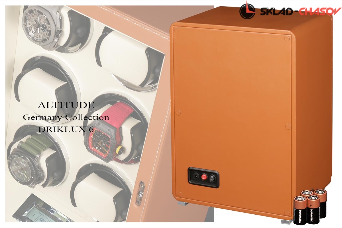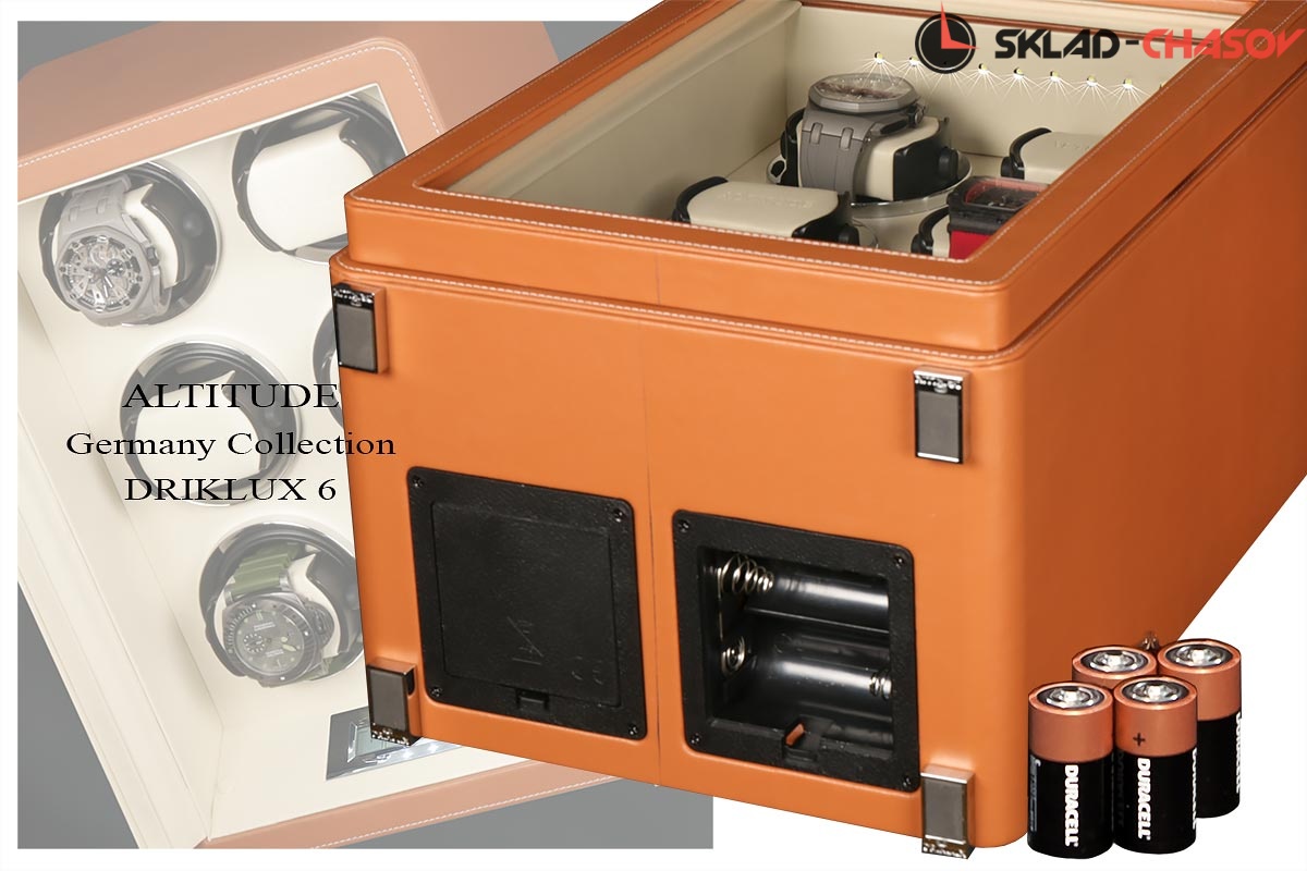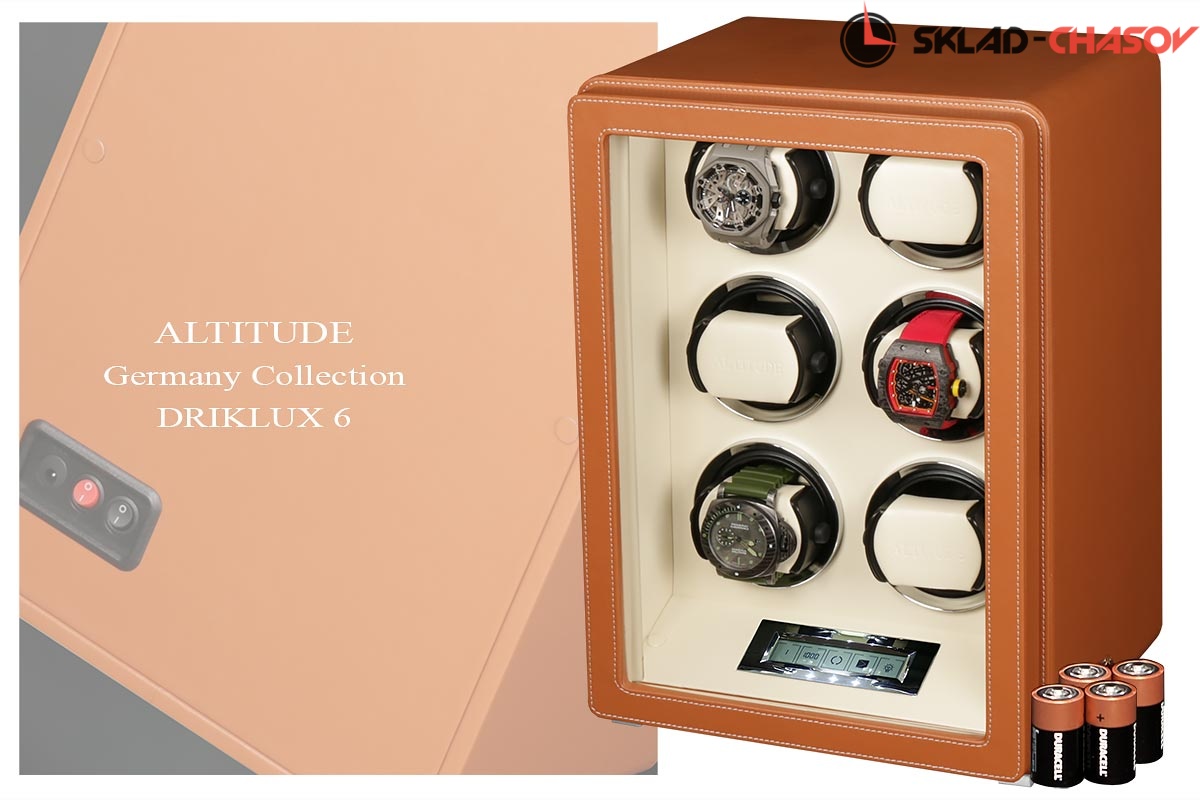 Новая серия шкатулок "Driklux” от немецкого производителя Altitude выполнена из коричневой кожи с белой строчкой, внутри прошито белой кожей с телескопическими держателями, работает от сети 220 вольт или четырех батареек. Светодиодная подсветка, металлизированные фирменные ножки, система автостоп при открытии дверцы. Все возможные регулировки направления вращения и количества оборотов в сутки выполняется с помощью нового электронного табло.